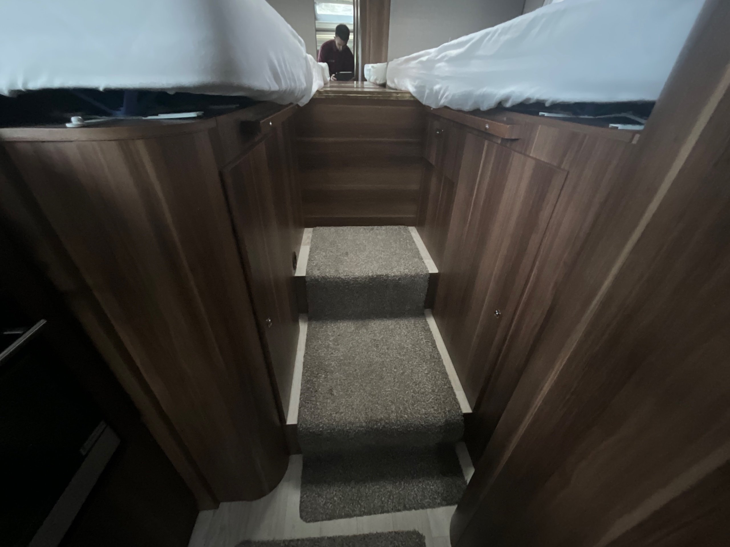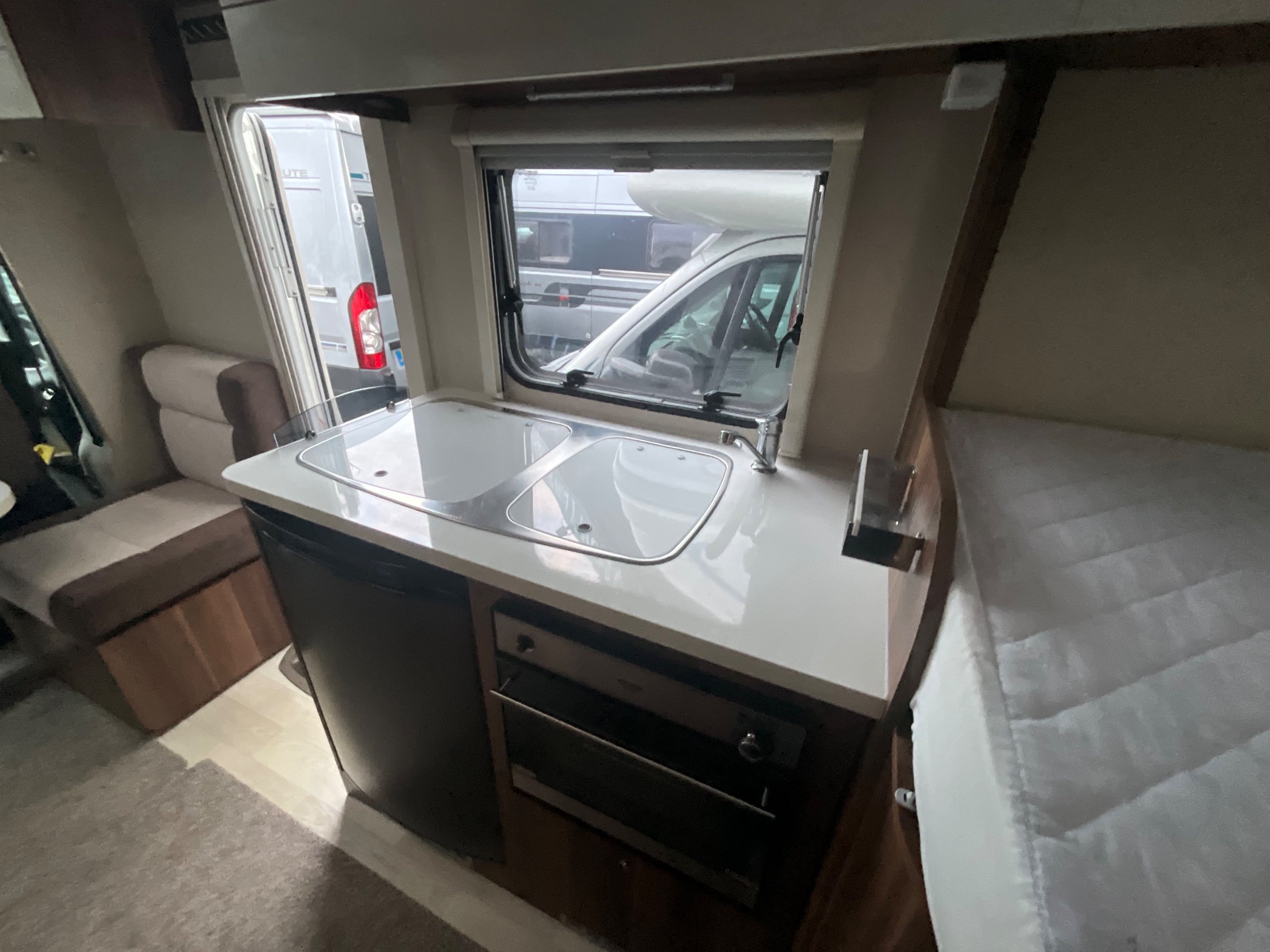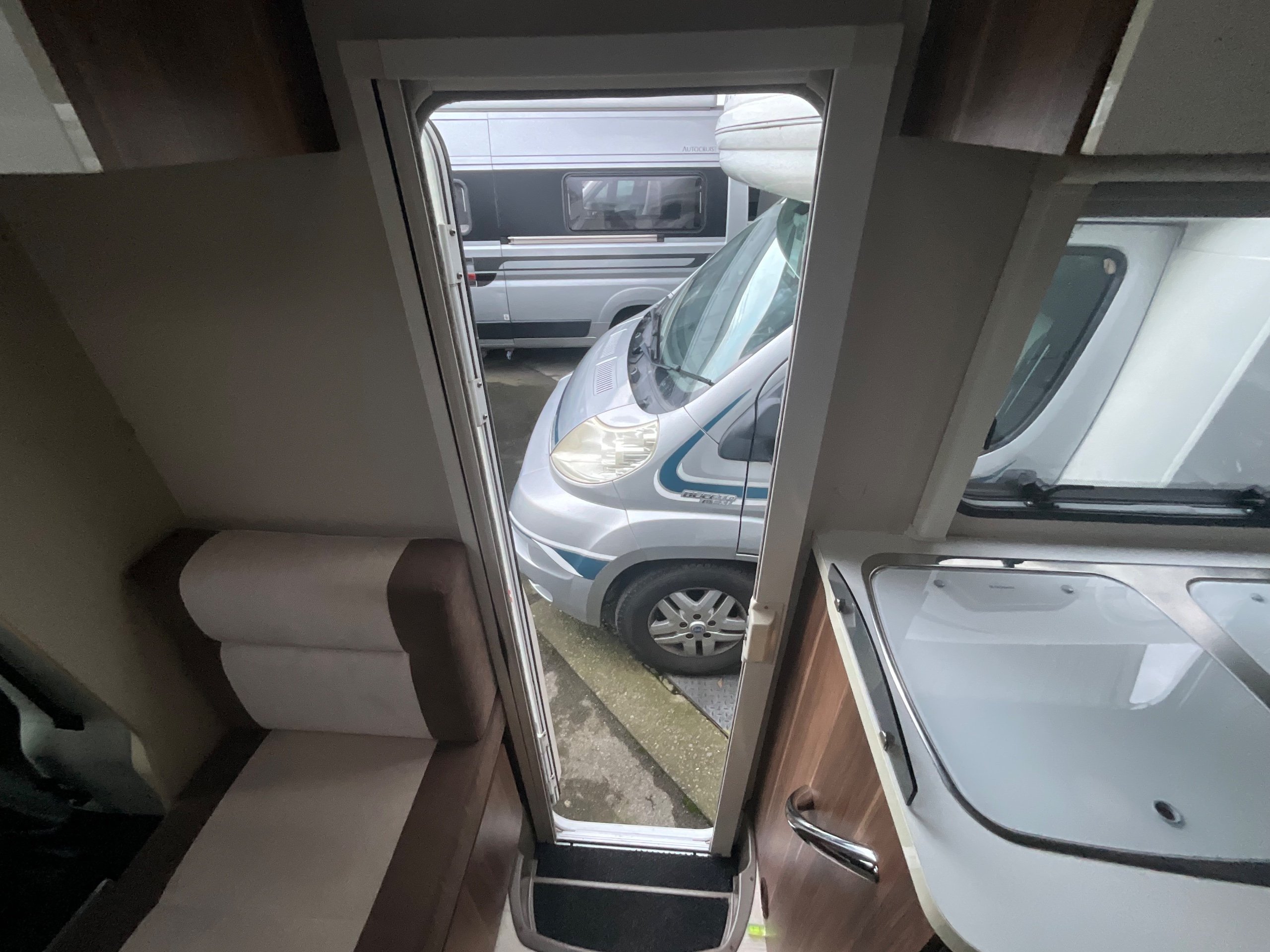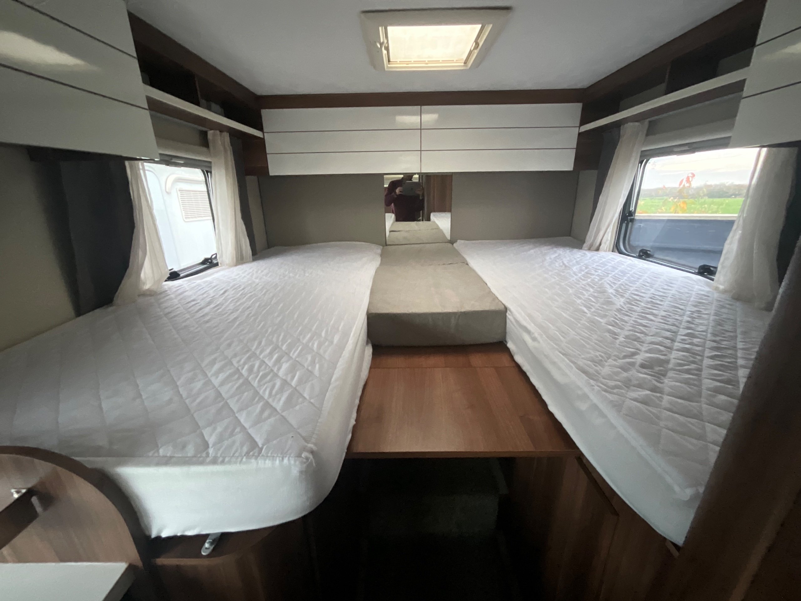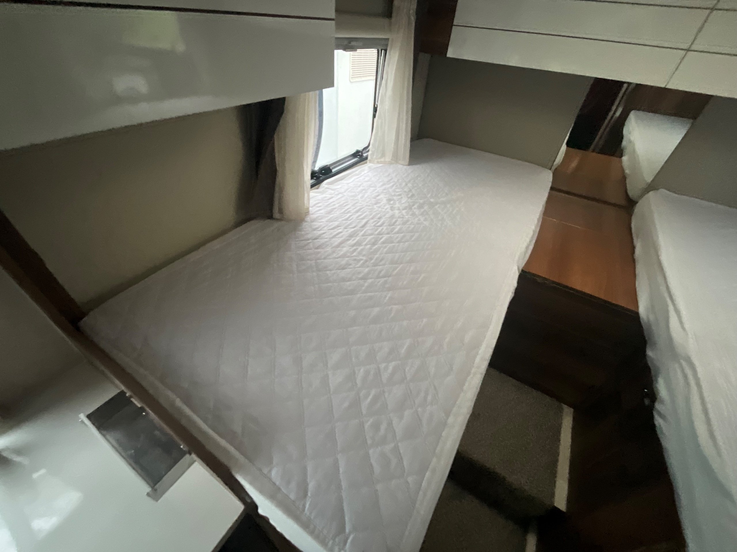 The Rollerteam 685 is a low profile, 4 Berth motorhome with Fixed Rear single Beds (which can form a double bed with the use of extensions and infill cushions) offering plenty of storage underneath the beds themselves, as well as a large garage storage underneath which can be accessed from outside with an external door on both sides. The central seating area offers many flexible options of two travelling seat belts so this Rollerteam can travel with 4 people fully belted in. This can also be a Dinette seating area with the seats (which is where the 2 seat belts are) as well as the small bench seat opposite to use for dinning when parked up with the table having sliding mechanisms to allow it to move when needed. This area can be enhanced further with both front seats having swivelling mechanisms to enlarge the seating area for dinning. Above the cab area is extra storage.