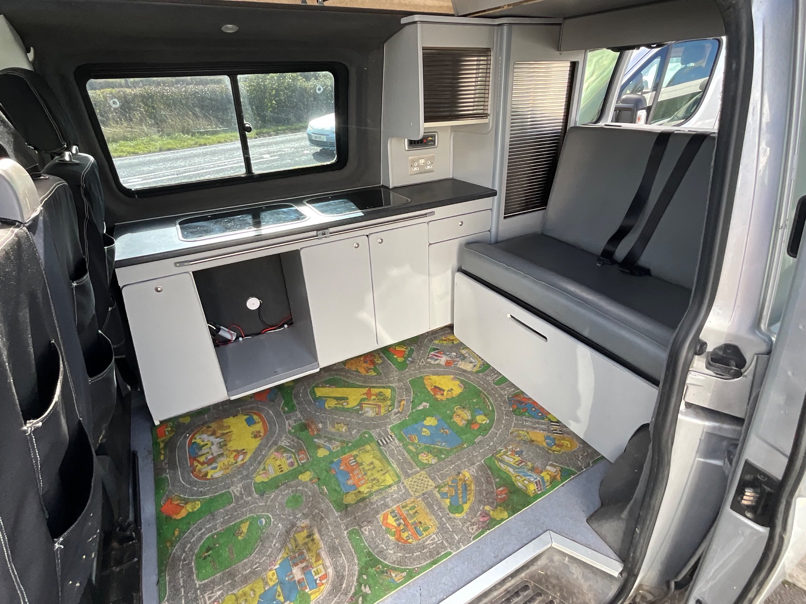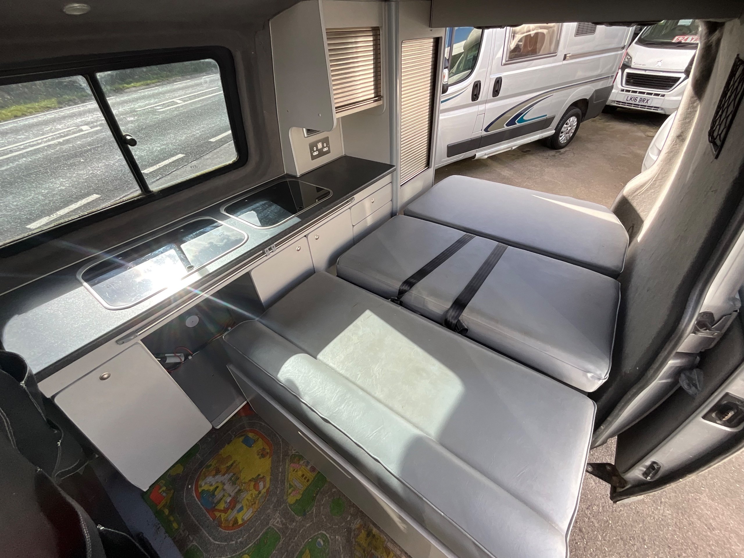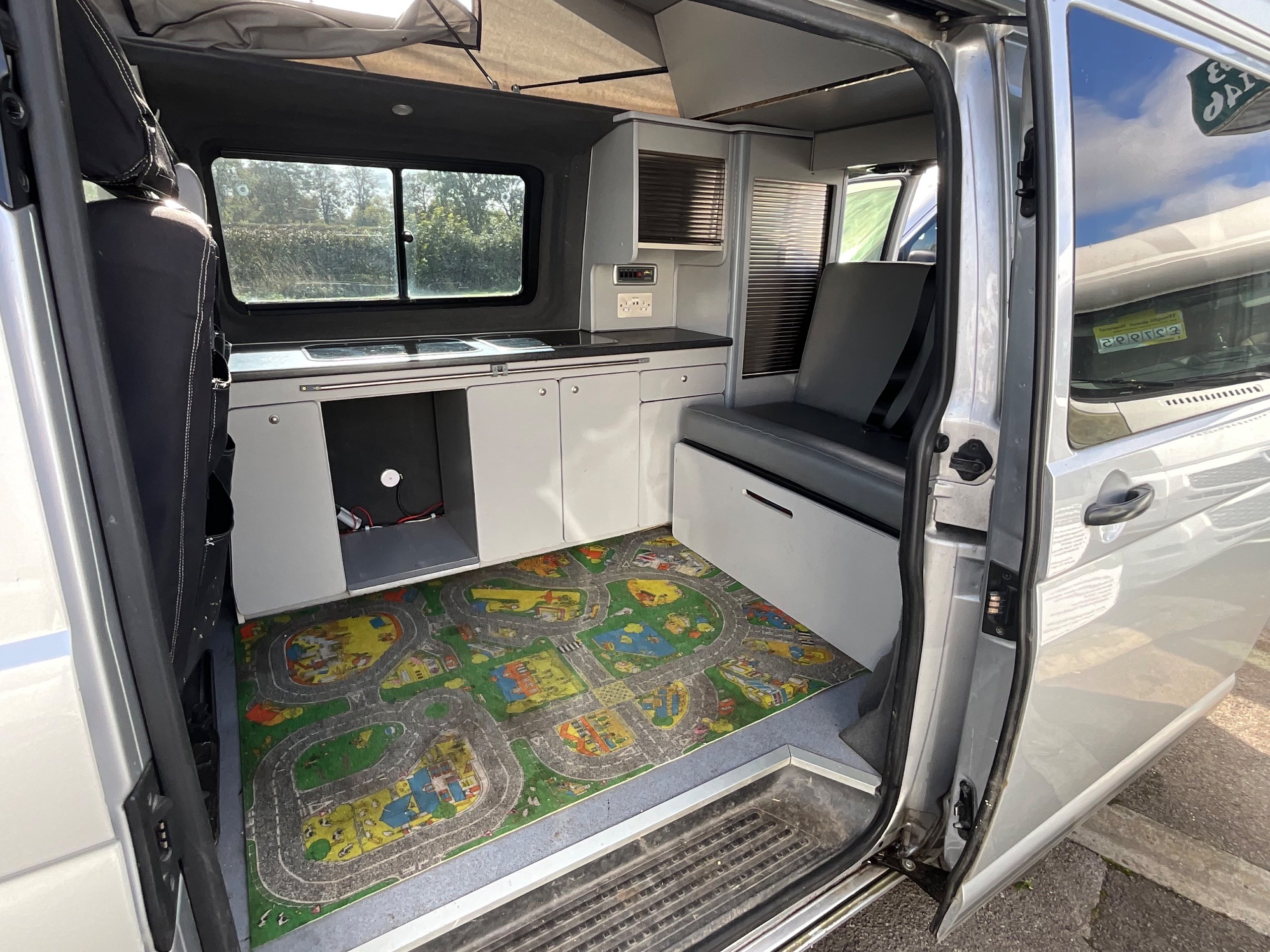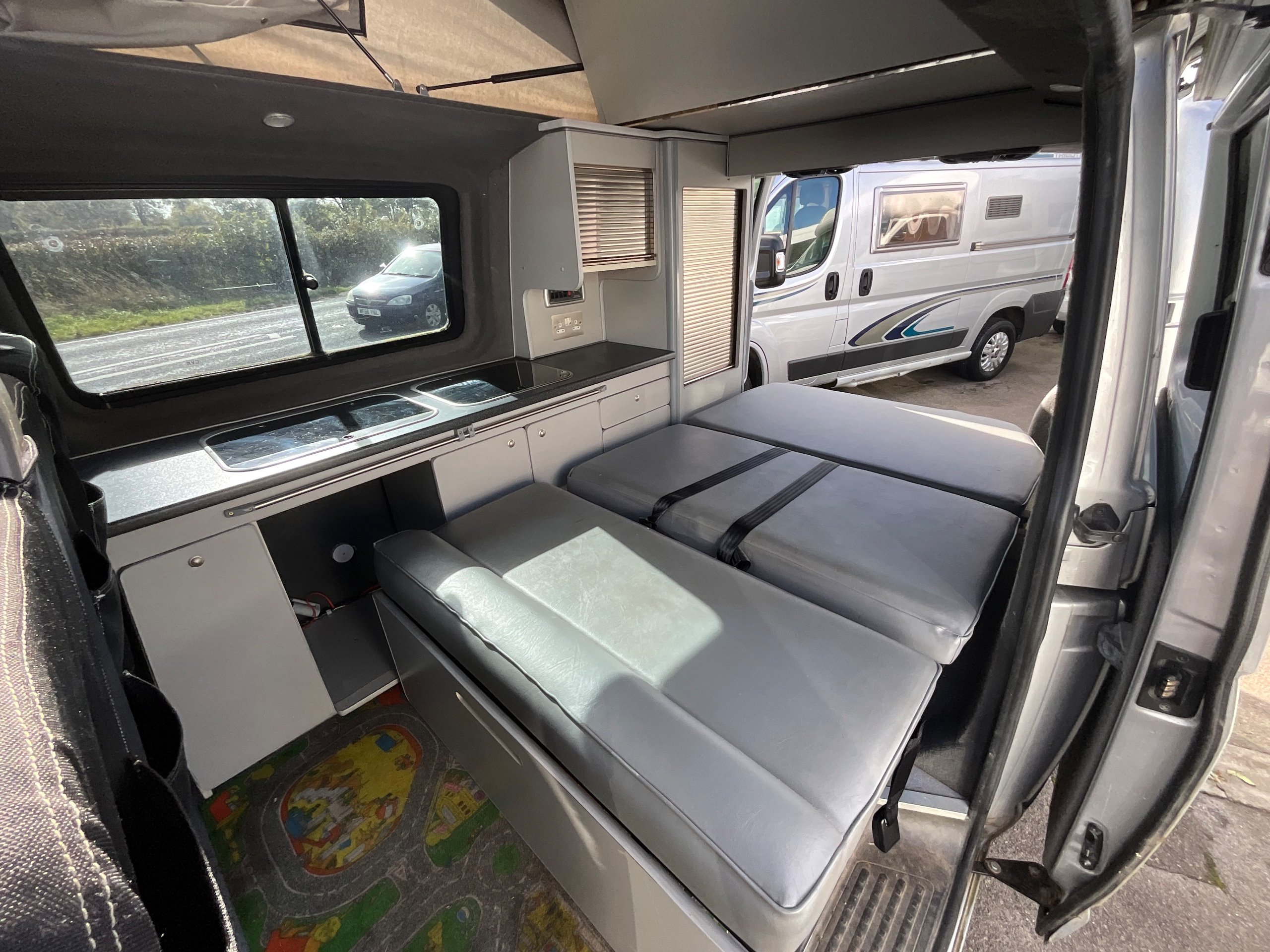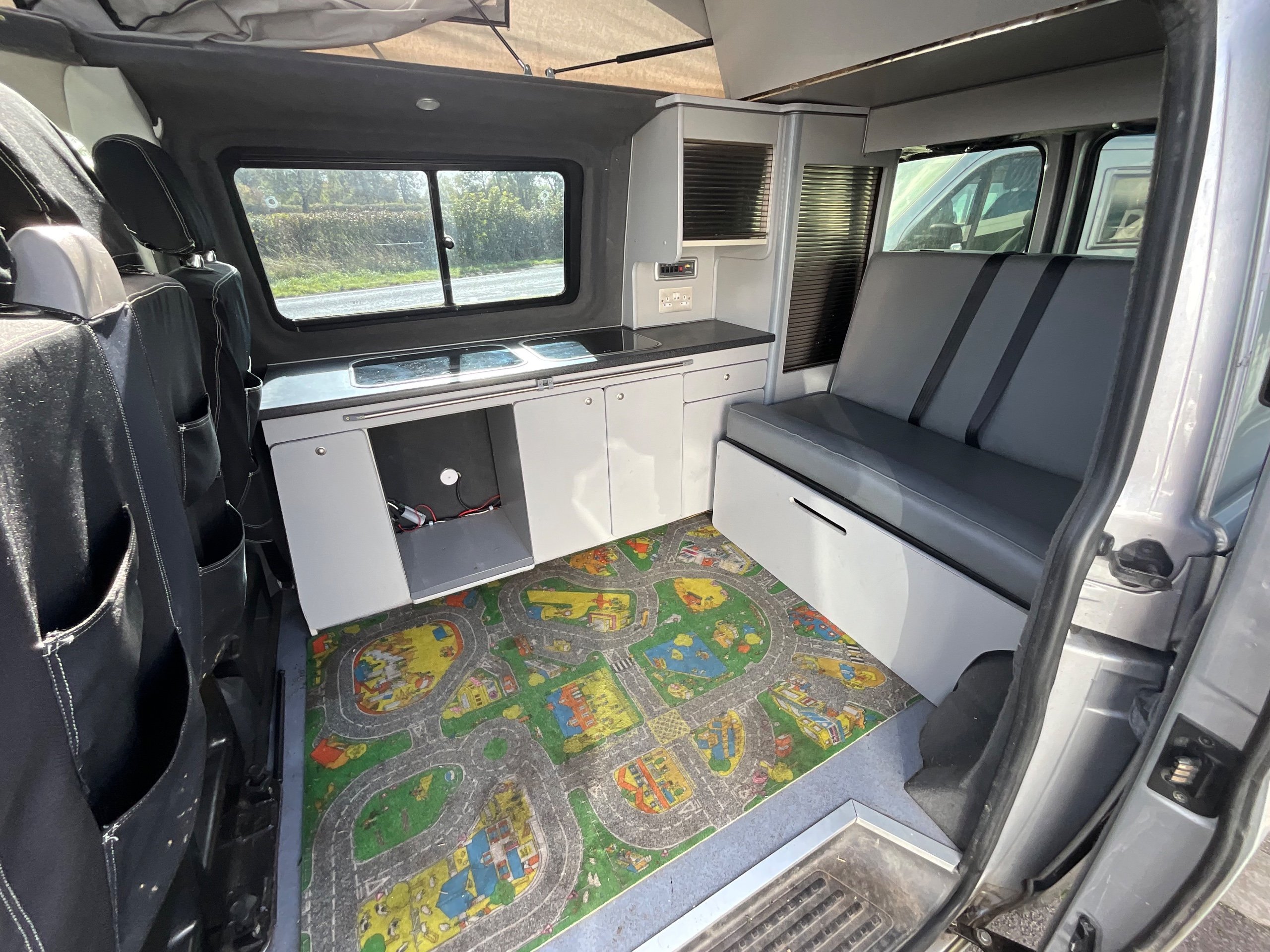 2007 VW campervan offers everything from comfort, practicality. It has been fully converted with grey interior fabric, grey units, fabric lined walls with grey non slip flooring. There is also interior light fittings. The VW has been fitted with a hi-lo roof with a coloured canvas and struts, three windows with insect proof netting for the sides and clear fabric at the front. This van is registered as a 5-seater and sleeps 4.