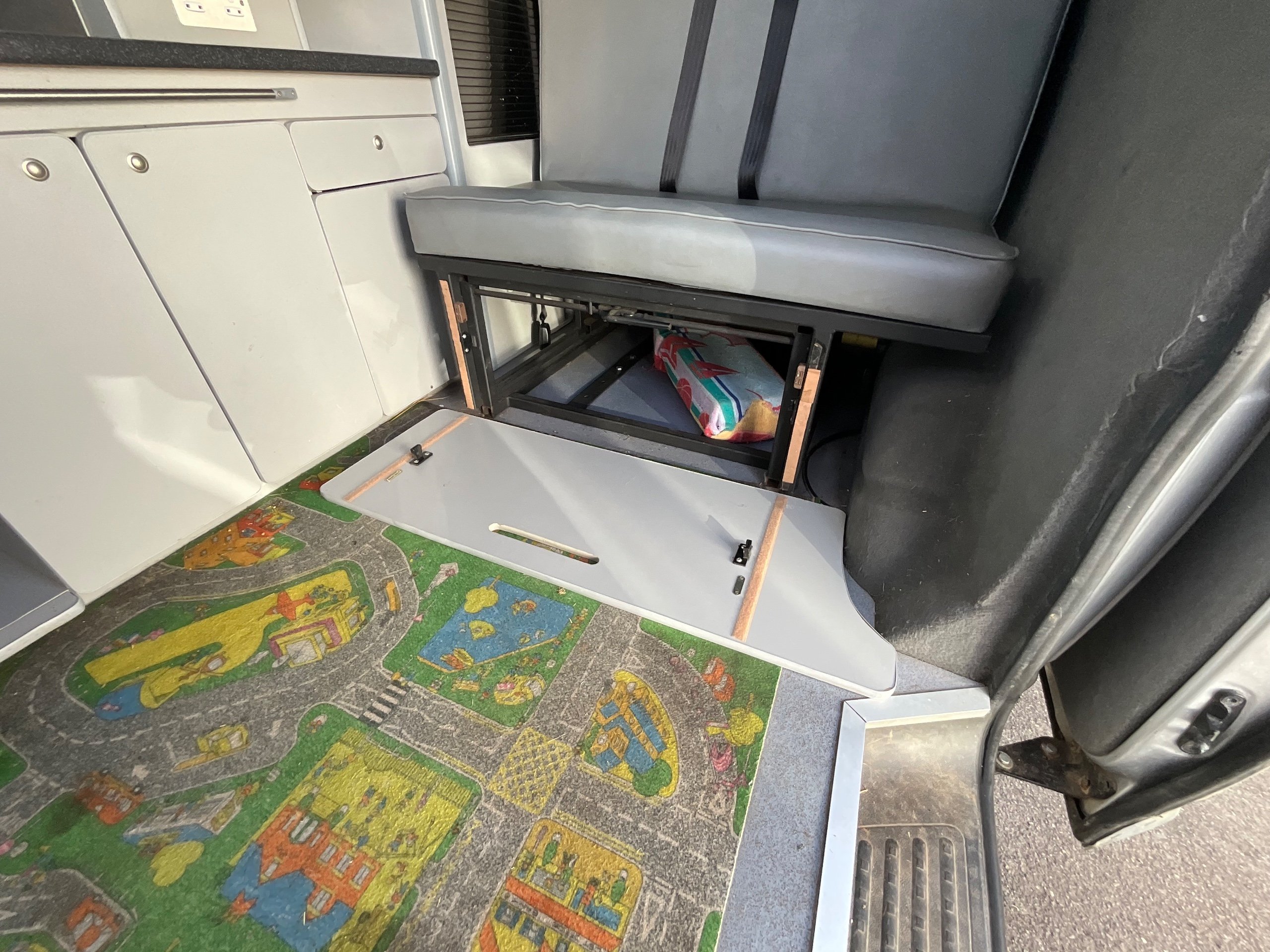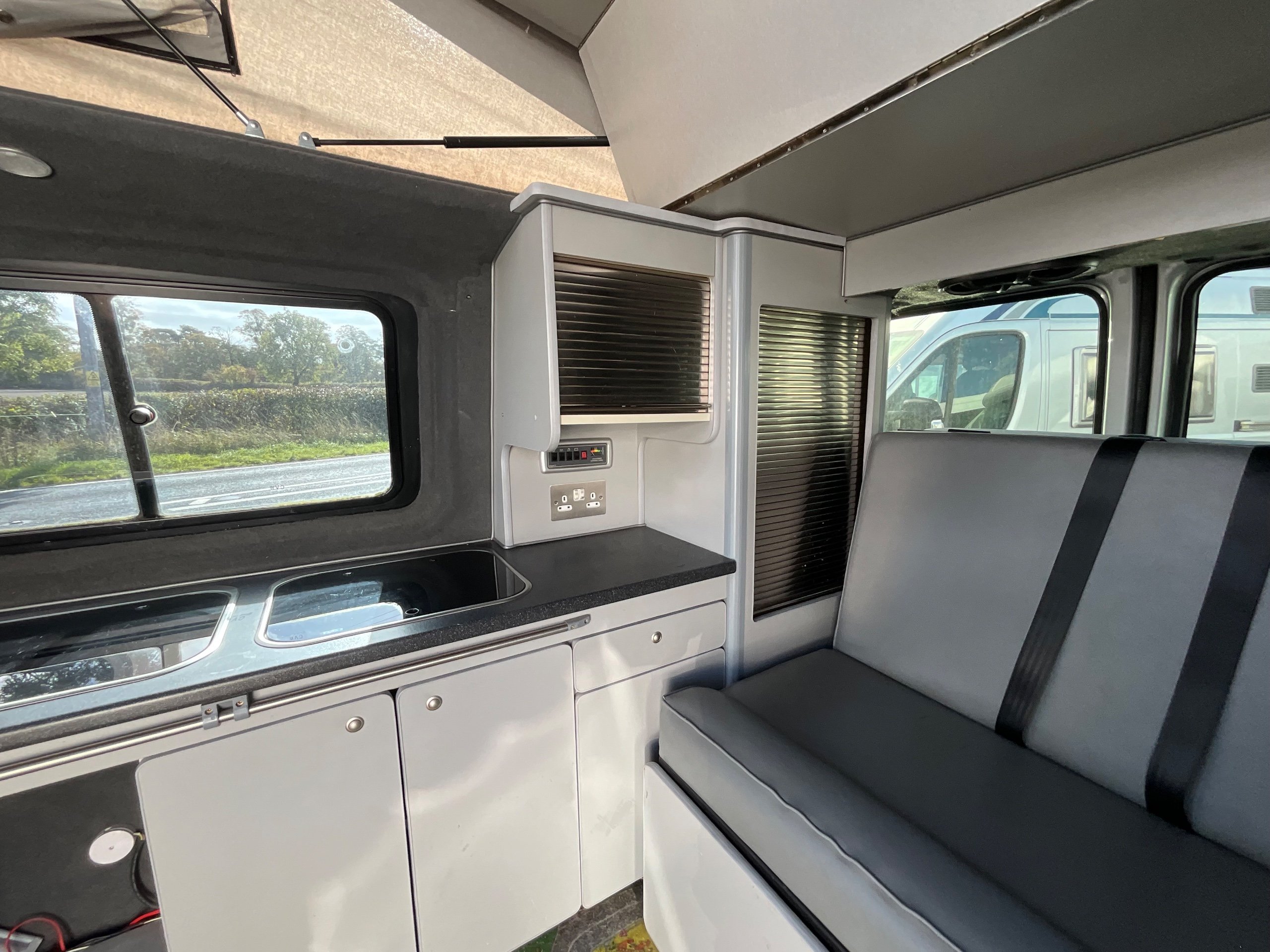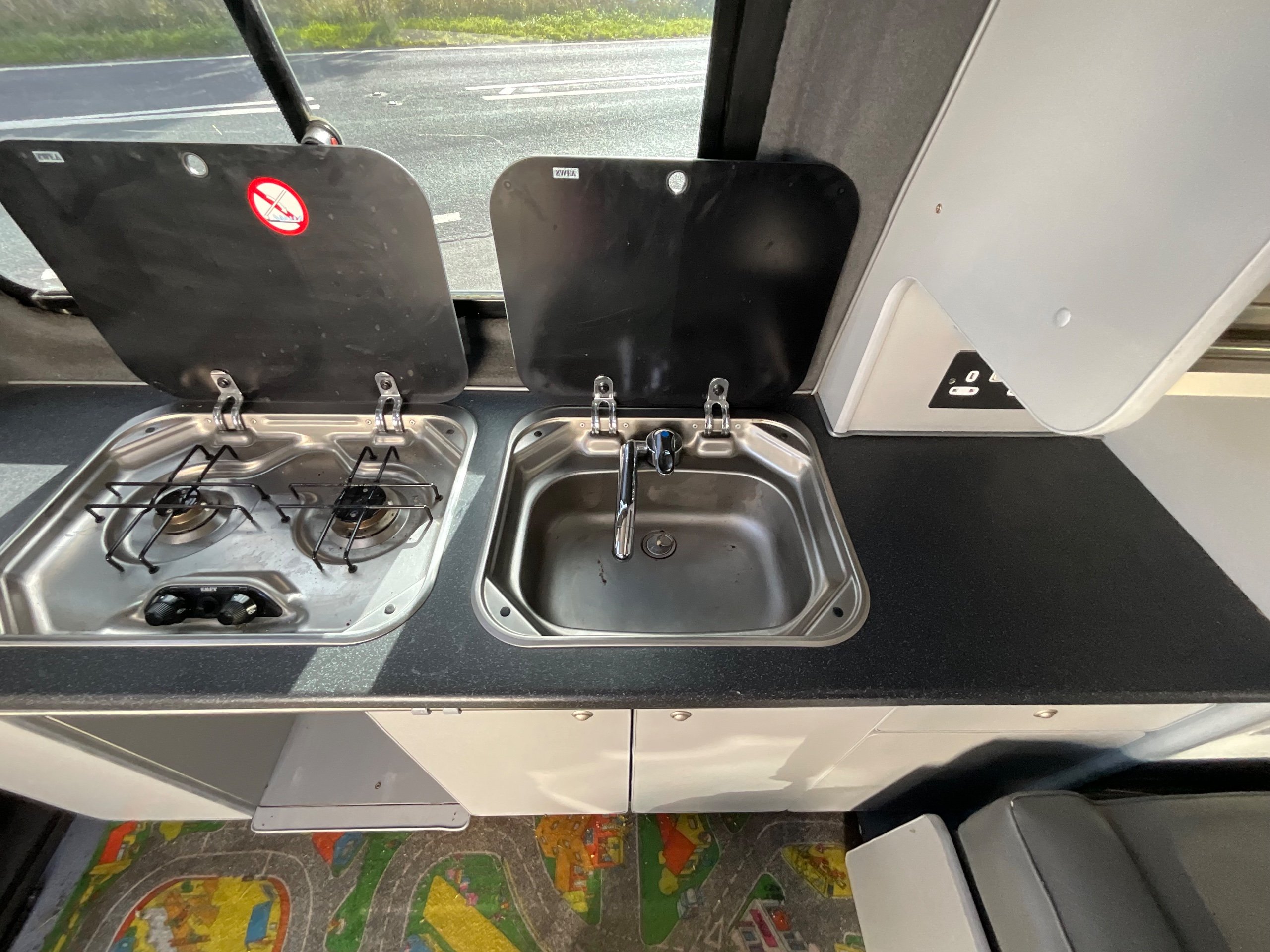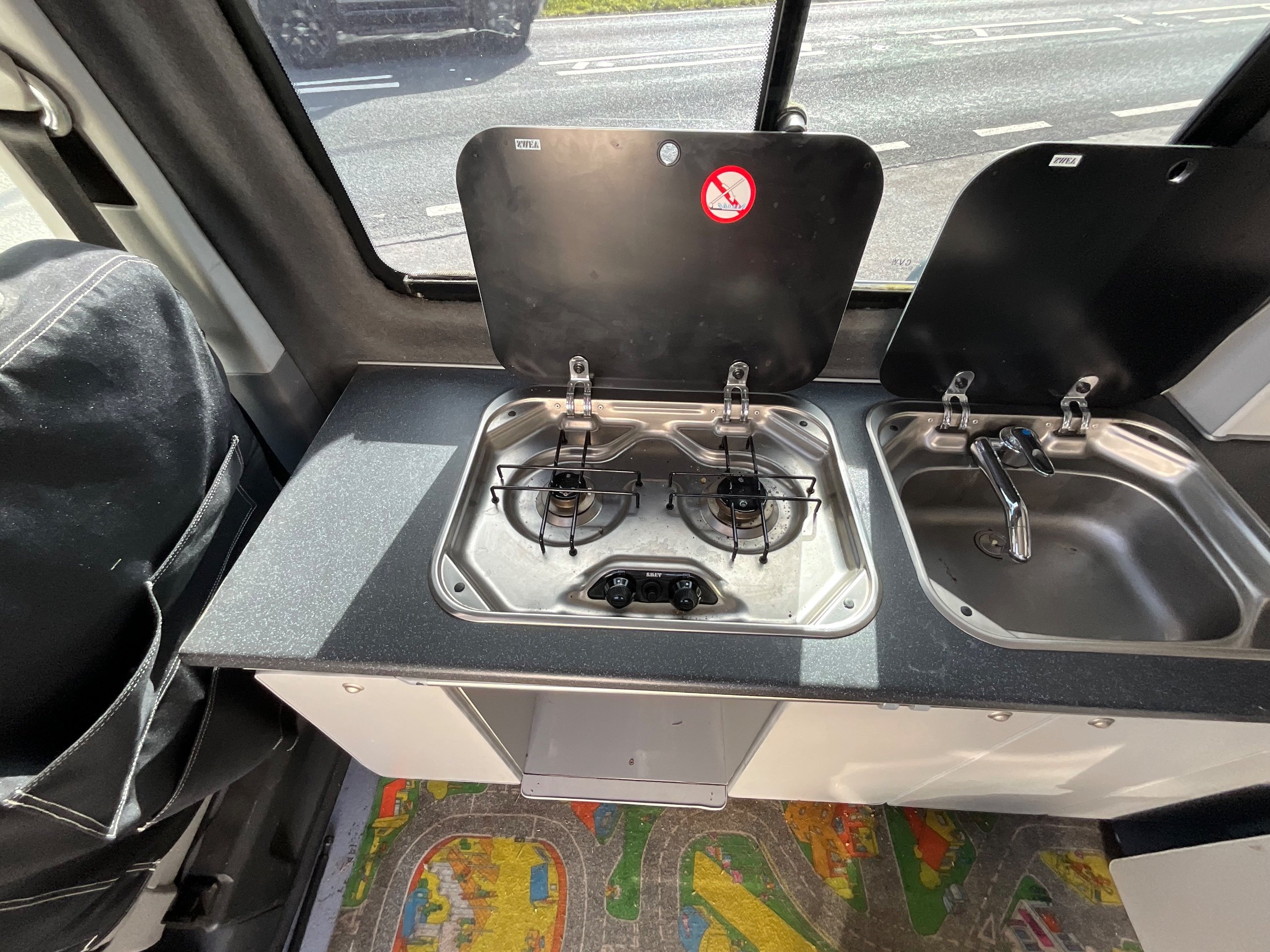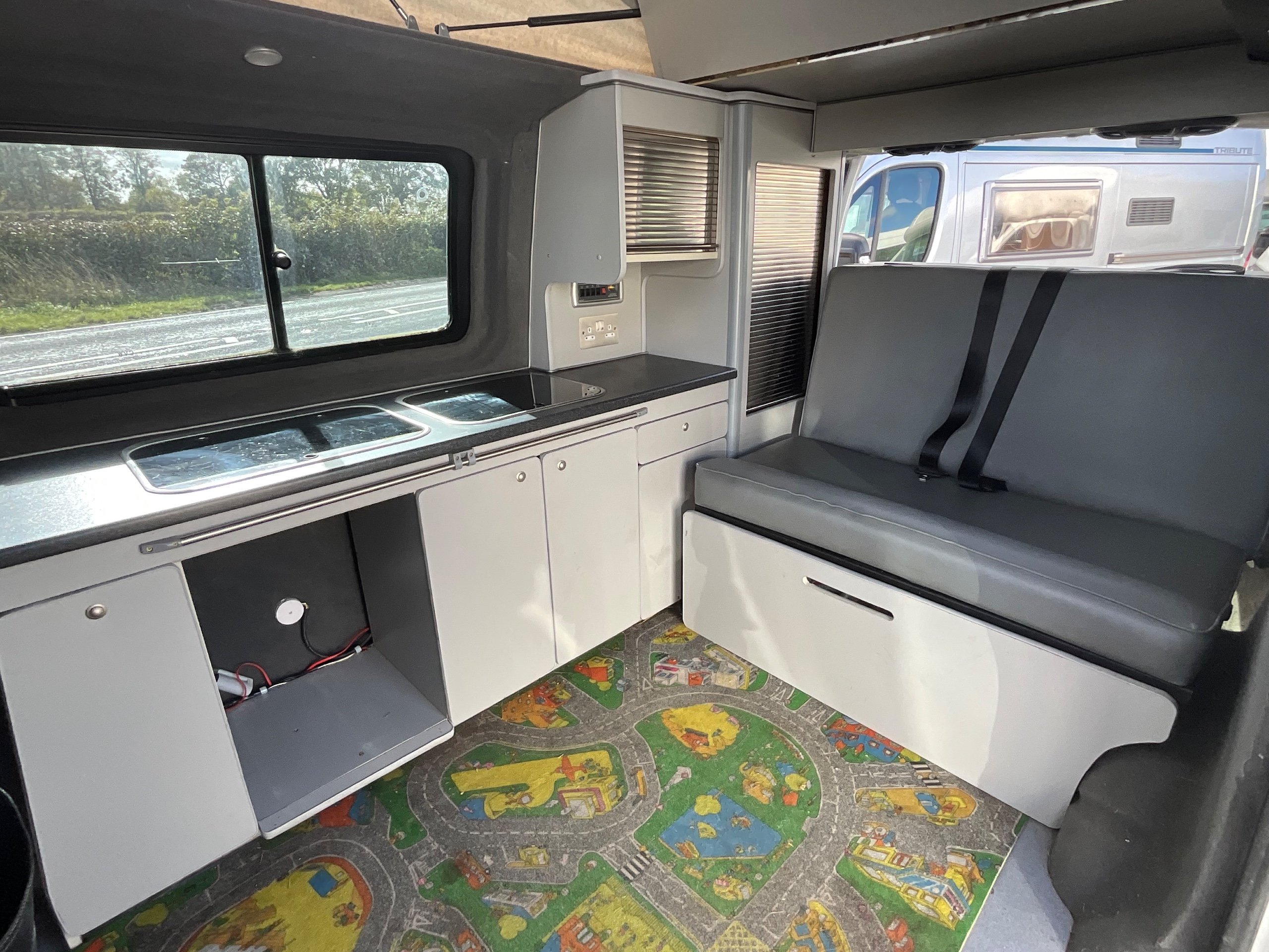 The seats in the back are created out of the crash tested and approved rock ānā roll bed (forming a spacious doubled bed) to have the classic VW layout inside, while still having the all the standard comforts as well as belted seats. There is also a removeable table. A double swivel seat for extending the social space and ease of sleeping upstairs. There is also a domestic double gas hob (working off a camping gas bottle), and a sink with an electrical water pump which is connected to a fresh water container. There is also 240V hook up. The van has plenty of storage throughout the motorhome as well.