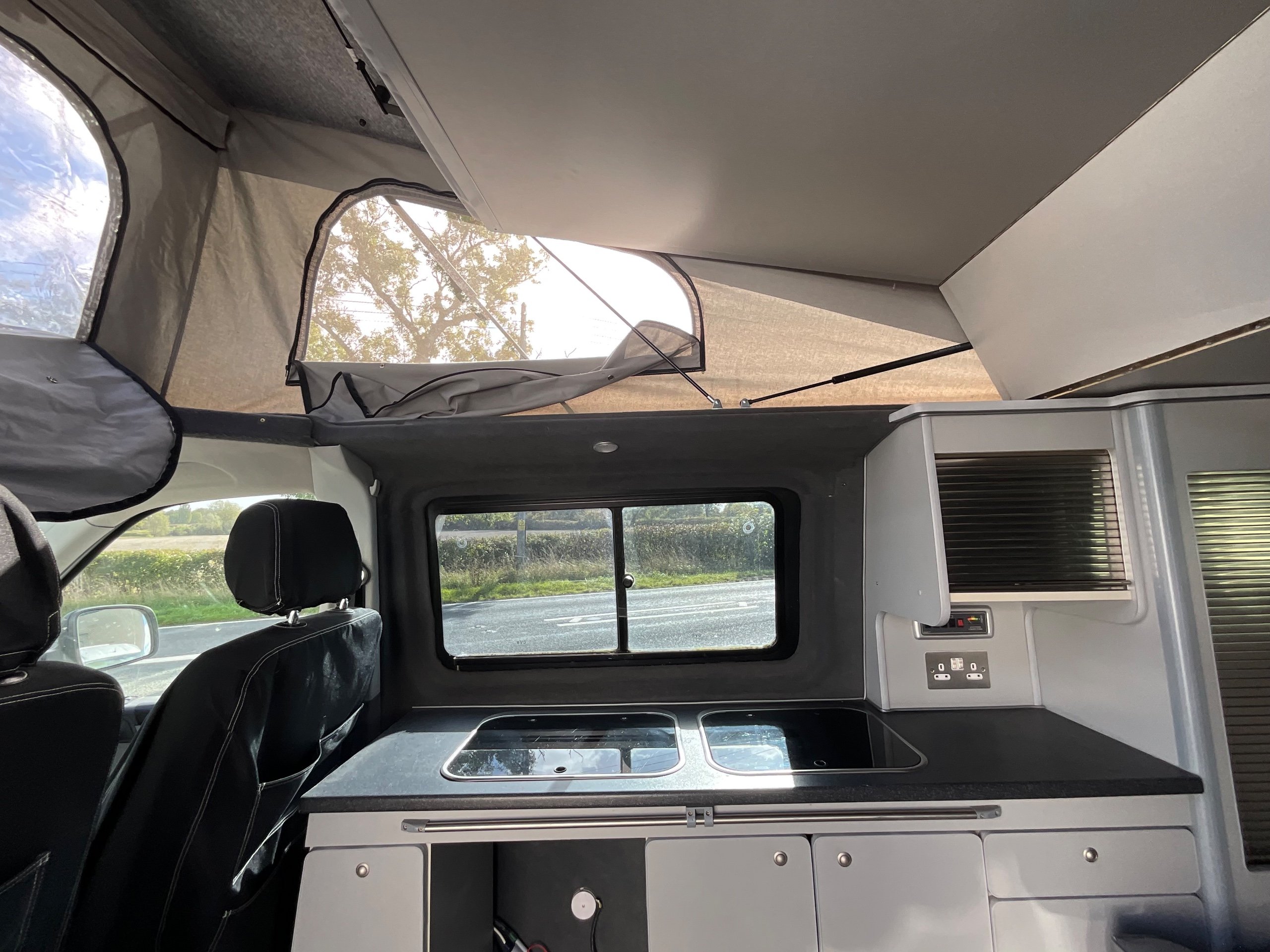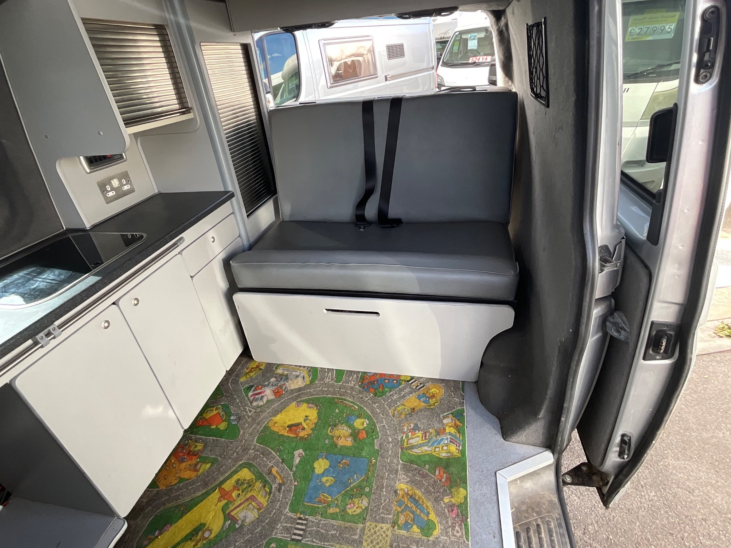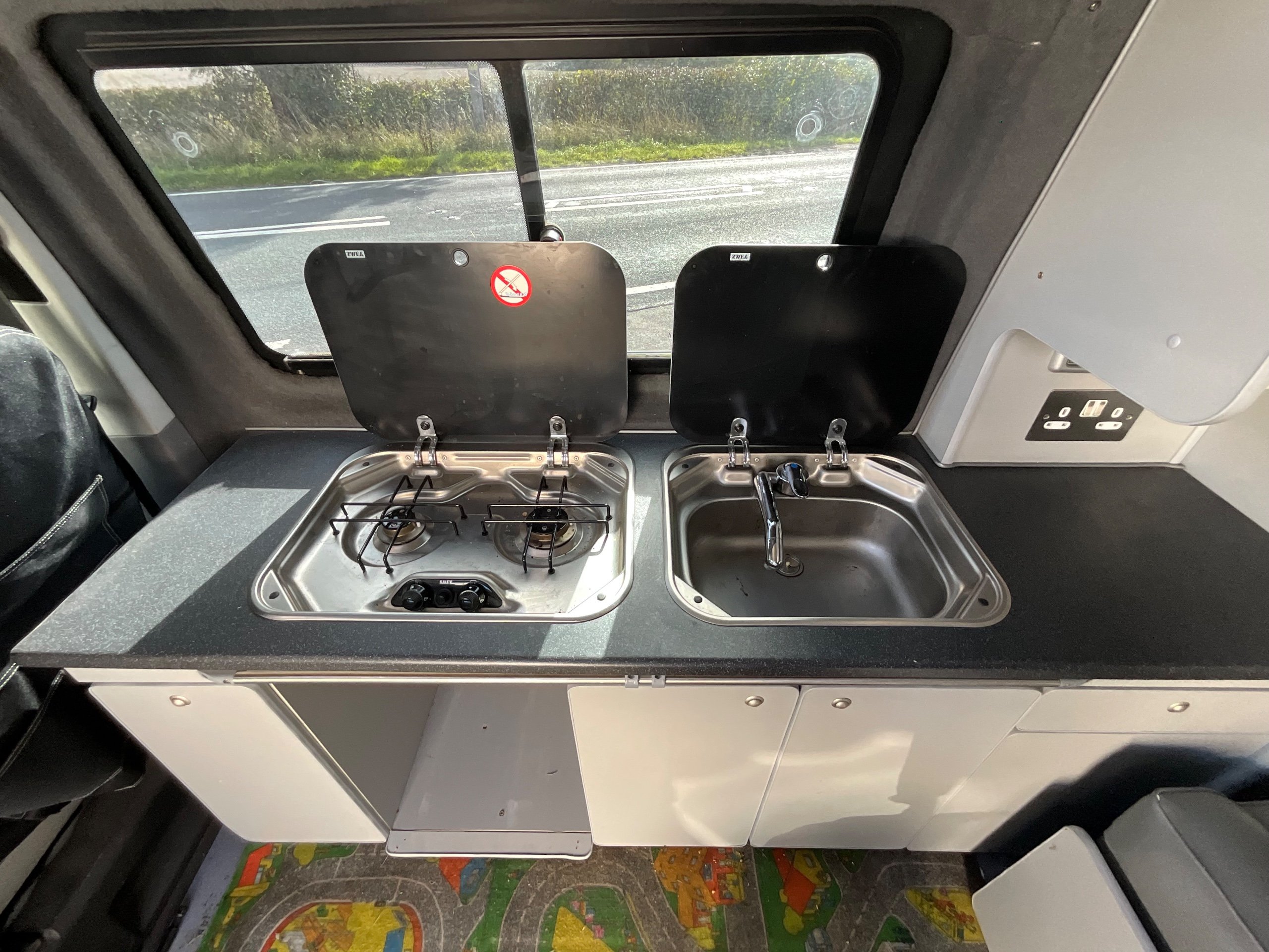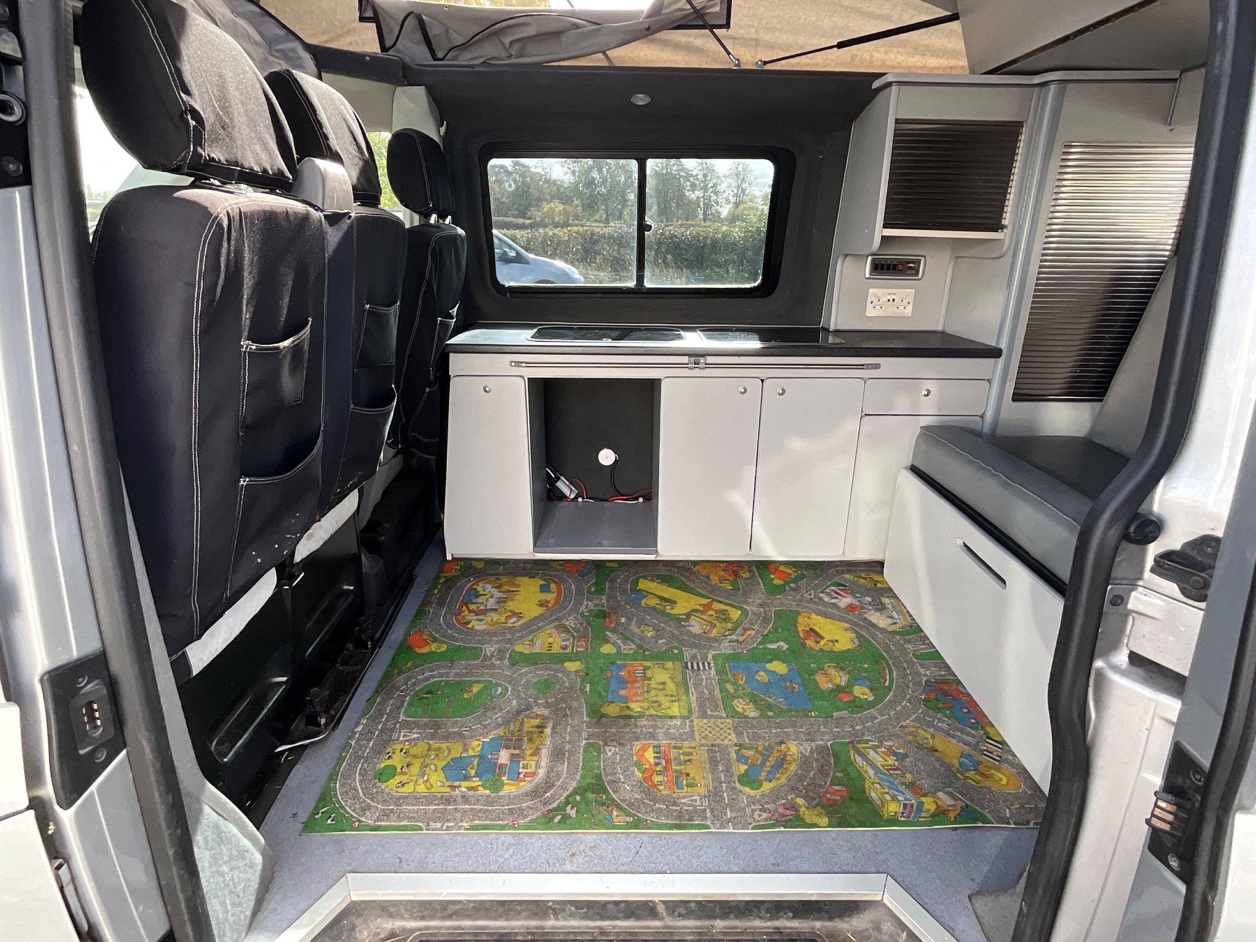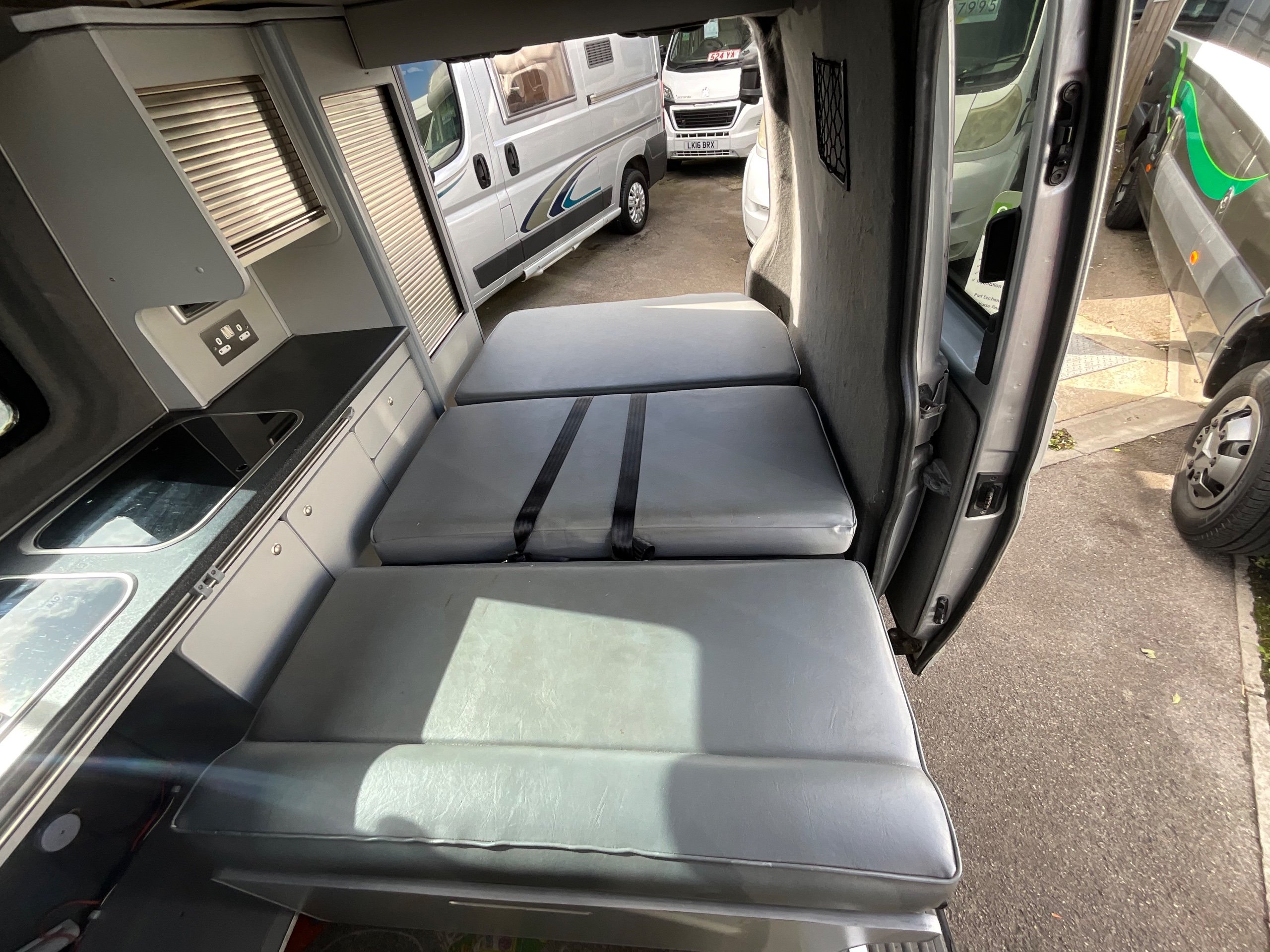 The seats in the back are created out of the crash tested and approved rock ānā roll bed (forming a spacious doubled bed) to have the classic VW layout inside, while still having the all the standard comforts as well as belted seats. There is also a removeable table. A double swivel seat for extending the social space and ease of sleeping upstairs. There is also a domestic double gas hob (working off a camping gas bottle), and a sink with an electrical water pump which is connected to a fresh water container. There is also 240V hook up. The van has plenty of storage throughout the motorhome as well.