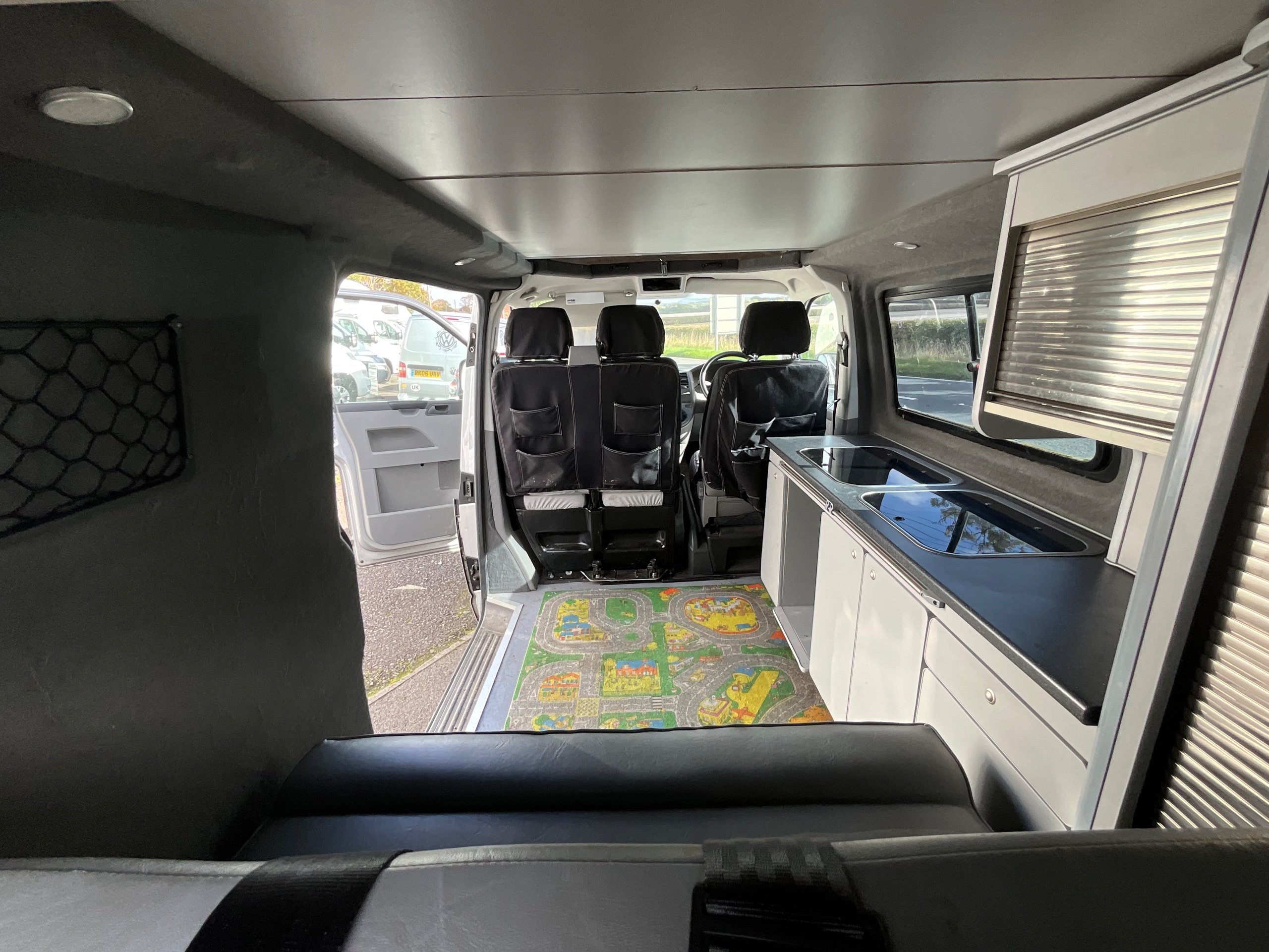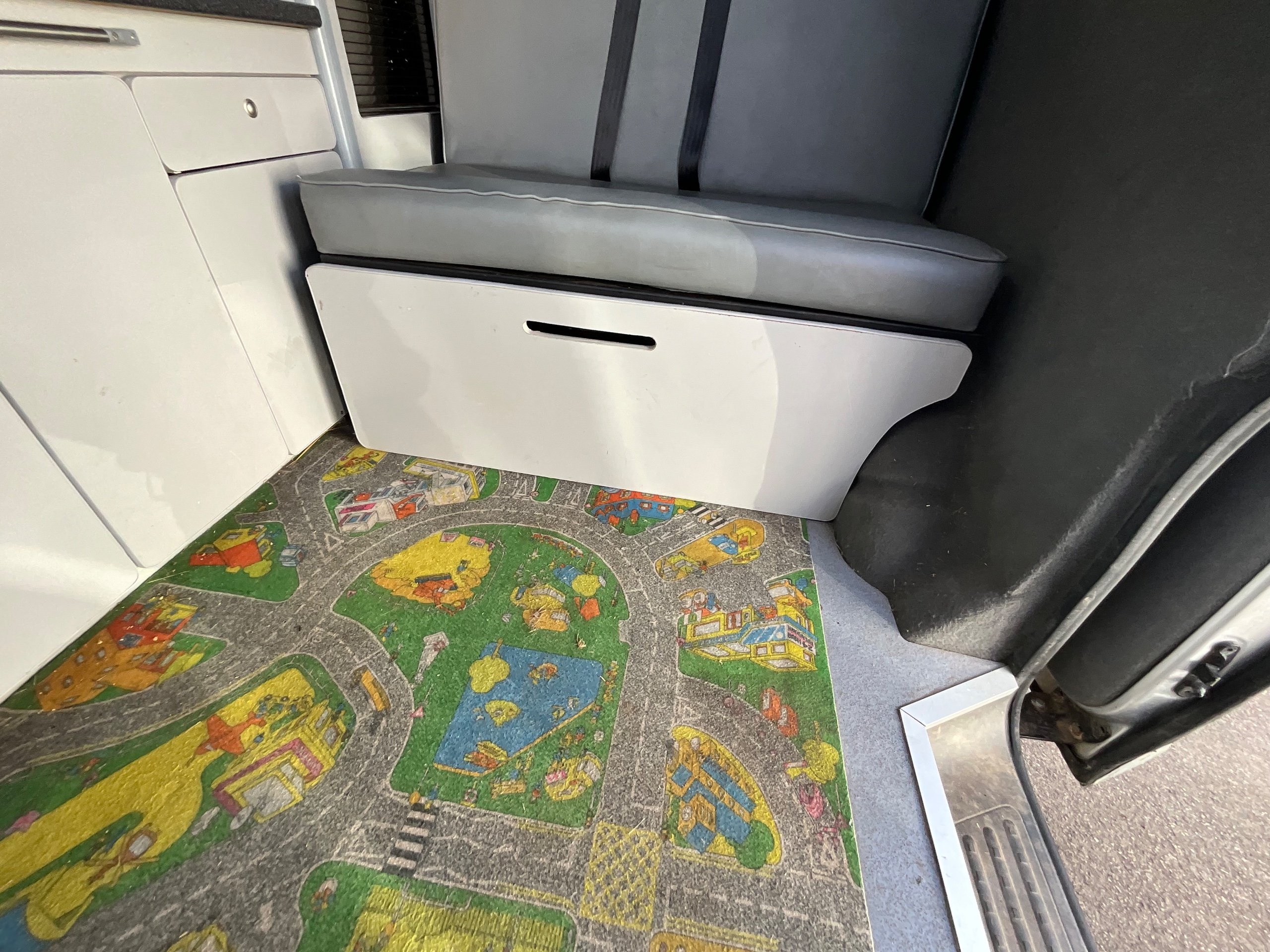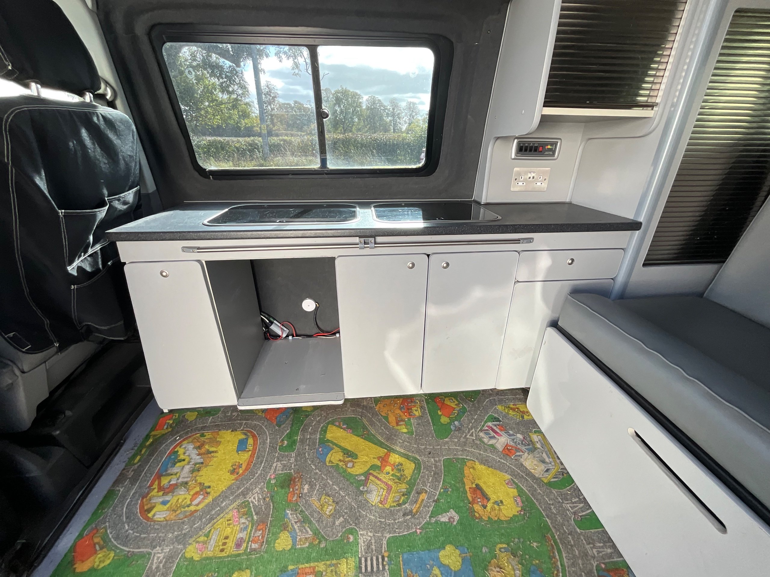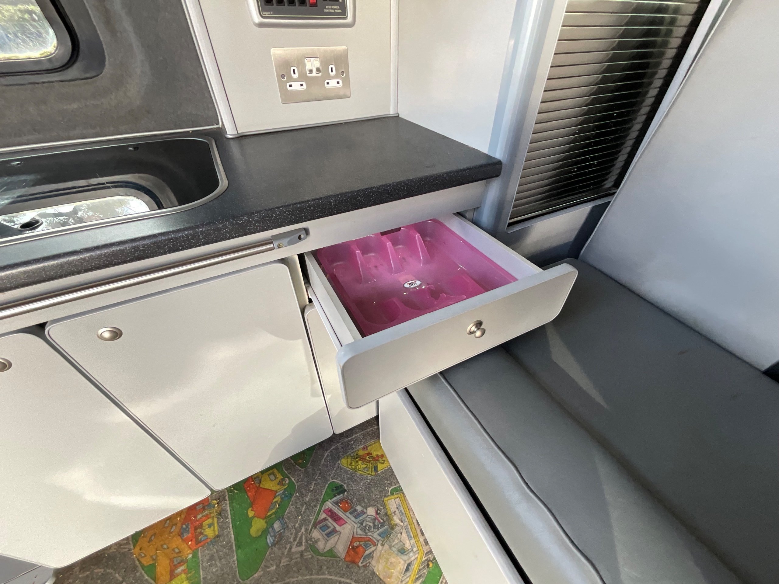 The seats in the back are created out of the crash tested and approved rock ānā roll bed (forming a spacious doubled bed) to have the classic VW layout inside, while still having the all the standard comforts as well as belted seats. There is also a removeable table. A double swivel seat for extending the social space and ease of sleeping upstairs. There is also a domestic double gas hob (working off a camping gas bottle), and a sink with an electrical water pump which is connected to a fresh water container. There is also 240V hook up. The van has plenty of storage throughout the motorhome as well.