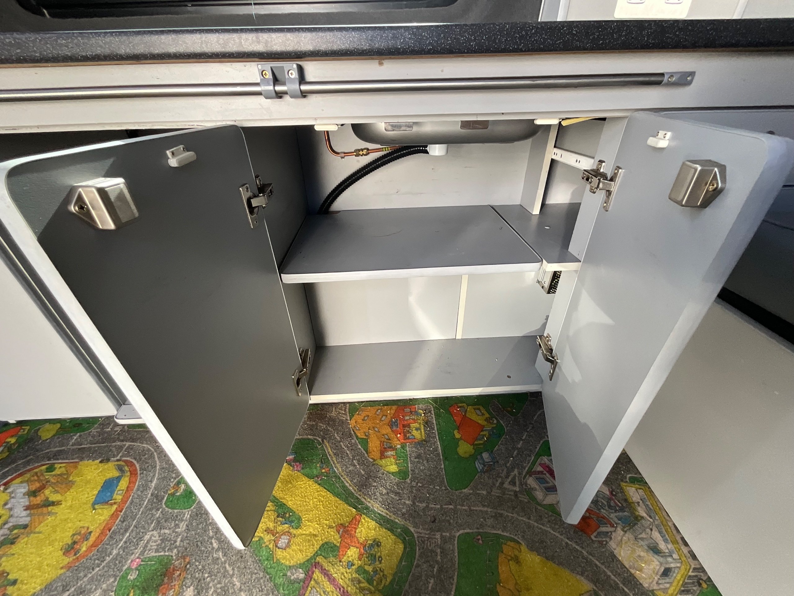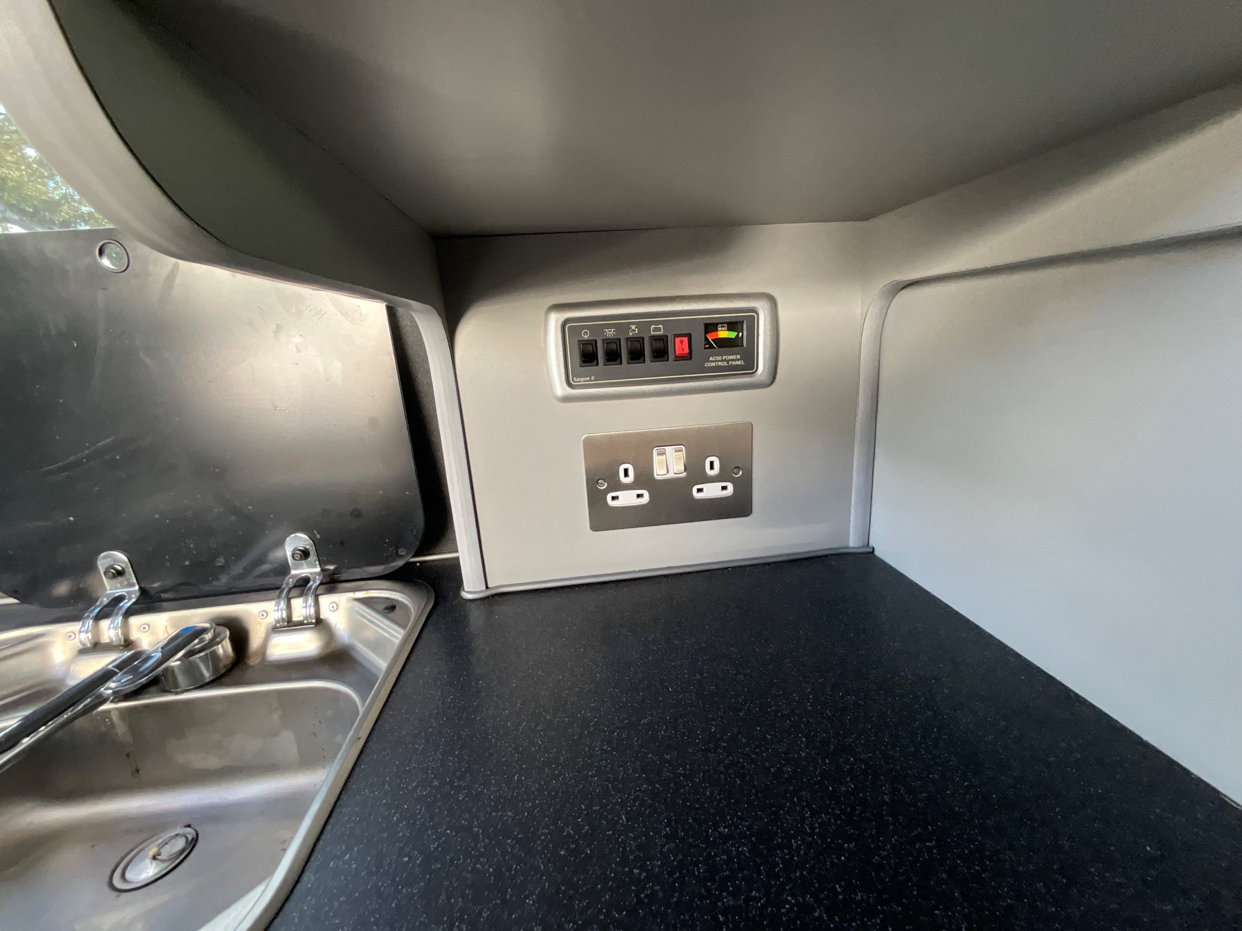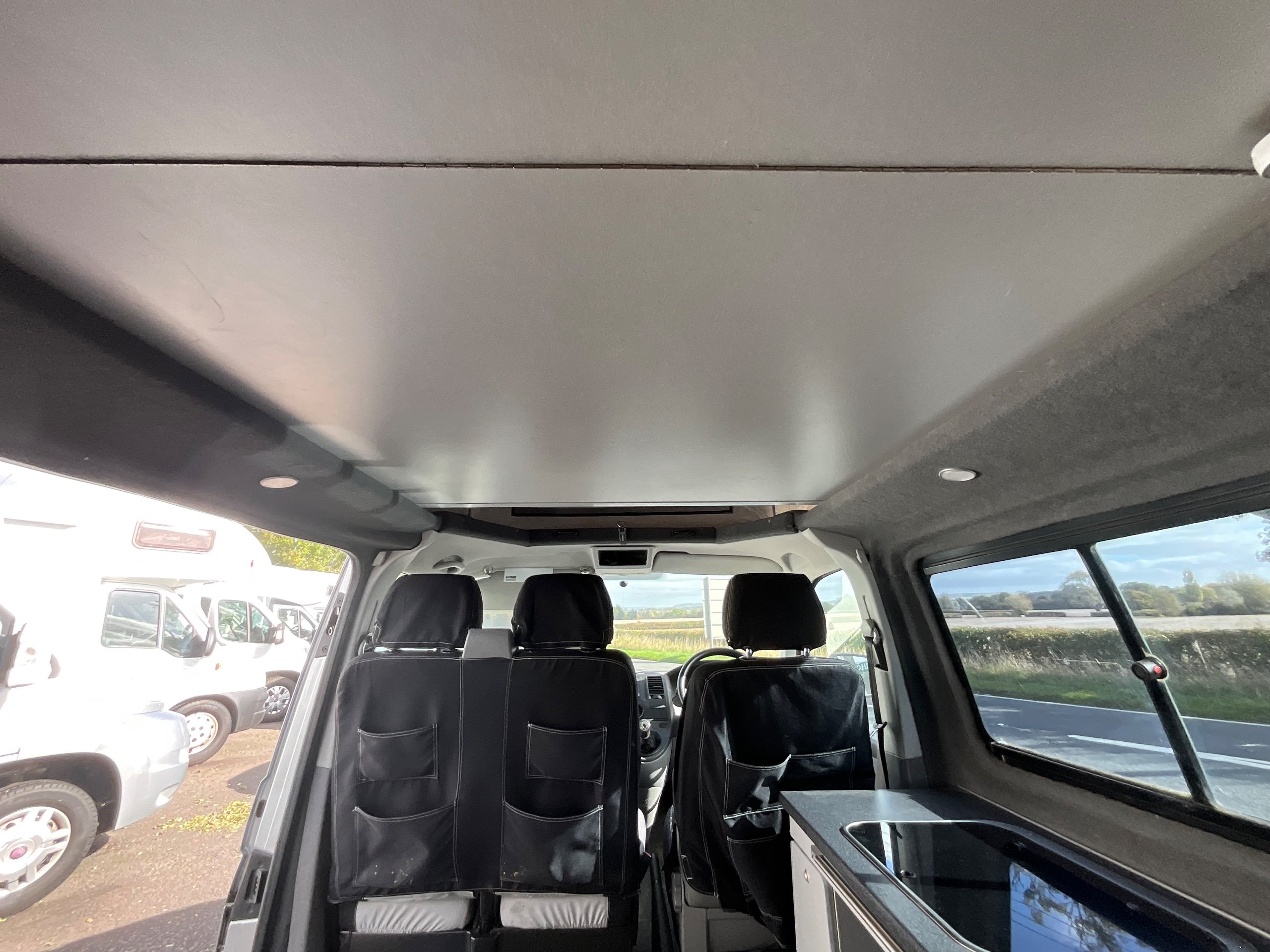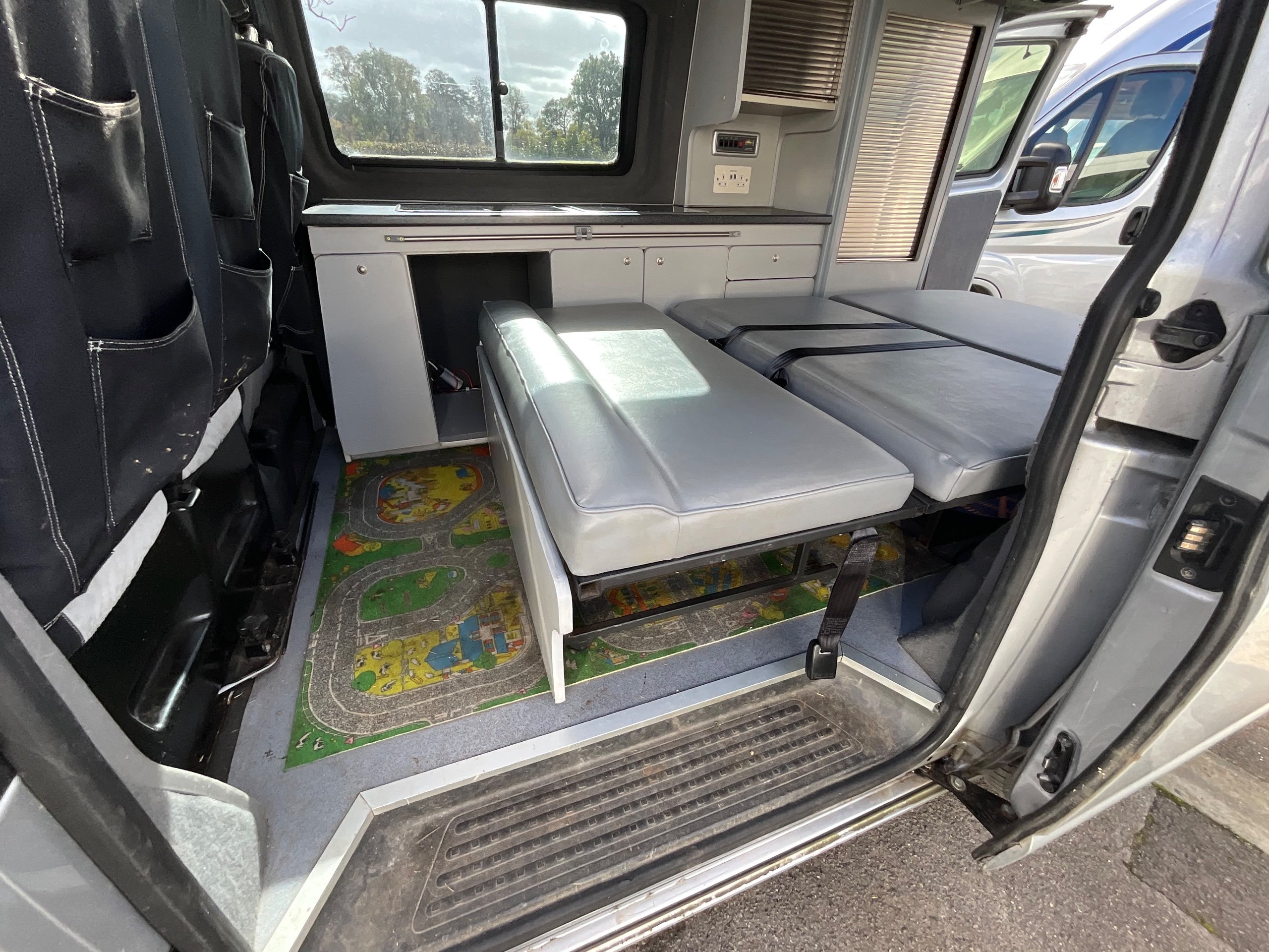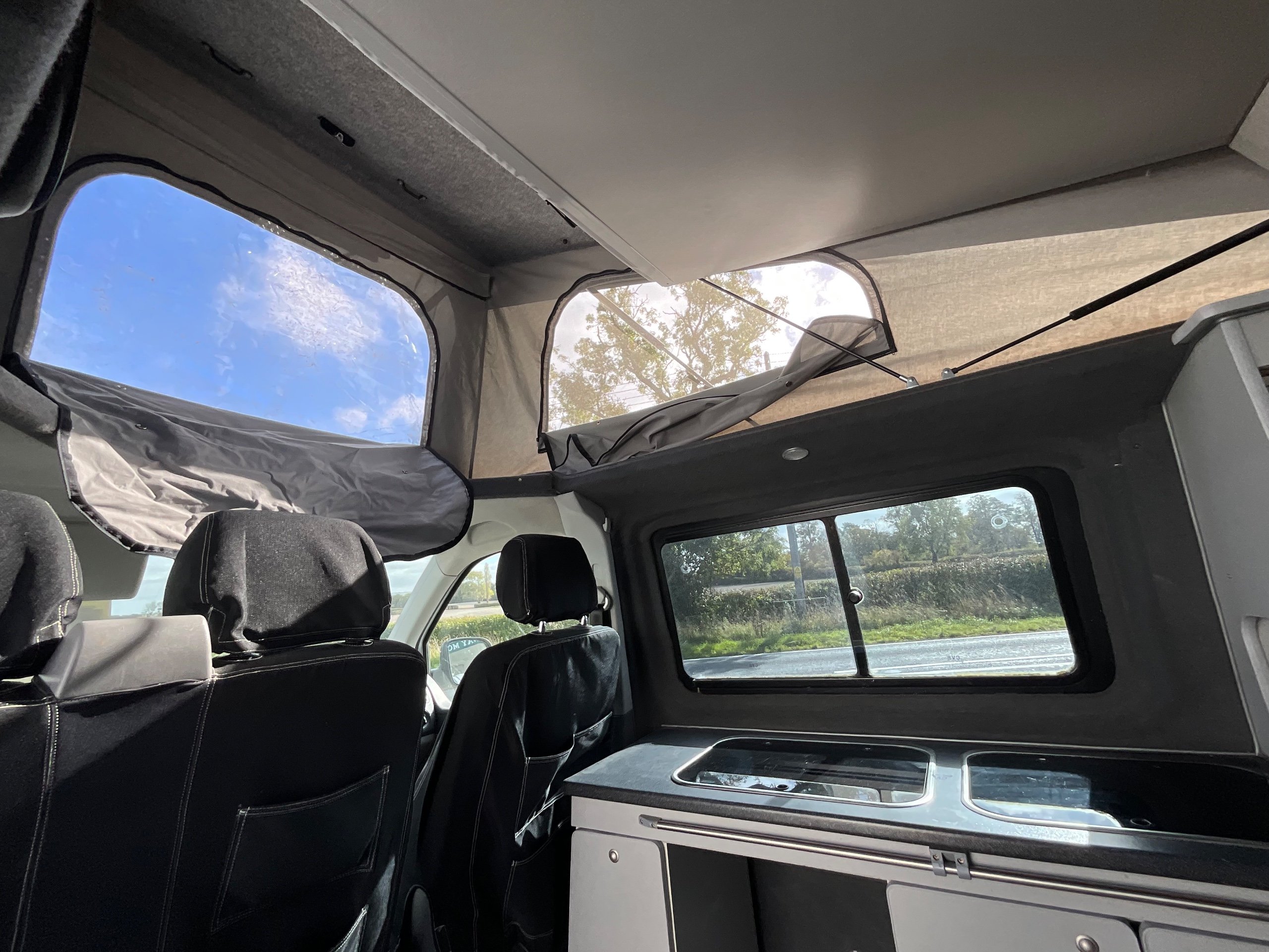 The seats in the back are created out of the crash tested and approved rock ānā roll bed (forming a spacious doubled bed) to have the classic VW layout inside, while still having the all the standard comforts as well as belted seats. There is also a removeable table. A double swivel seat for extending the social space and ease of sleeping upstairs. There is also a domestic double gas hob (working off a camping gas bottle), and a sink with an electrical water pump which is connected to a fresh water container. There is also 240V hook up. The van has plenty of storage throughout the motorhome as well.