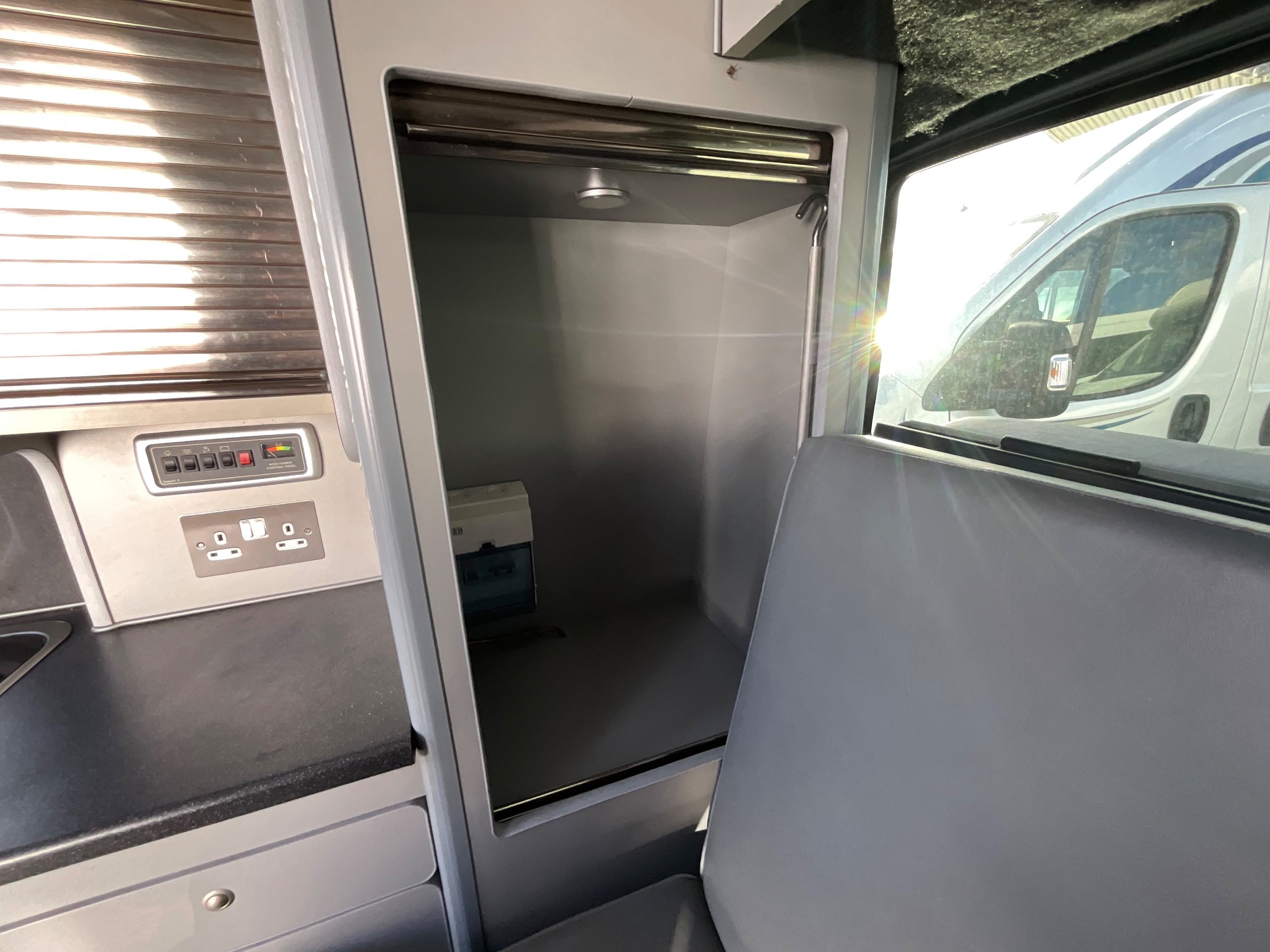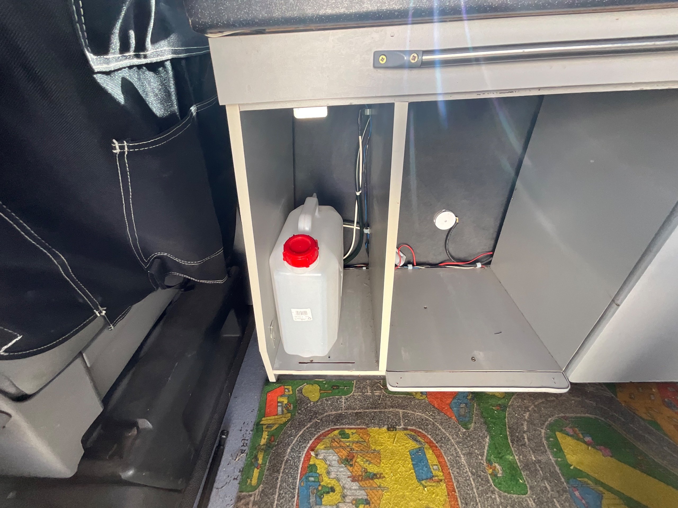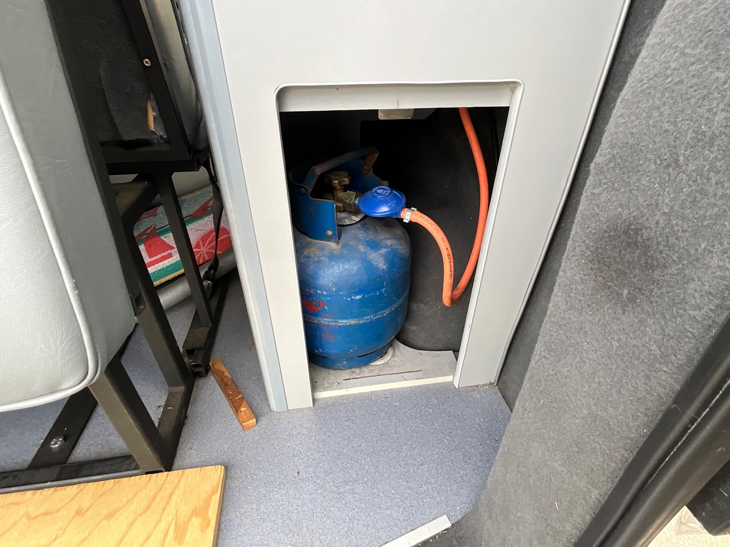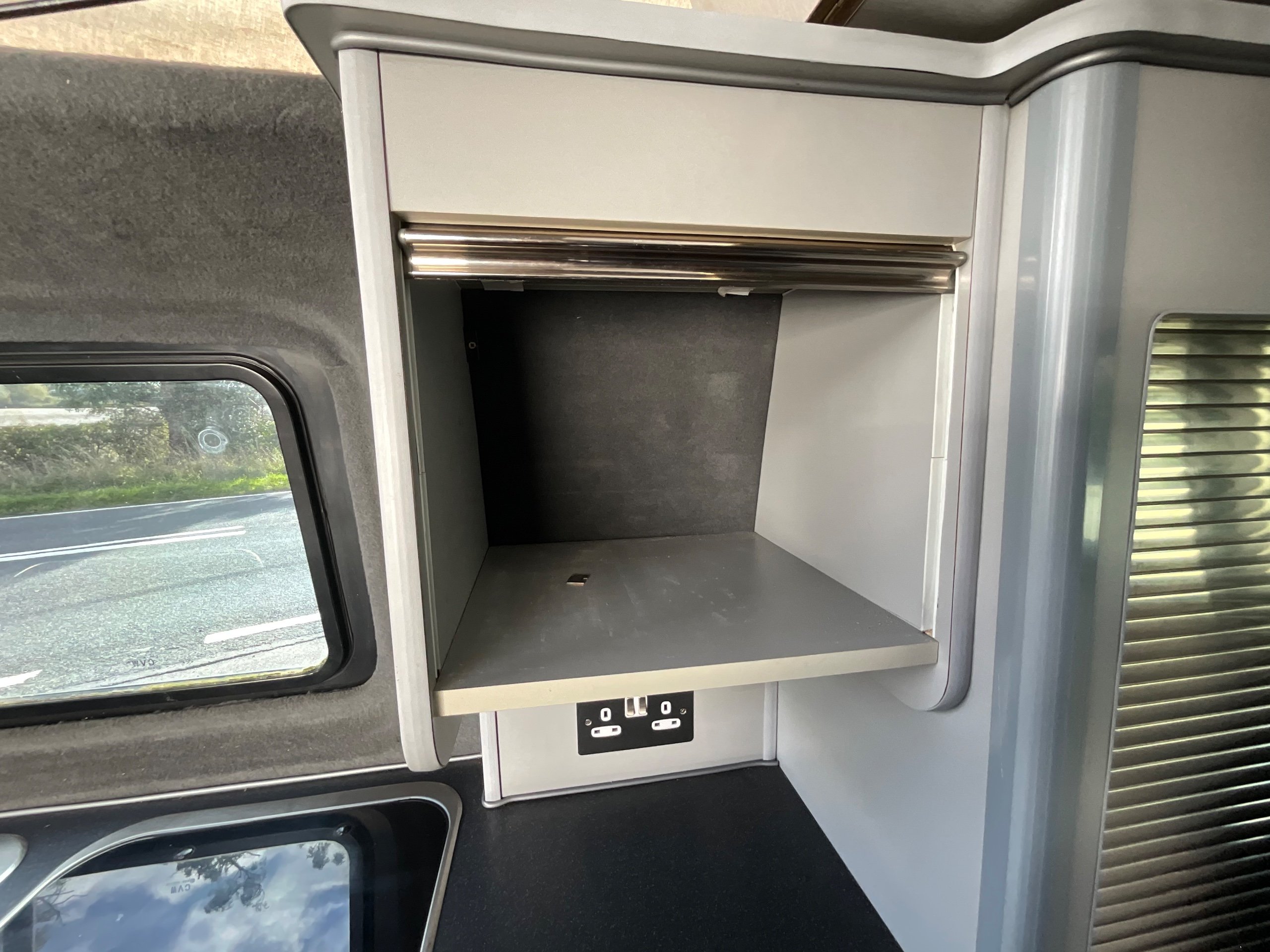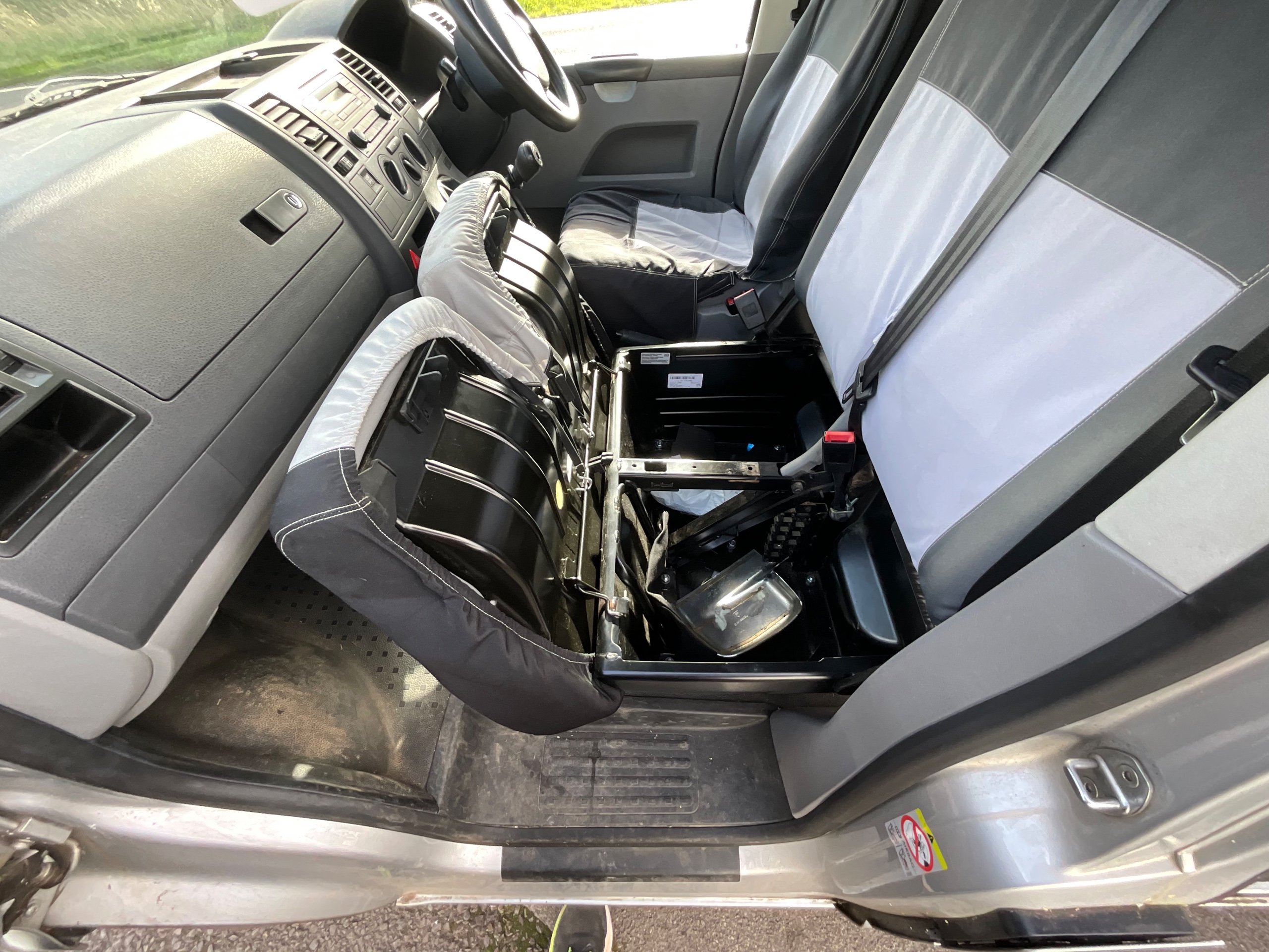 The seats in the back are created out of the crash tested and approved rock ānā roll bed (forming a spacious doubled bed) to have the classic VW layout inside, while still having the all the standard comforts as well as belted seats. There is also a removeable table. A double swivel seat for extending the social space and ease of sleeping upstairs. There is also a domestic double gas hob (working off a camping gas bottle), and a sink with an electrical water pump which is connected to a fresh water container. There is also 240V hook up. The van has plenty of storage throughout the motorhome as well.