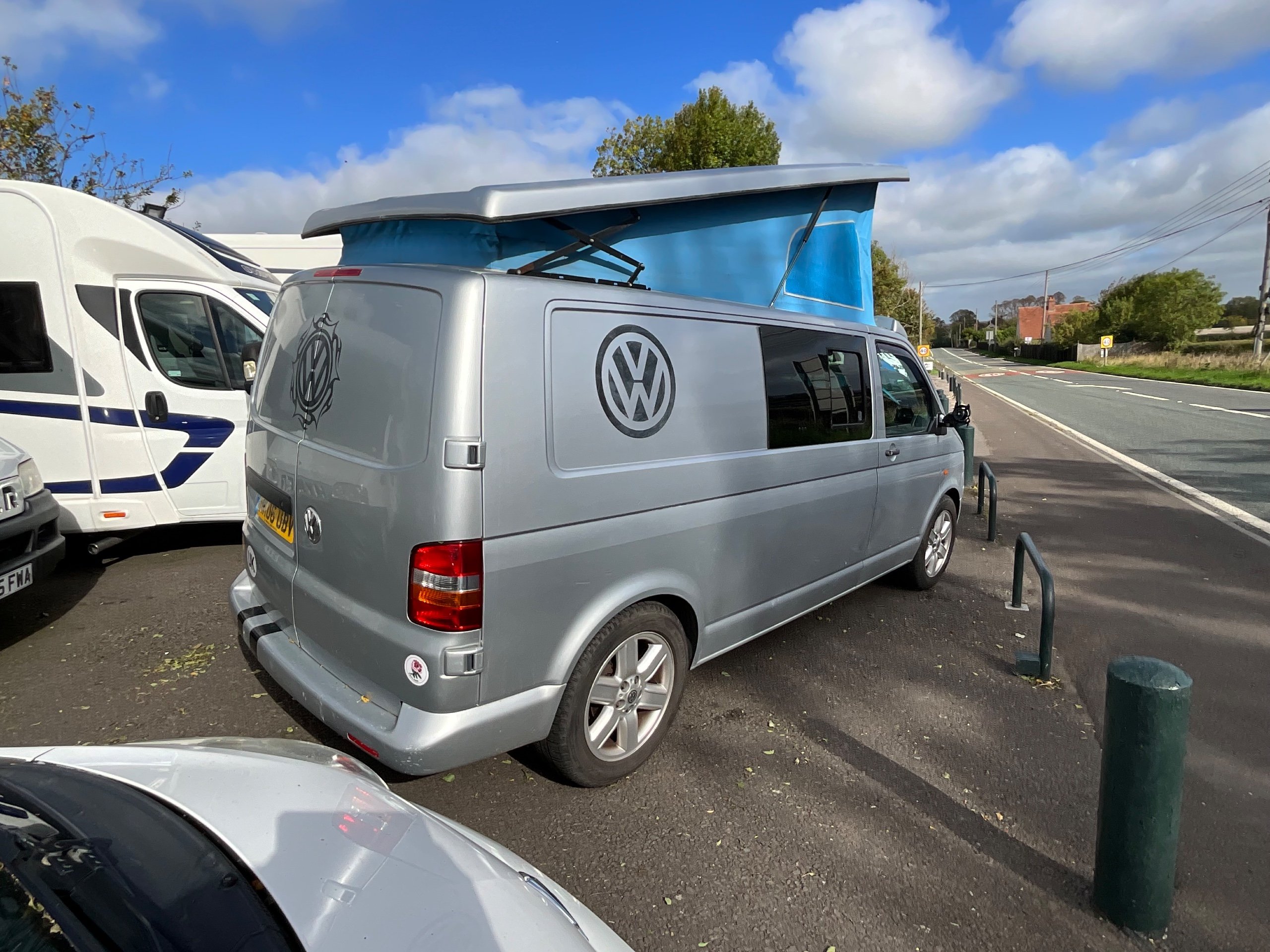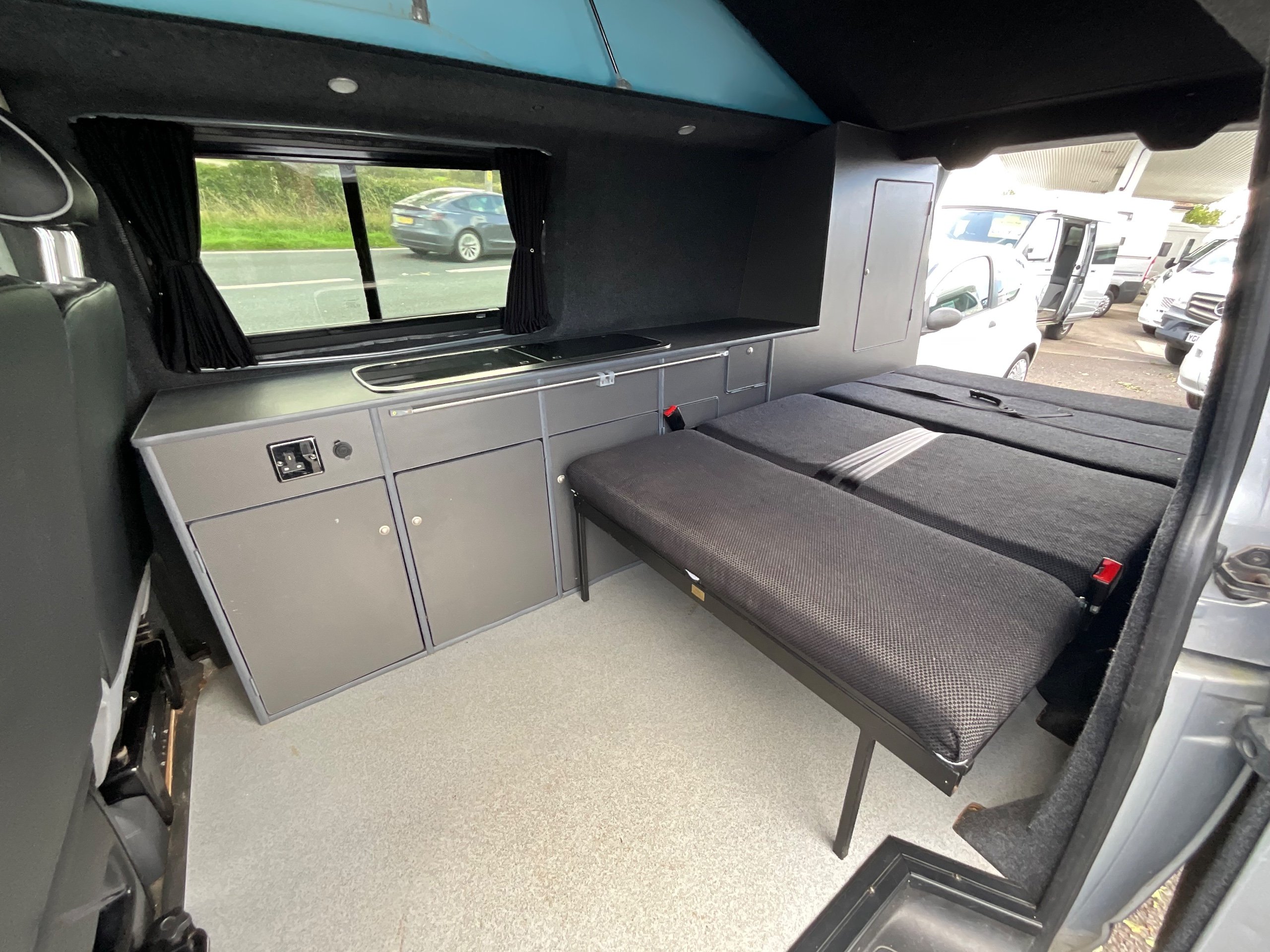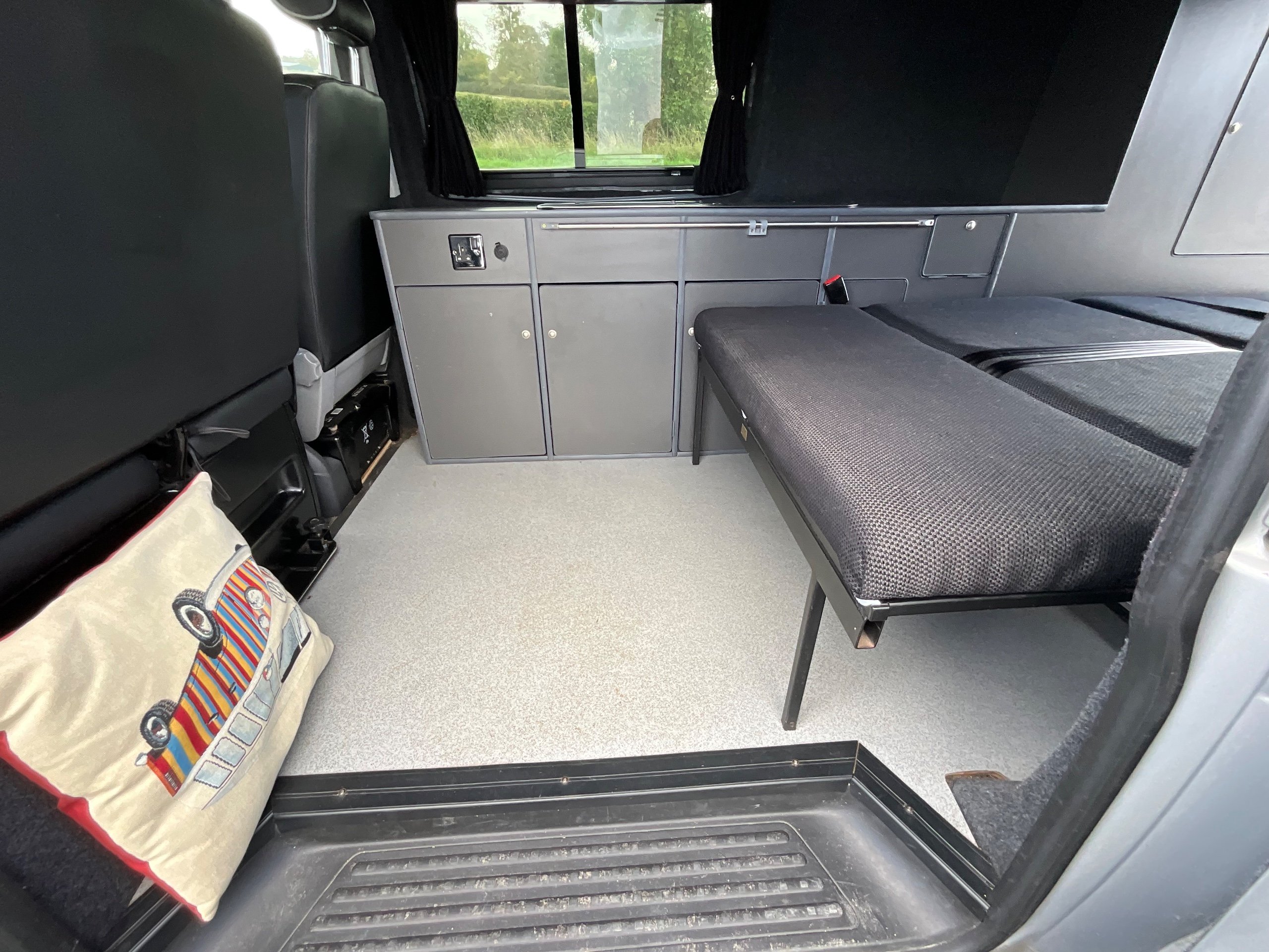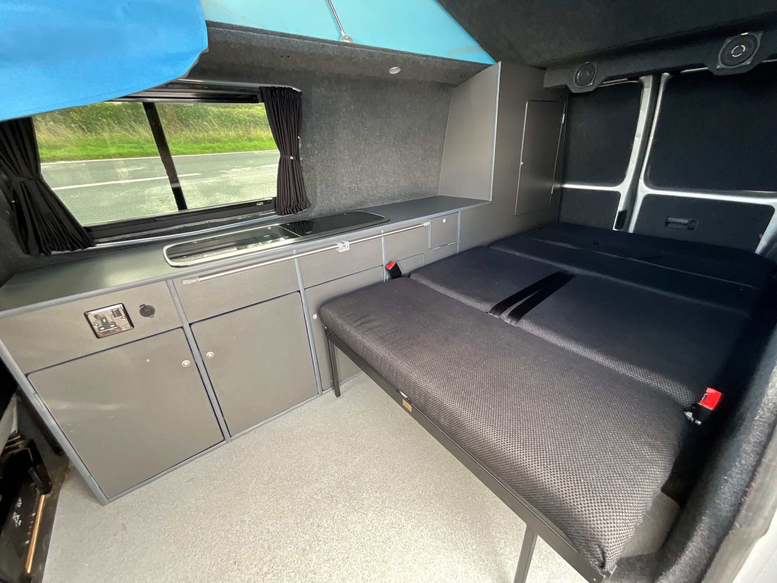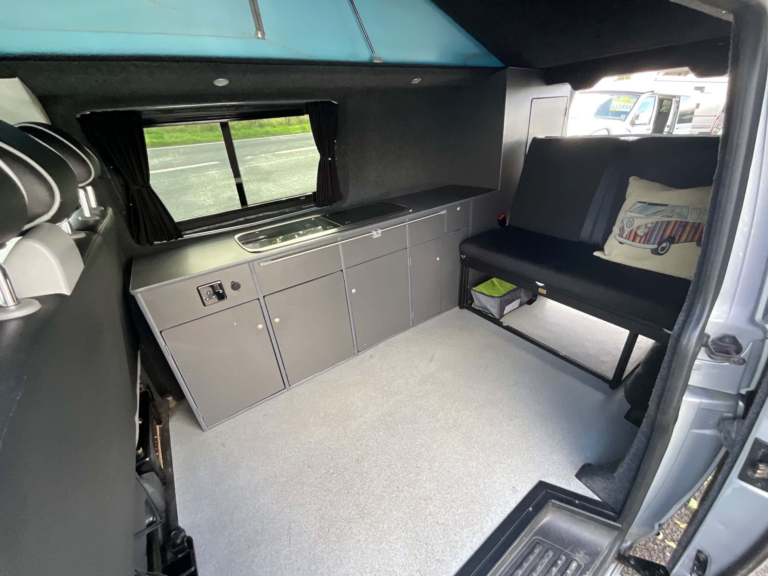 2007 VW campervan offers everything from comfort, practicality. It has been fully converted with black interior fabric, grey units, fabric lined walls with grey non slip flooring. There is also interior light fittings. The VW has been fitted with a hi-lo roof with a coloured canvas and struts, three windows with insect proof netting for the sides and clear fabric at the front. This van is registered as a 5-seater and sleeps 4.