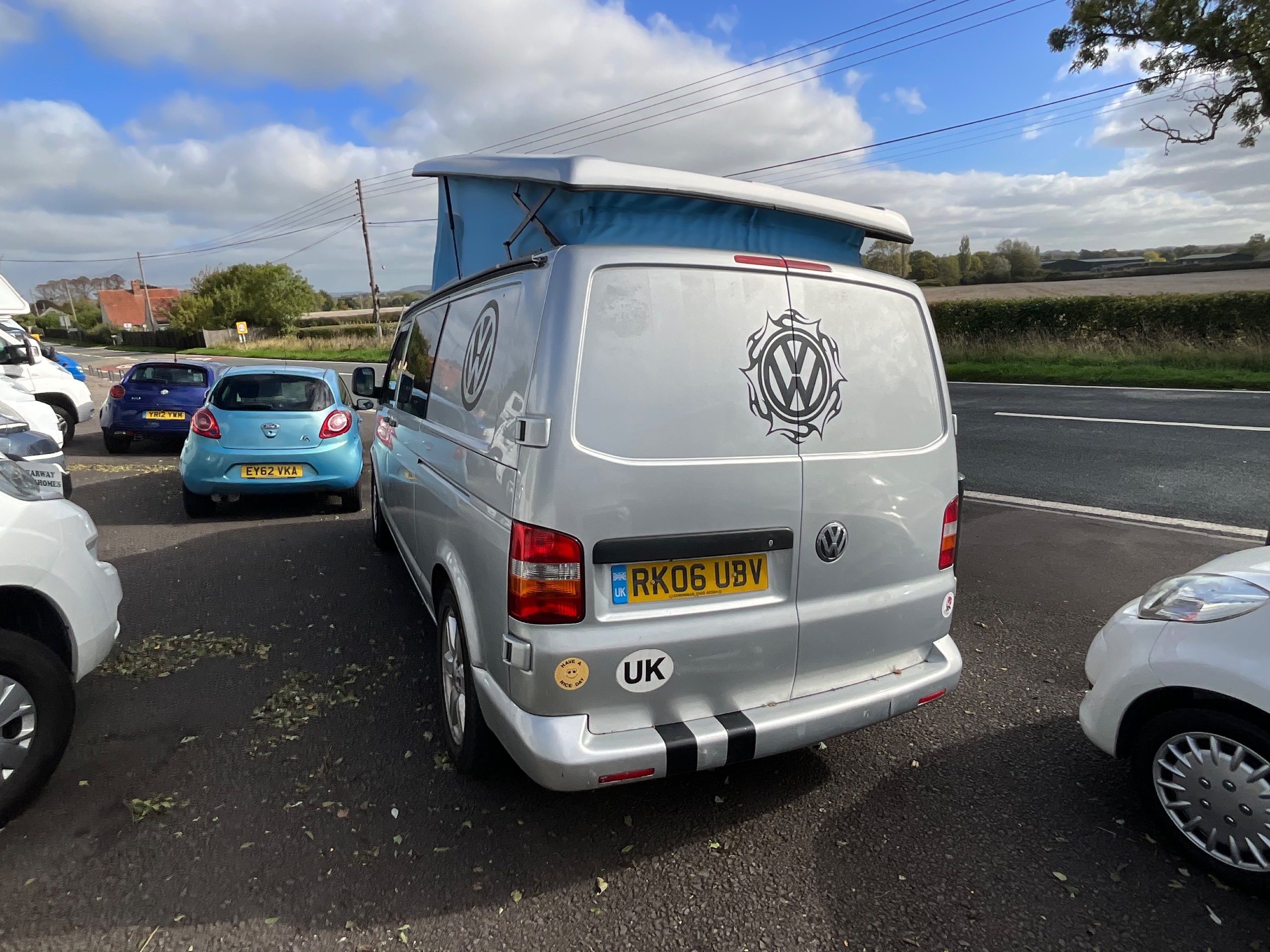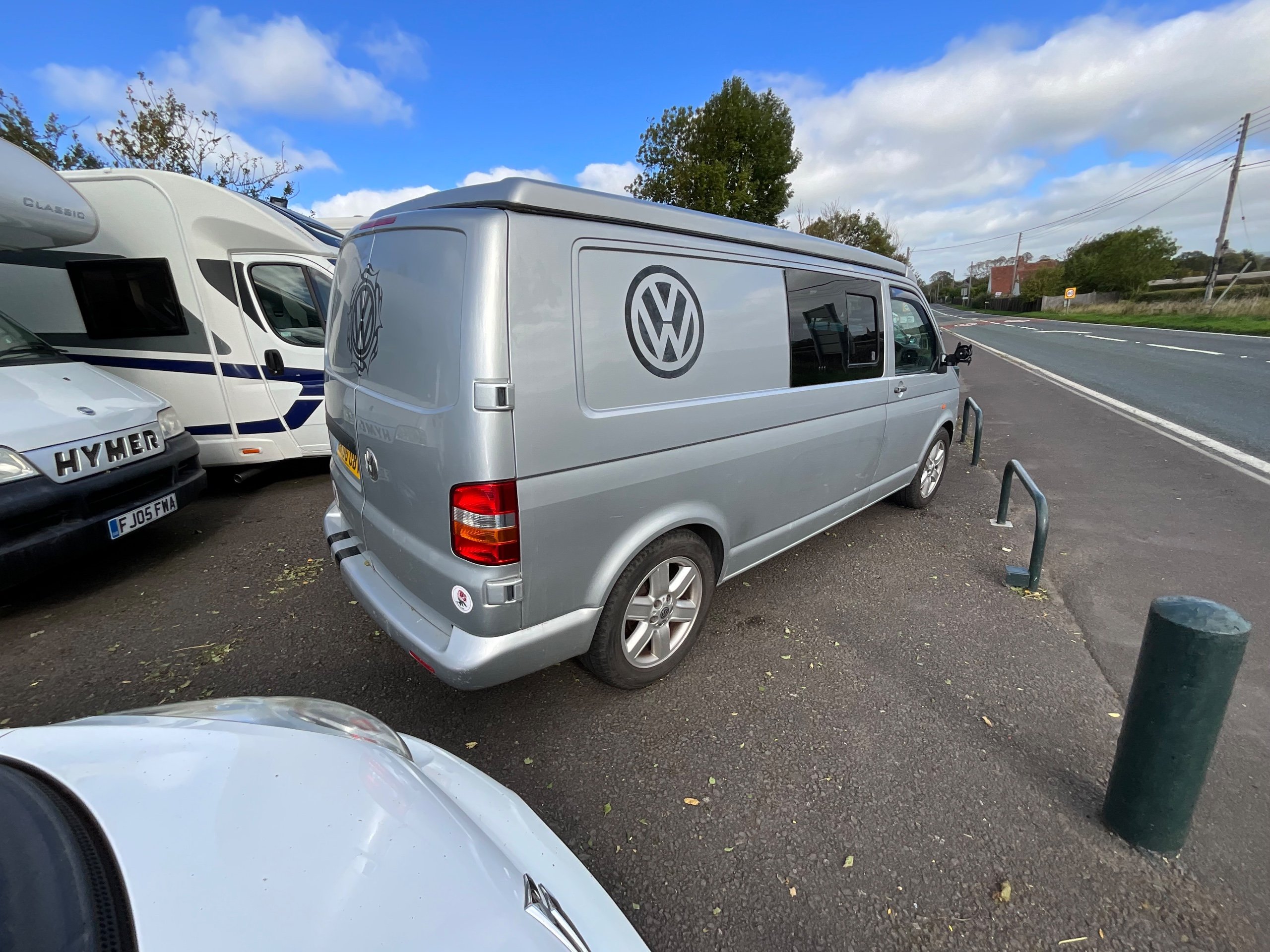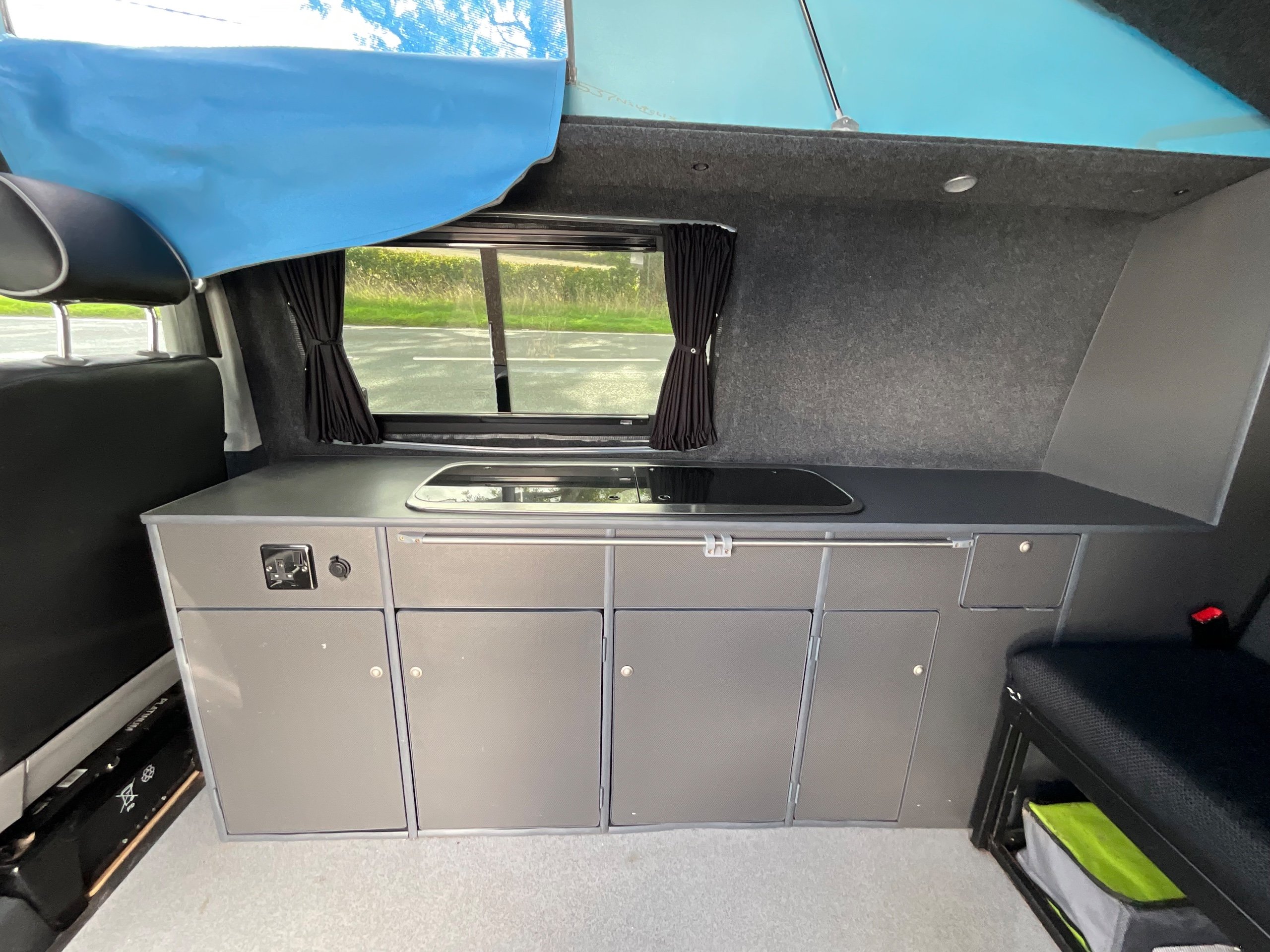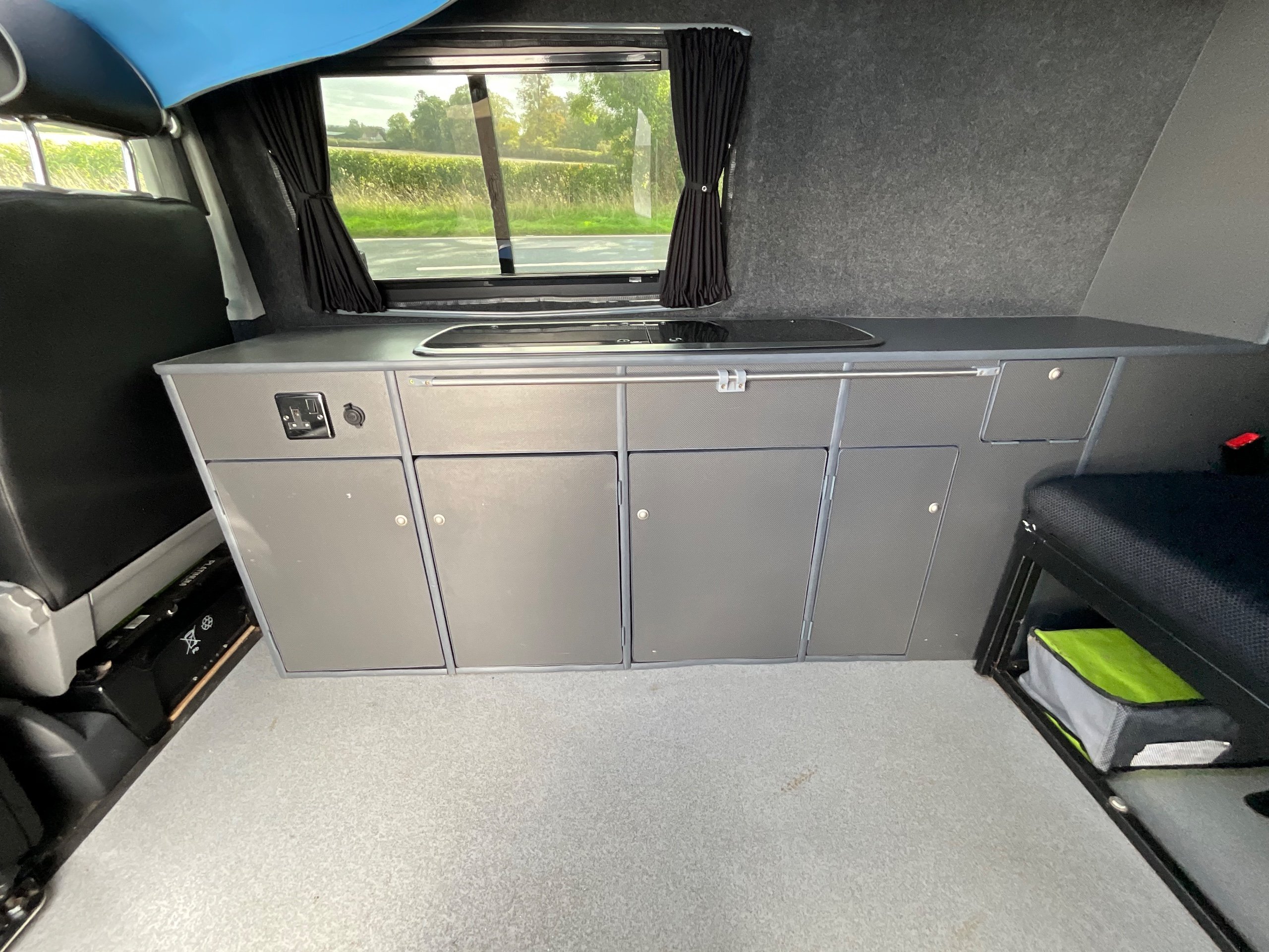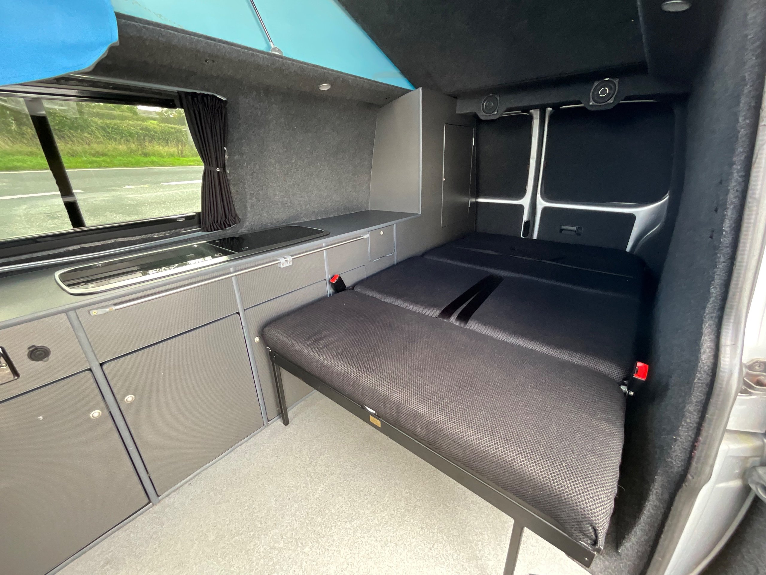 2007 VW campervan offers everything from comfort, practicality. It has been fully converted with black interior fabric, grey units, fabric lined walls with grey non slip flooring. There is also interior light fittings. The VW has been fitted with a hi-lo roof with a coloured canvas and struts, three windows with insect proof netting for the sides and clear fabric at the front. This van is registered as a 5-seater and sleeps 4.