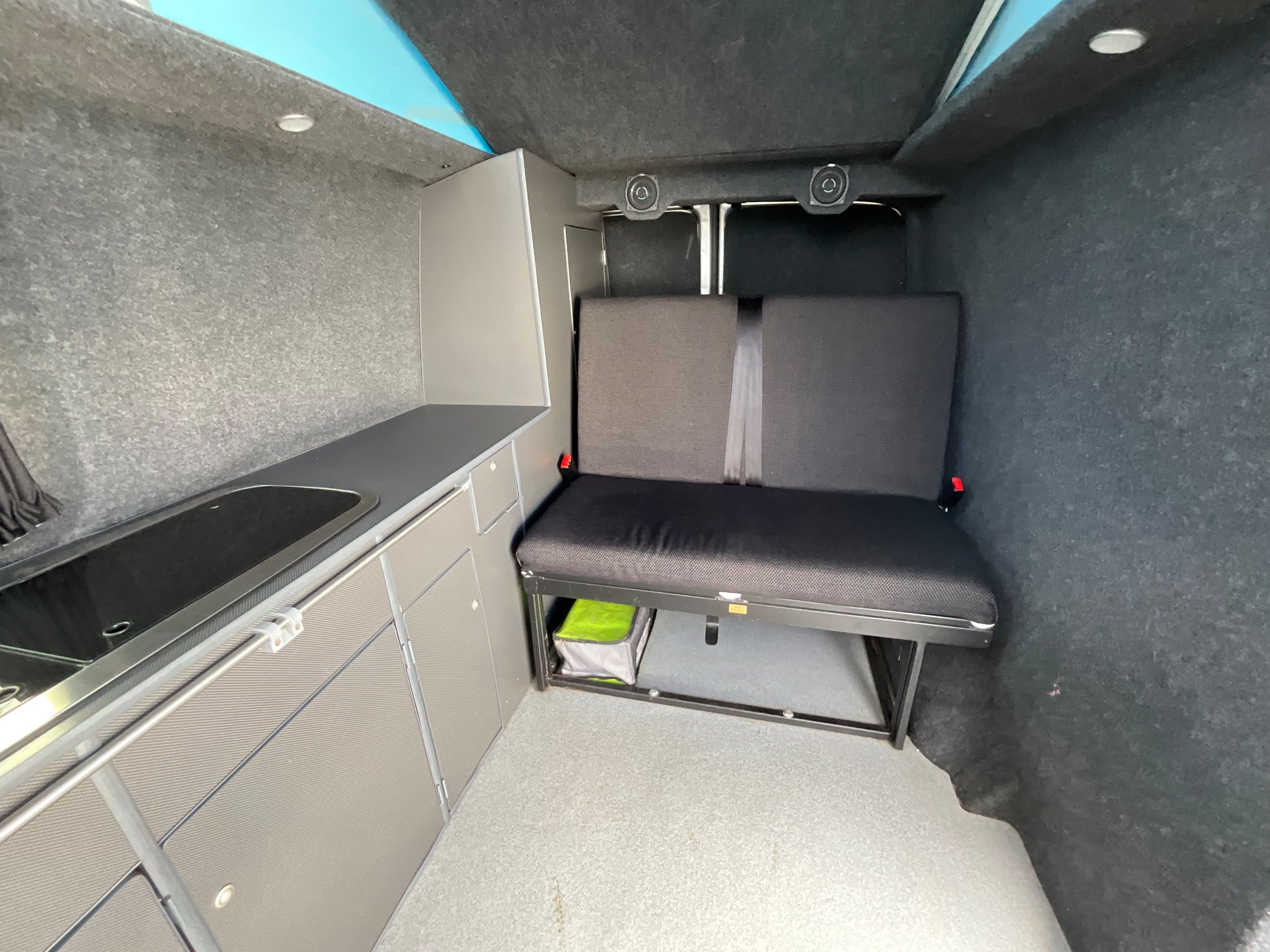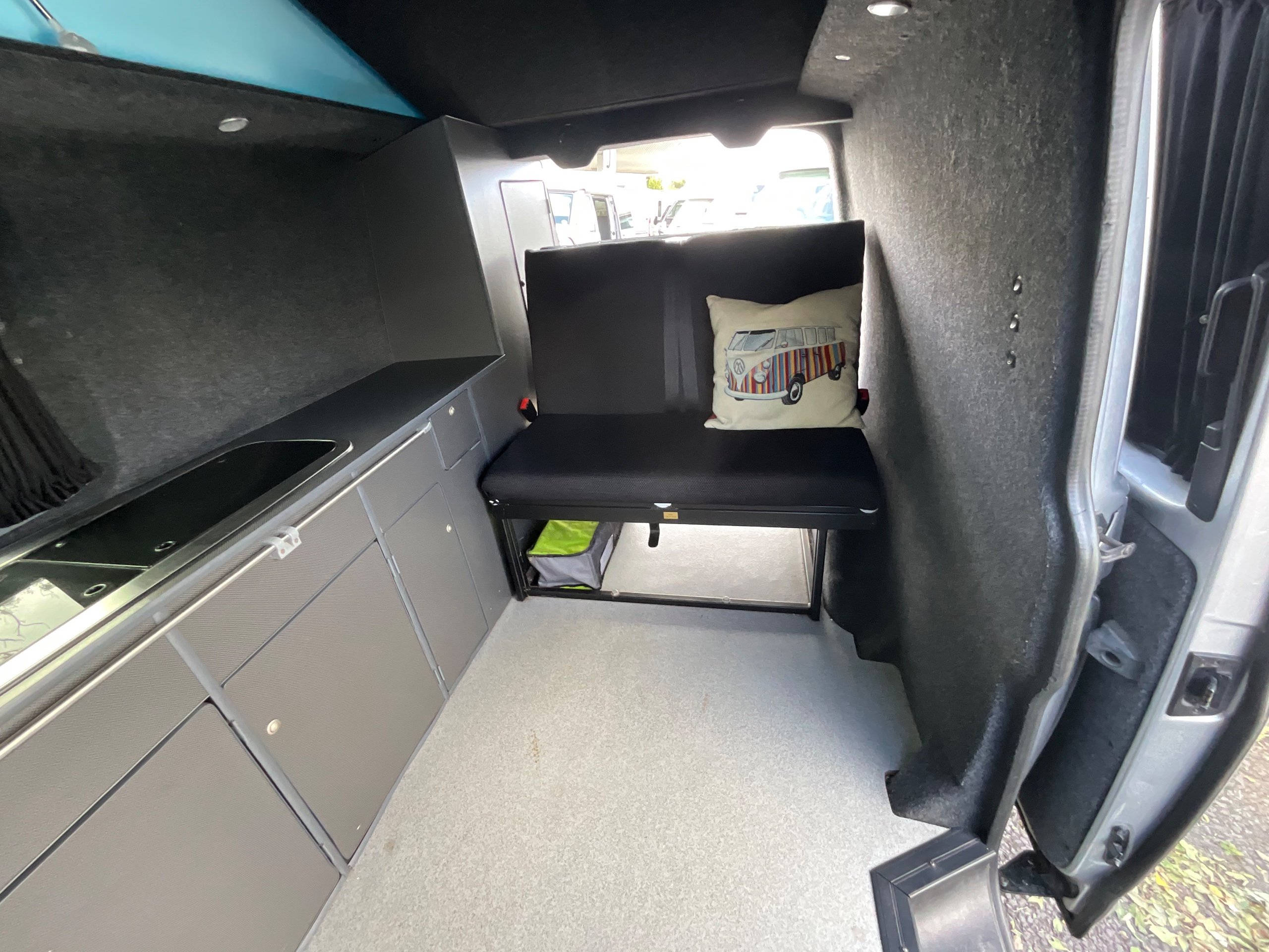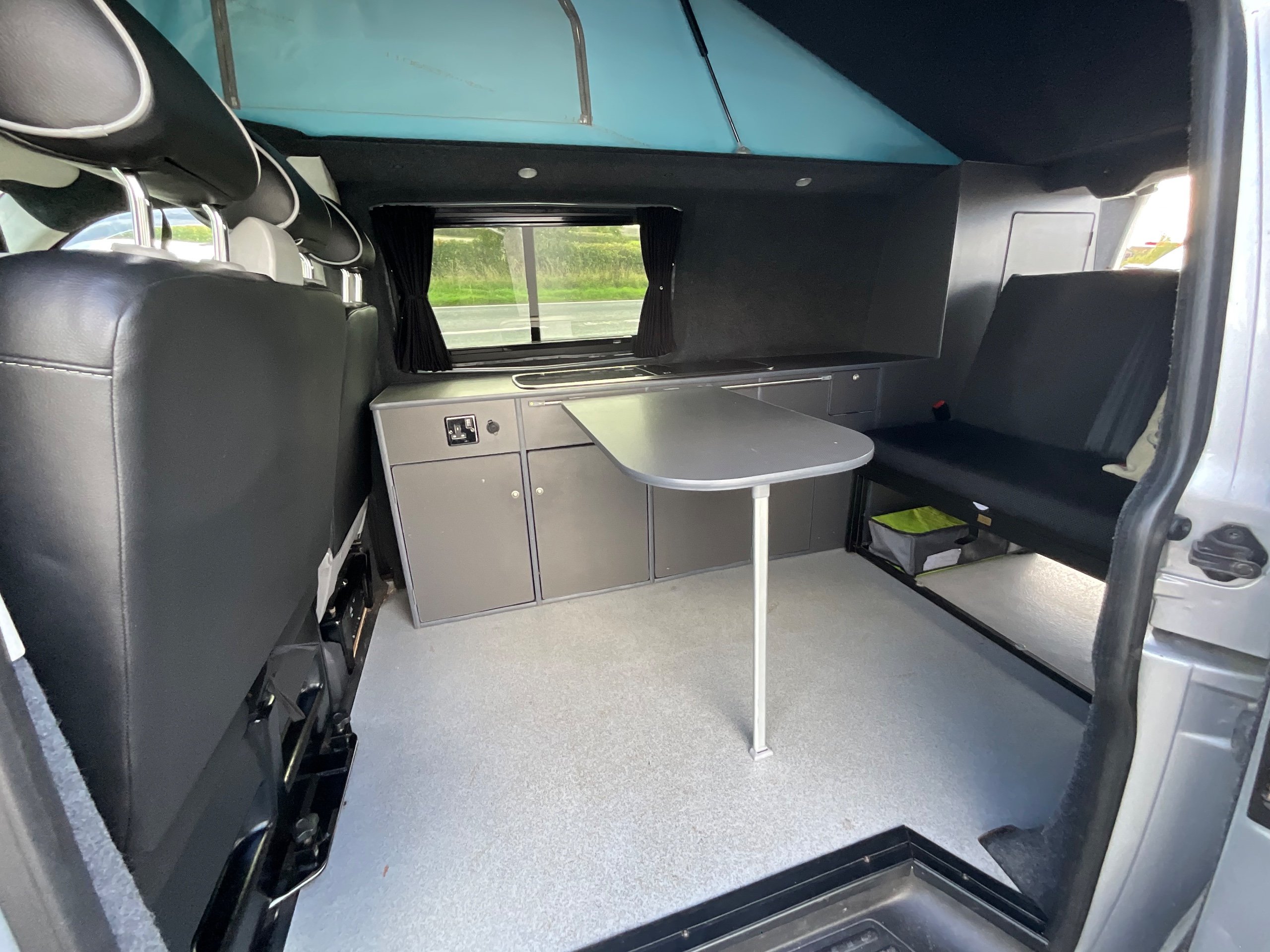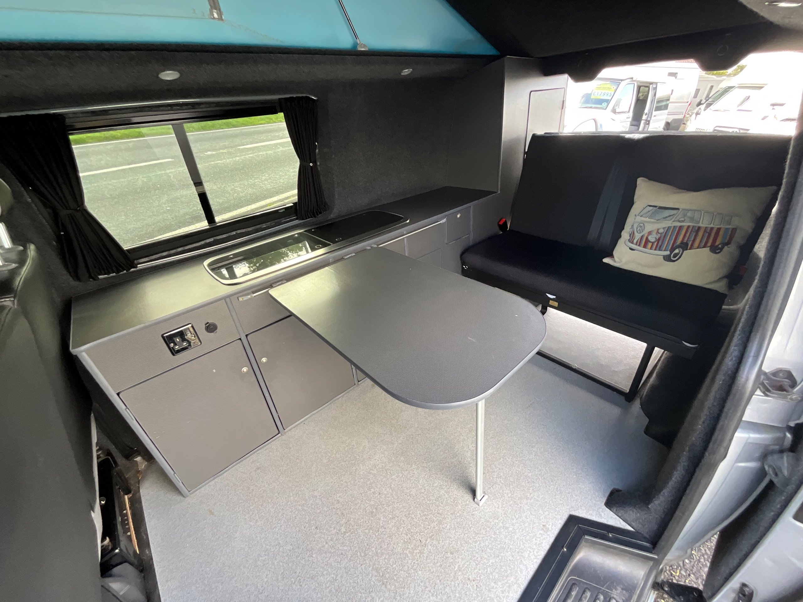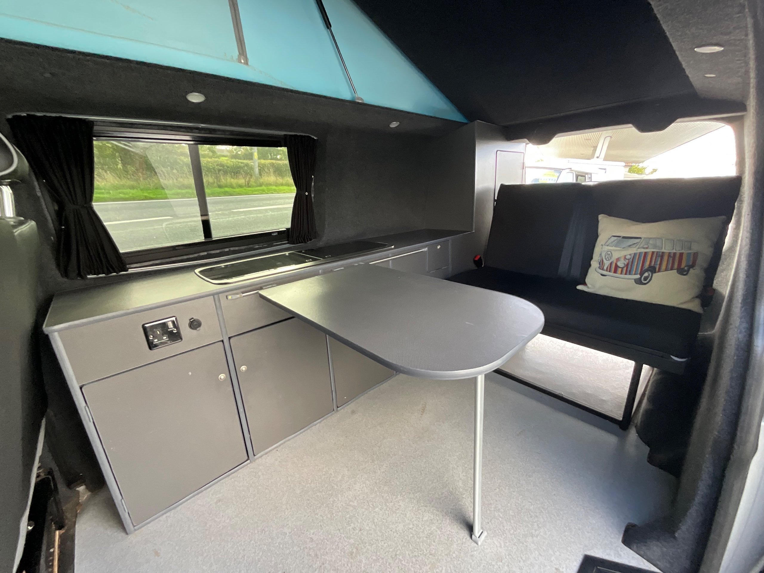The seats in the back are created out of the crash tested and approved rock ānā roll bed (forming a spacious doubled bed) to have the classic VW layout inside, while still having the all the standard comforts as well as belted seats. There is also a removeable table. A double swivel seat for extending the social space and ease of sleeping upstairs. There is also a domestic double gas hob (working off a camping gas bottle), and a sink with an electrical water pump which is connected to a fresh water container. There is also 240V hook up. The van has plenty of storage throughout the motorhome as well.