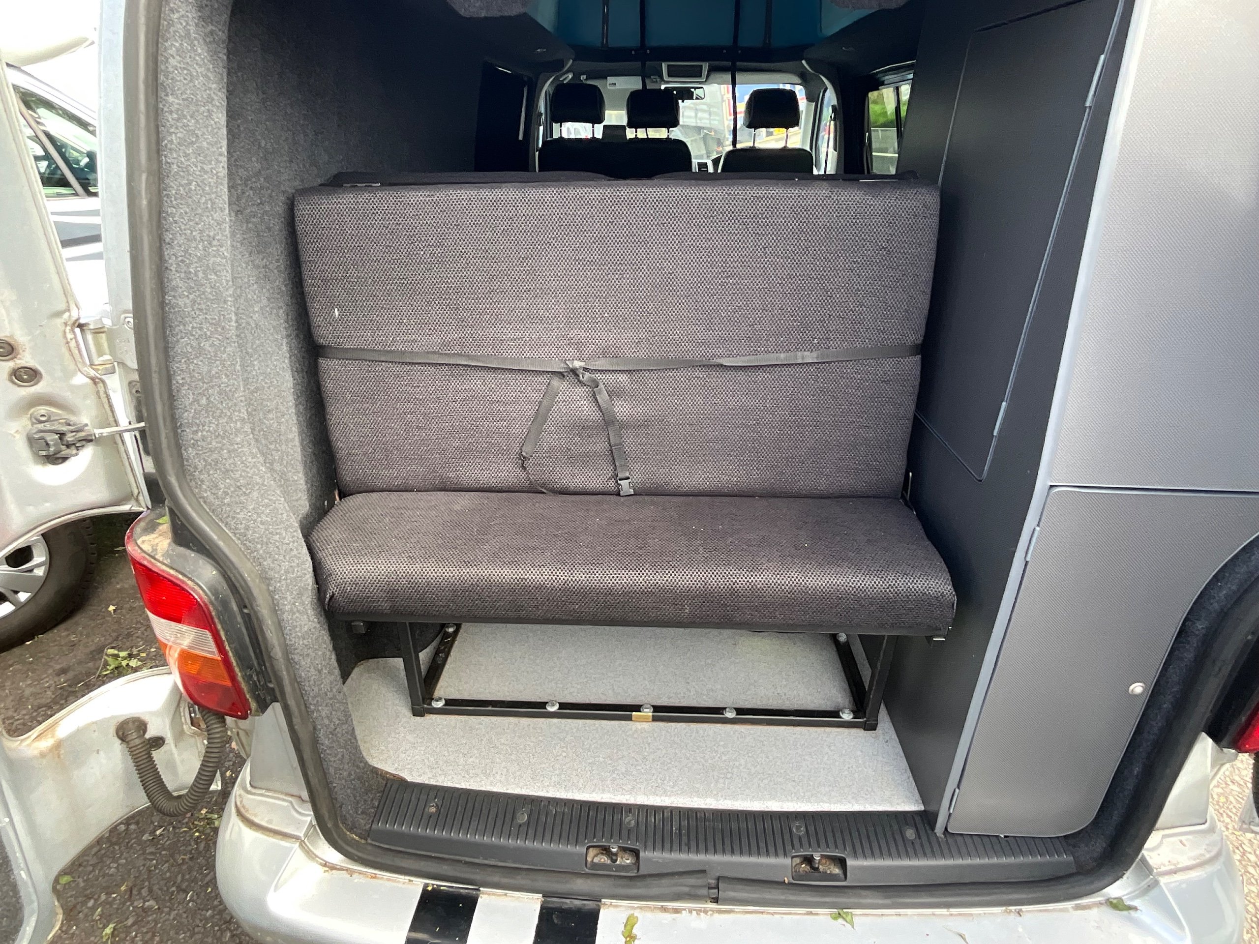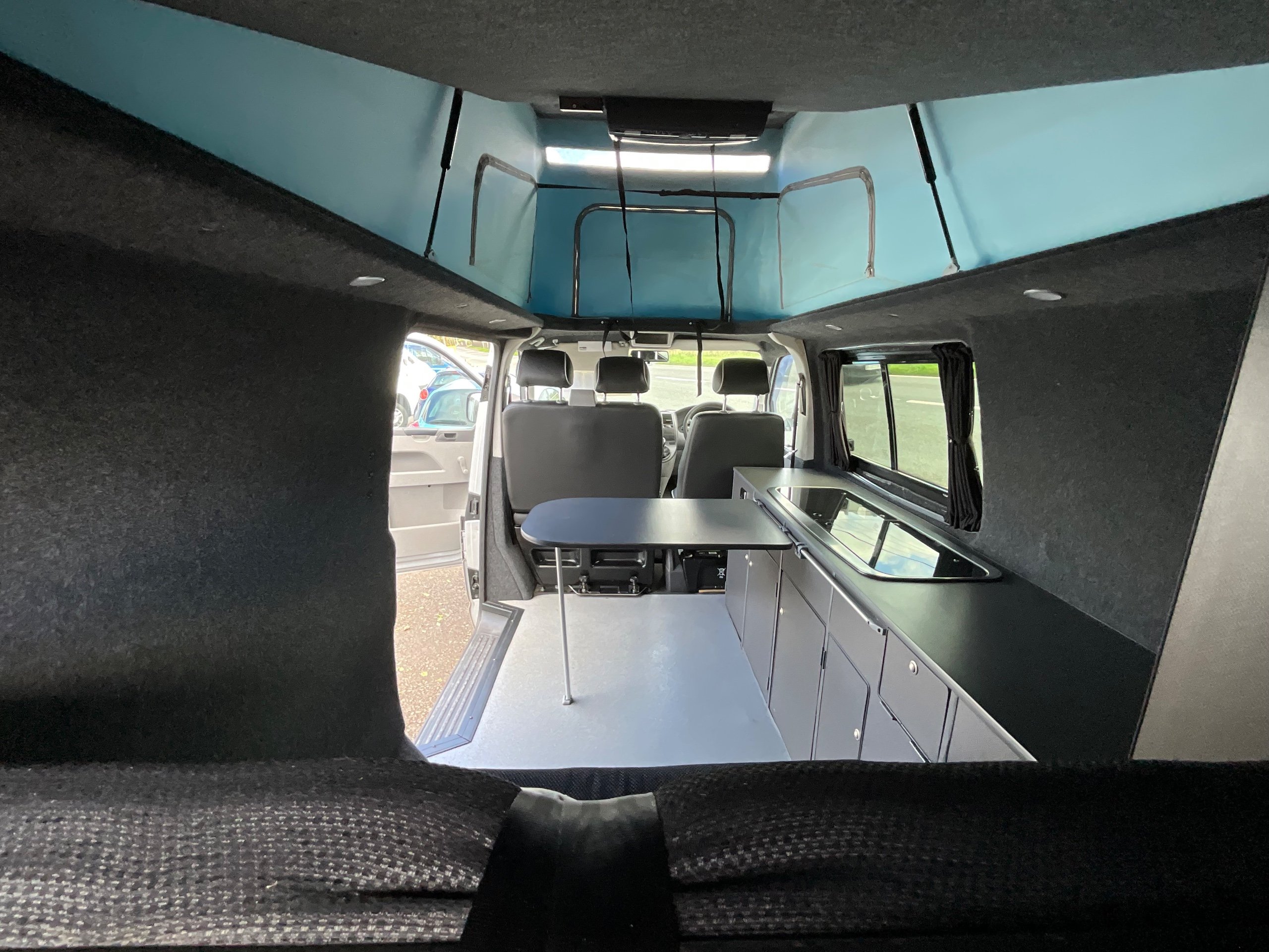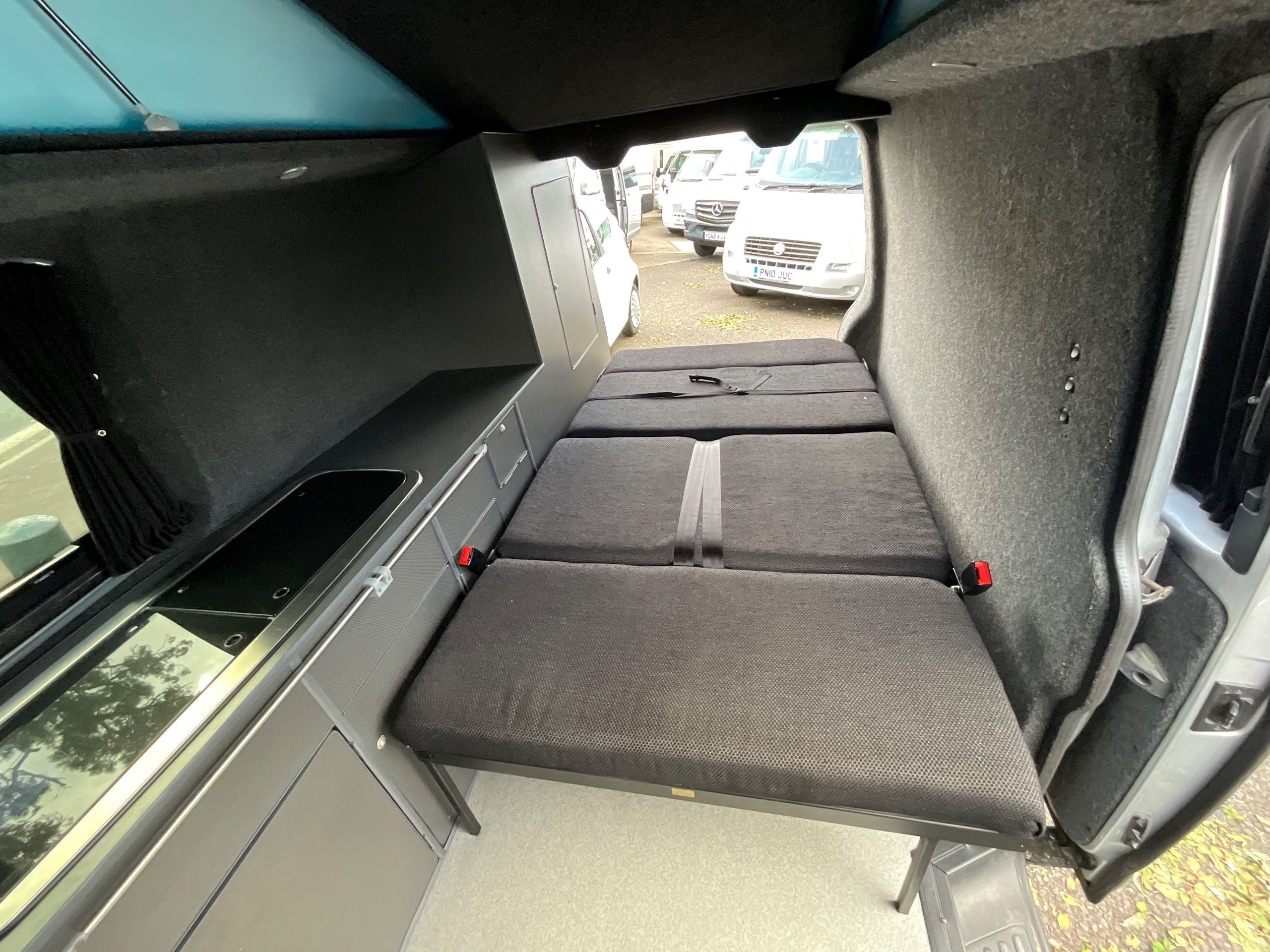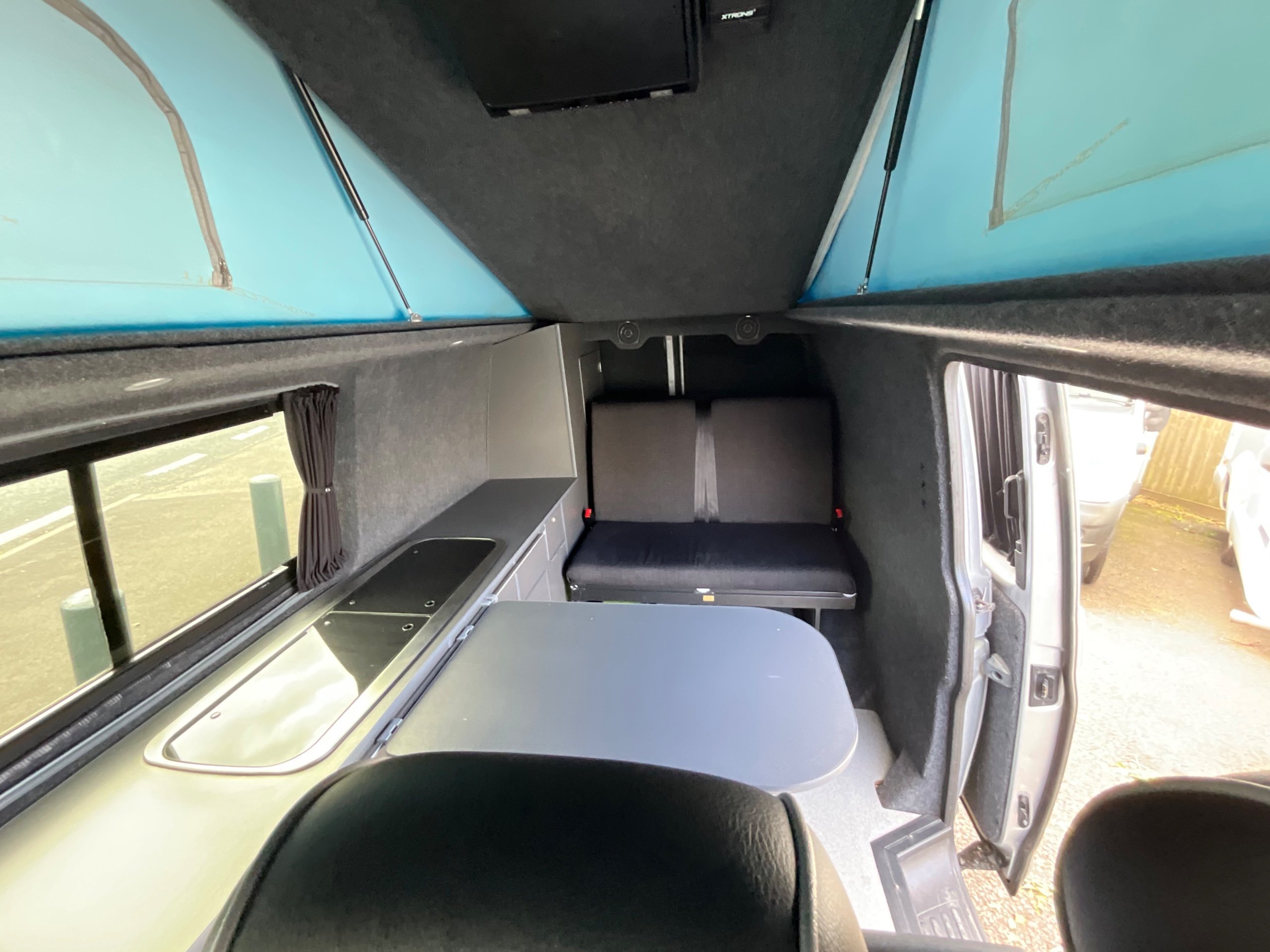 The seats in the back are created out of the crash tested and approved rock ānā roll bed (forming a spacious doubled bed) to have the classic VW layout inside, while still having the all the standard comforts as well as belted seats. There is also a removeable table. A double swivel seat for extending the social space and ease of sleeping upstairs. There is also a domestic double gas hob (working off a camping gas bottle), and a sink with an electrical water pump which is connected to a fresh water container. There is also 240V hook up. The van has plenty of storage throughout the motorhome as well.