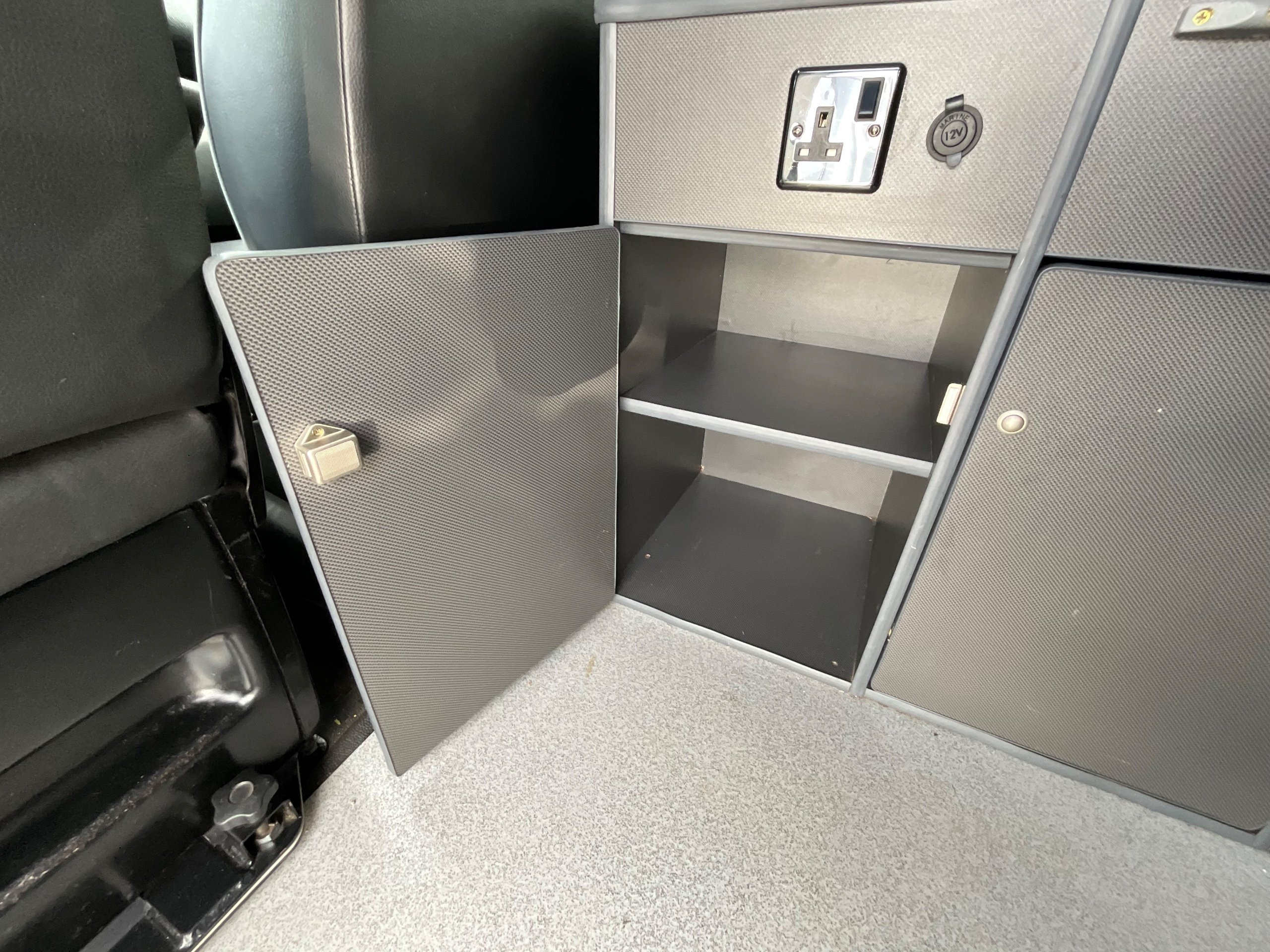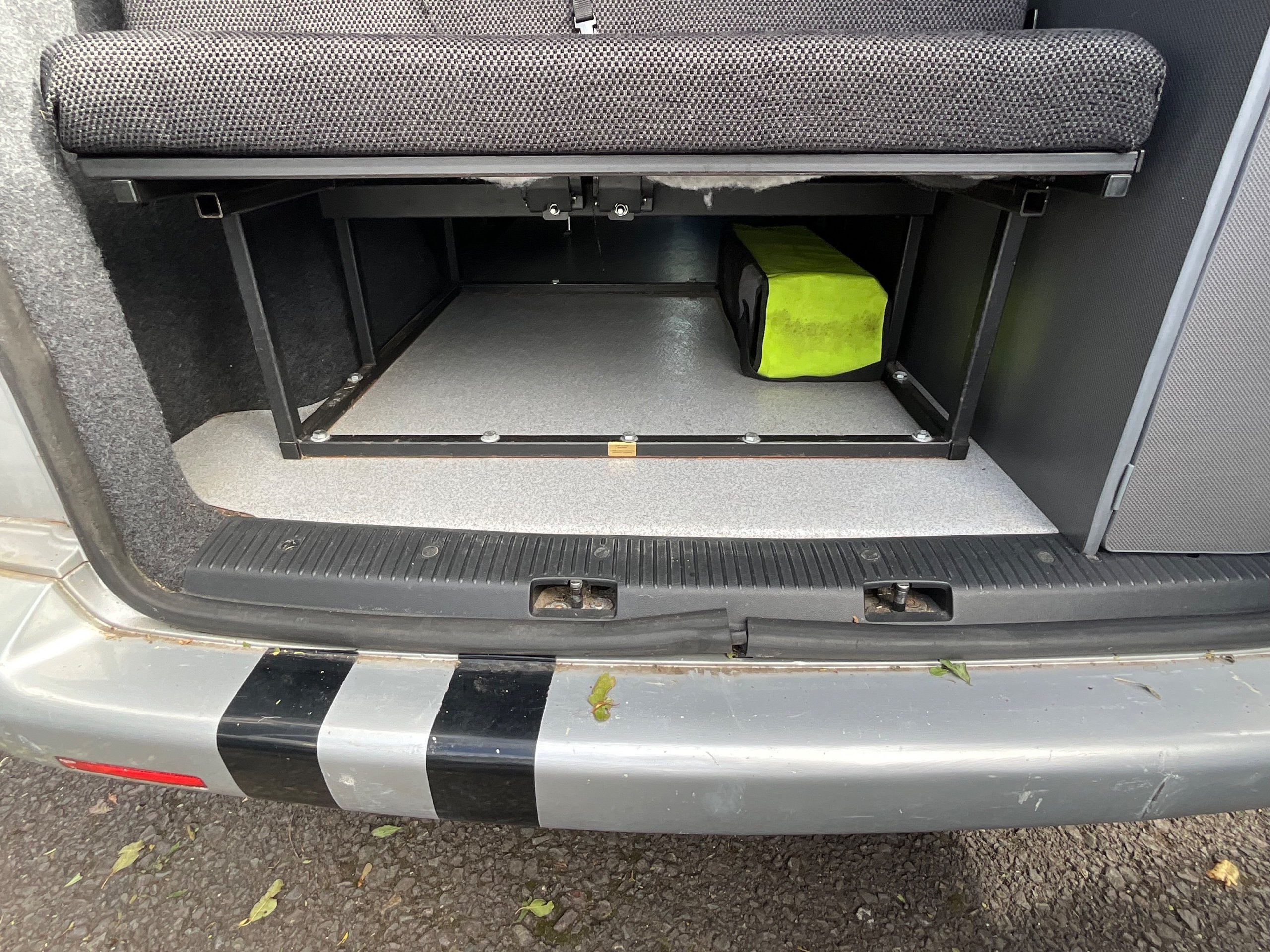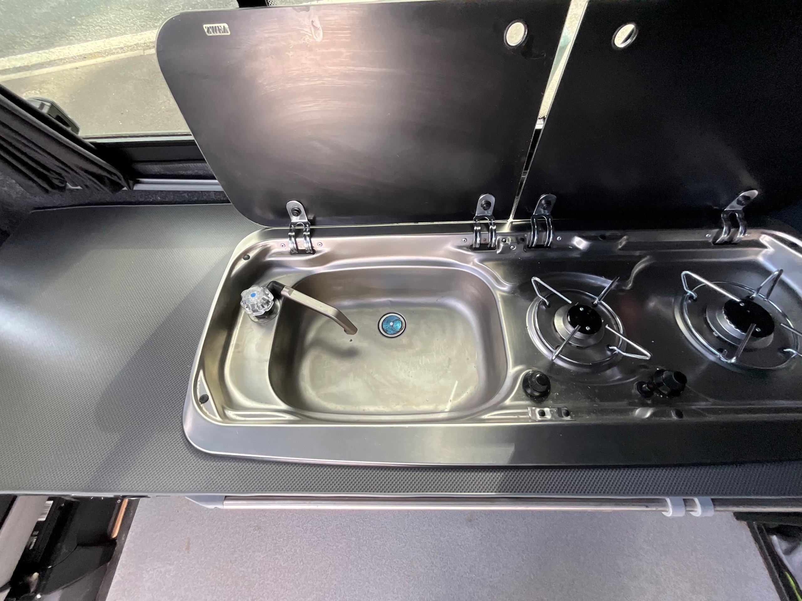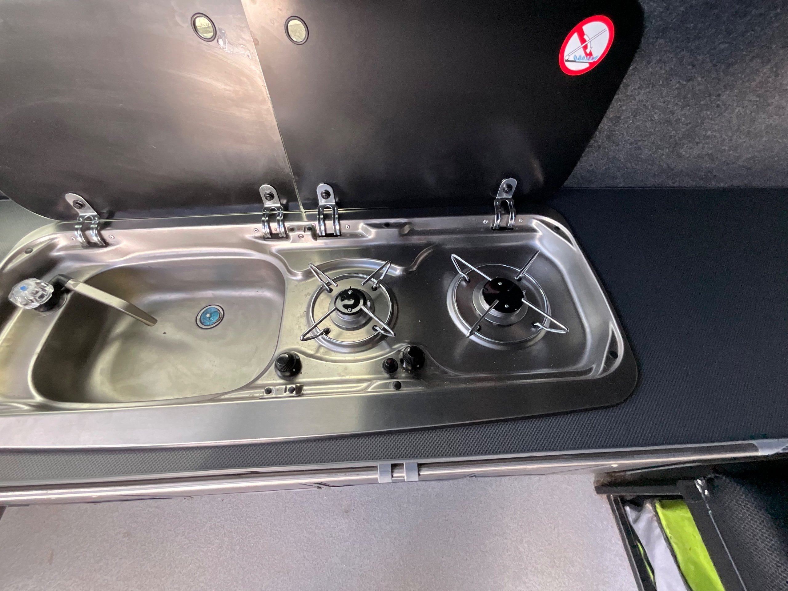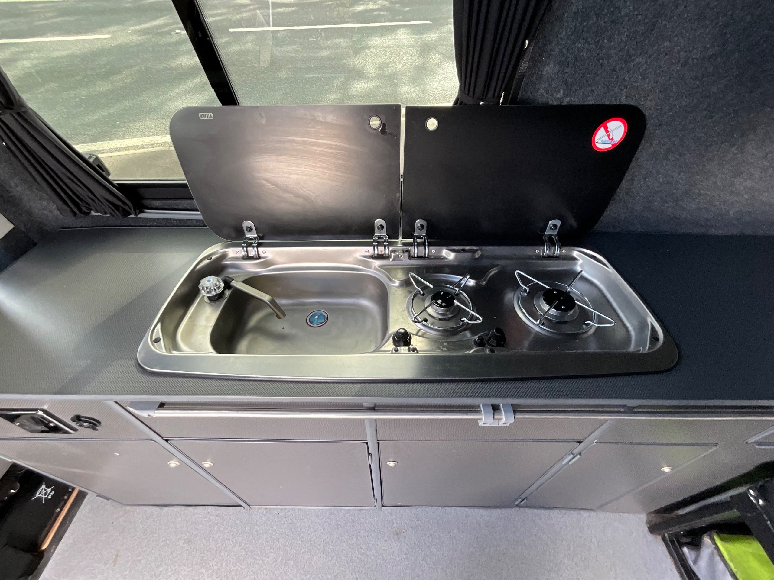 The seats in the back are created out of the crash tested and approved rock ānā roll bed (forming a spacious doubled bed) to have the classic VW layout inside, while still having the all the standard comforts as well as belted seats. There is also a removeable table. A double swivel seat for extending the social space and ease of sleeping upstairs. There is also a domestic double gas hob (working off a camping gas bottle), and a sink with an electrical water pump which is connected to a fresh water container. There is also 240V hook up. The van has plenty of storage throughout the motorhome as well.