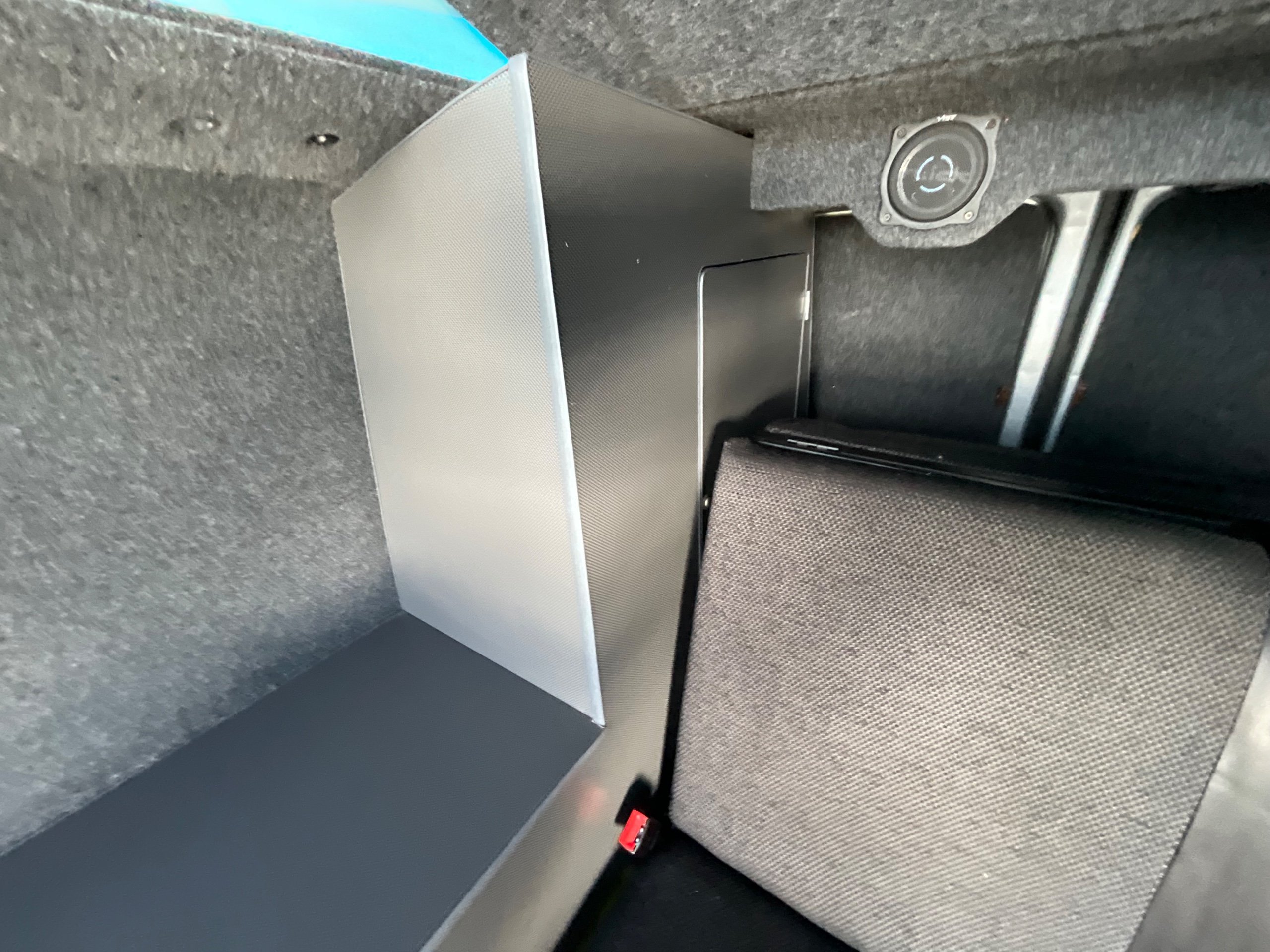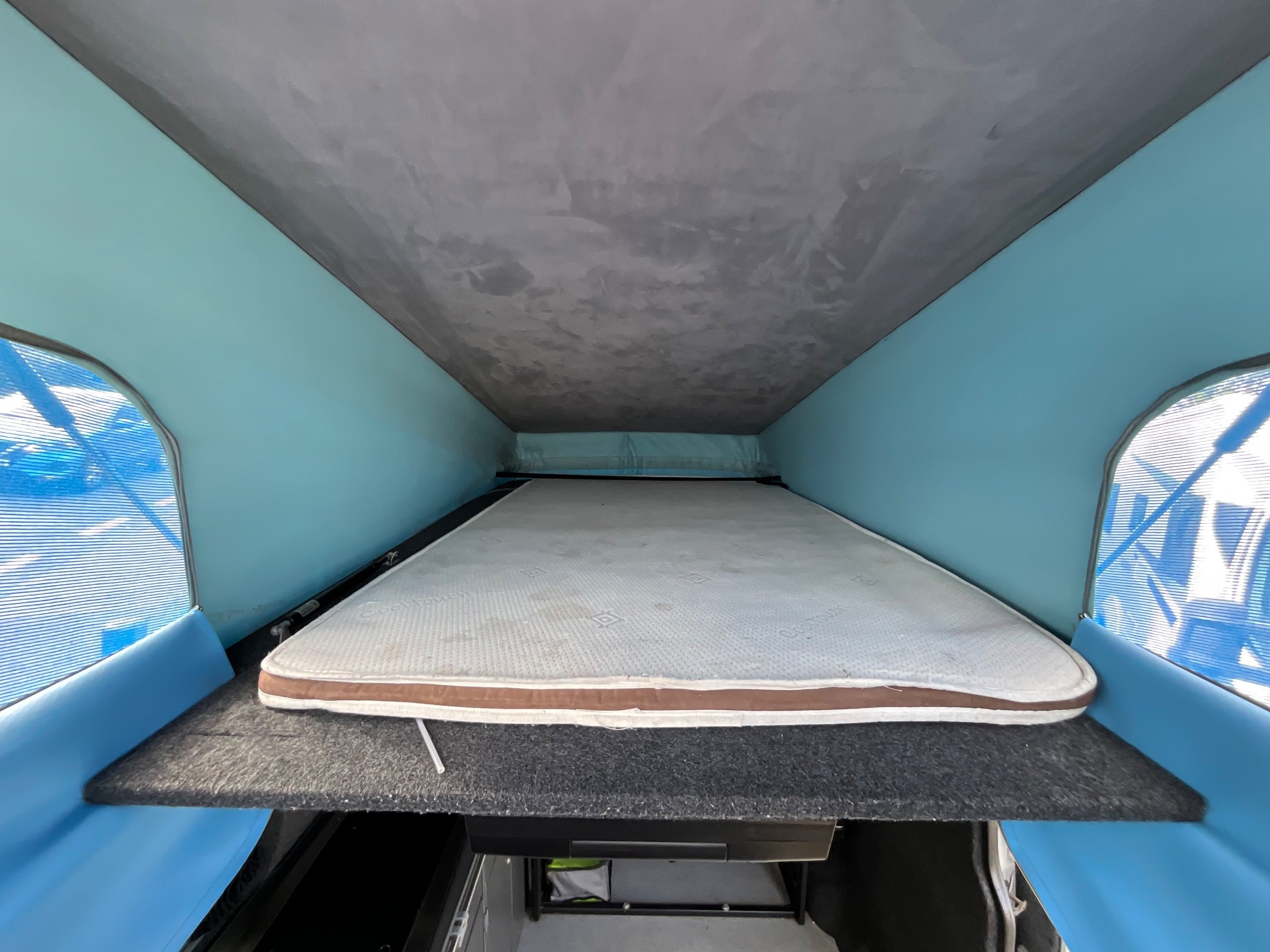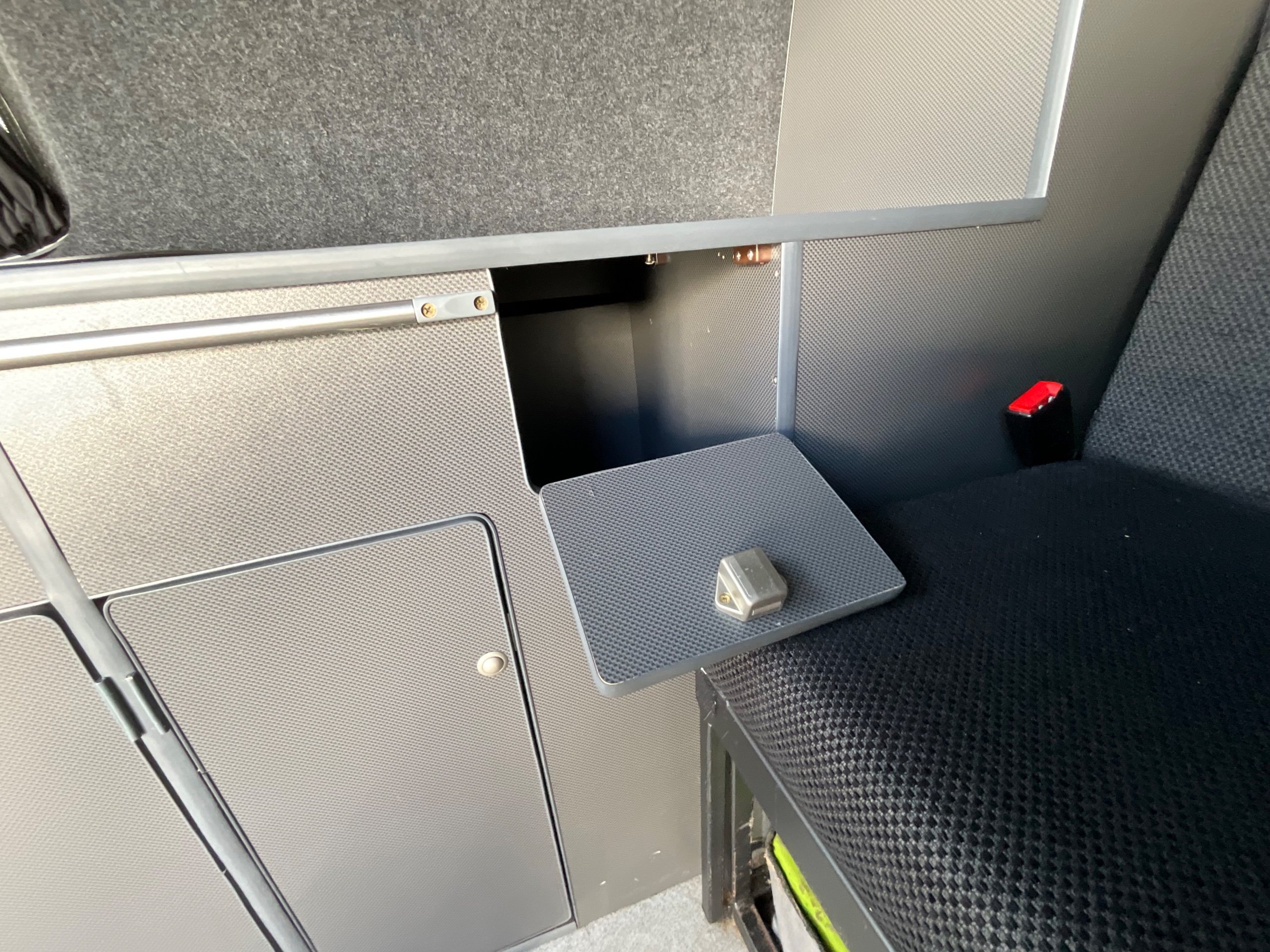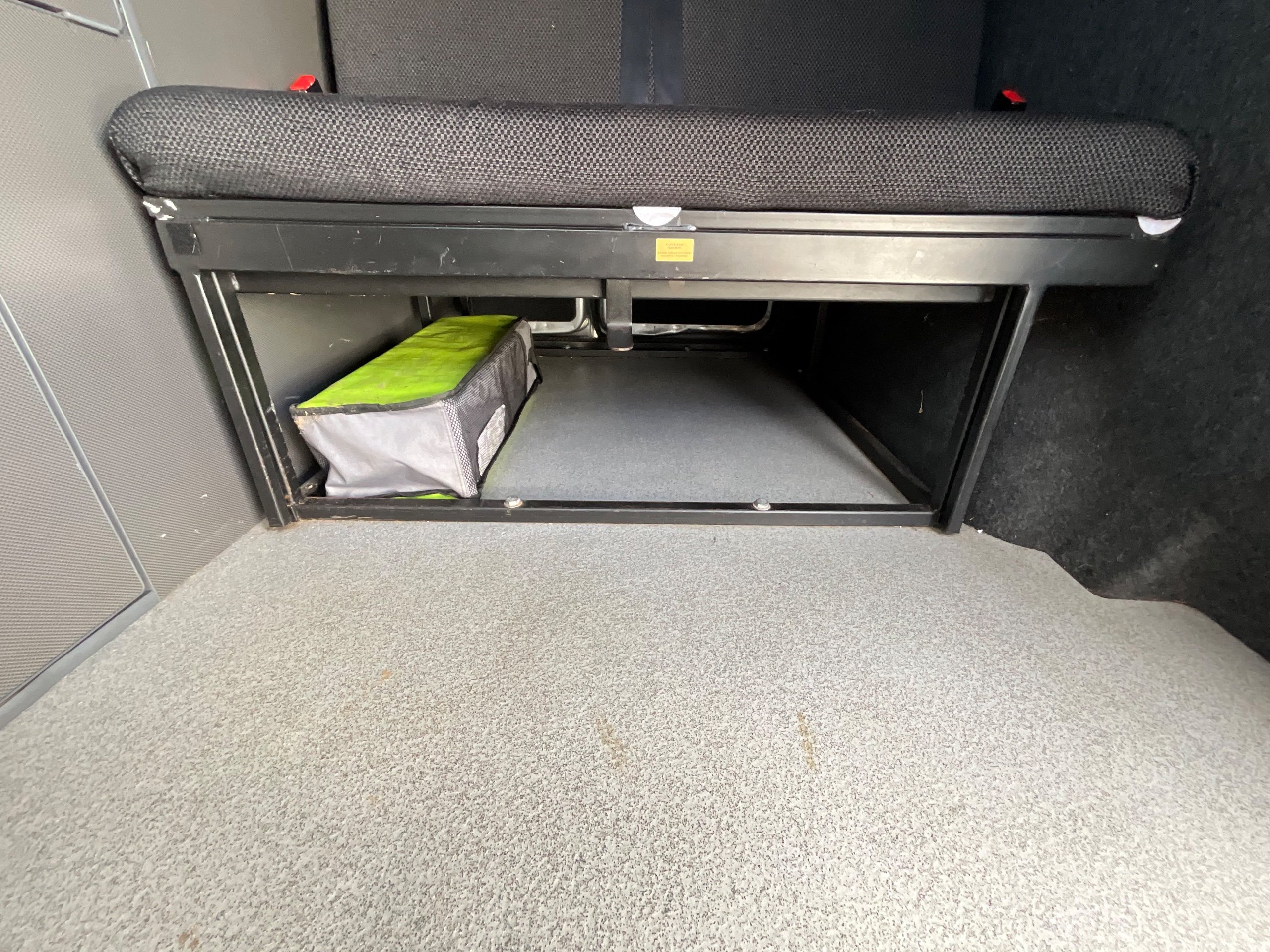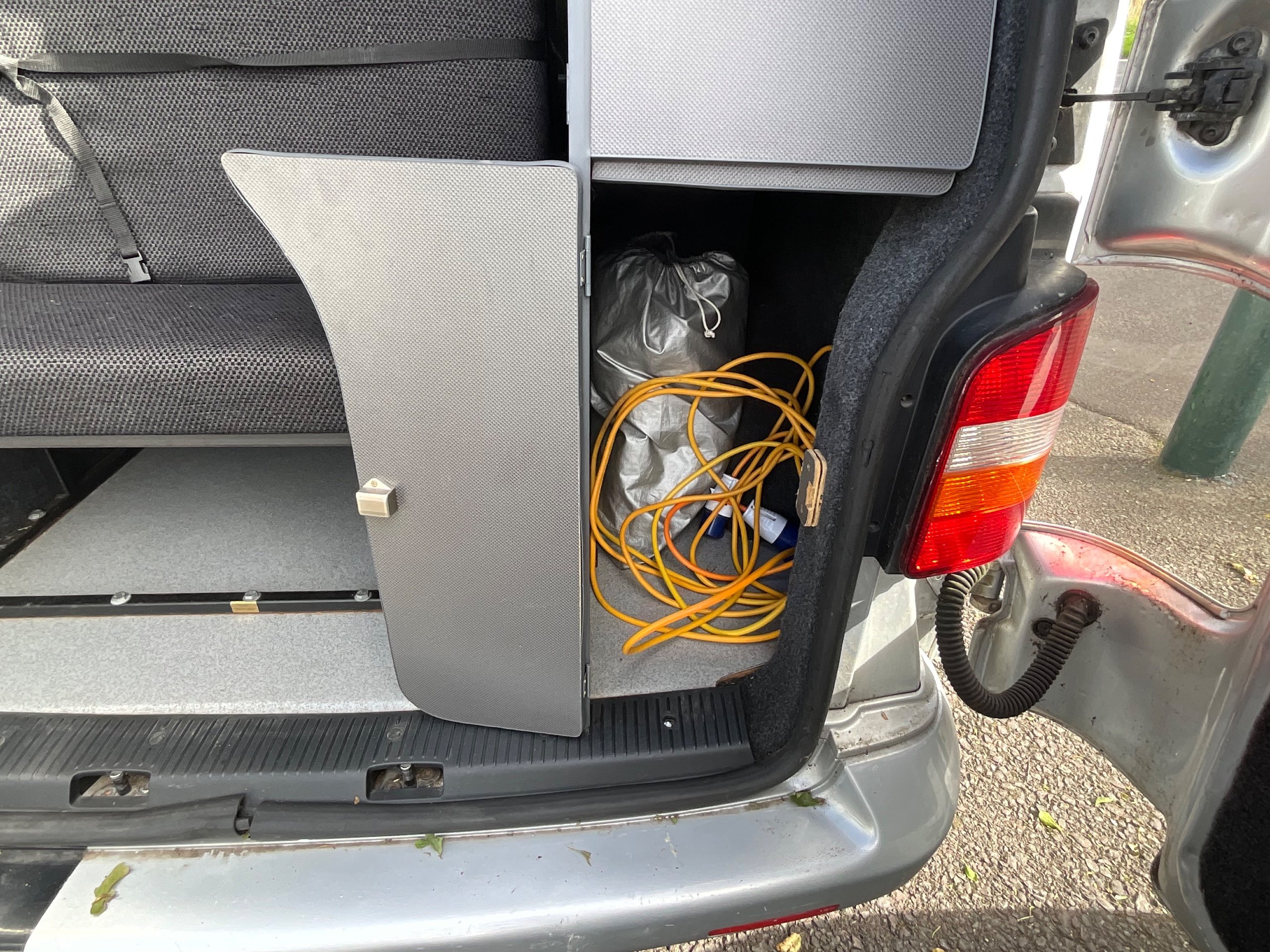 The seats in the back are created out of the crash tested and approved rock ānā roll bed (forming a spacious doubled bed) to have the classic VW layout inside, while still having the all the standard comforts as well as belted seats. There is also a removeable table. A double swivel seat for extending the social space and ease of sleeping upstairs. There is also a domestic double gas hob (working off a camping gas bottle), and a sink with an electrical water pump which is connected to a fresh water container. There is also 240V hook up. The van has plenty of storage throughout the motorhome as well.