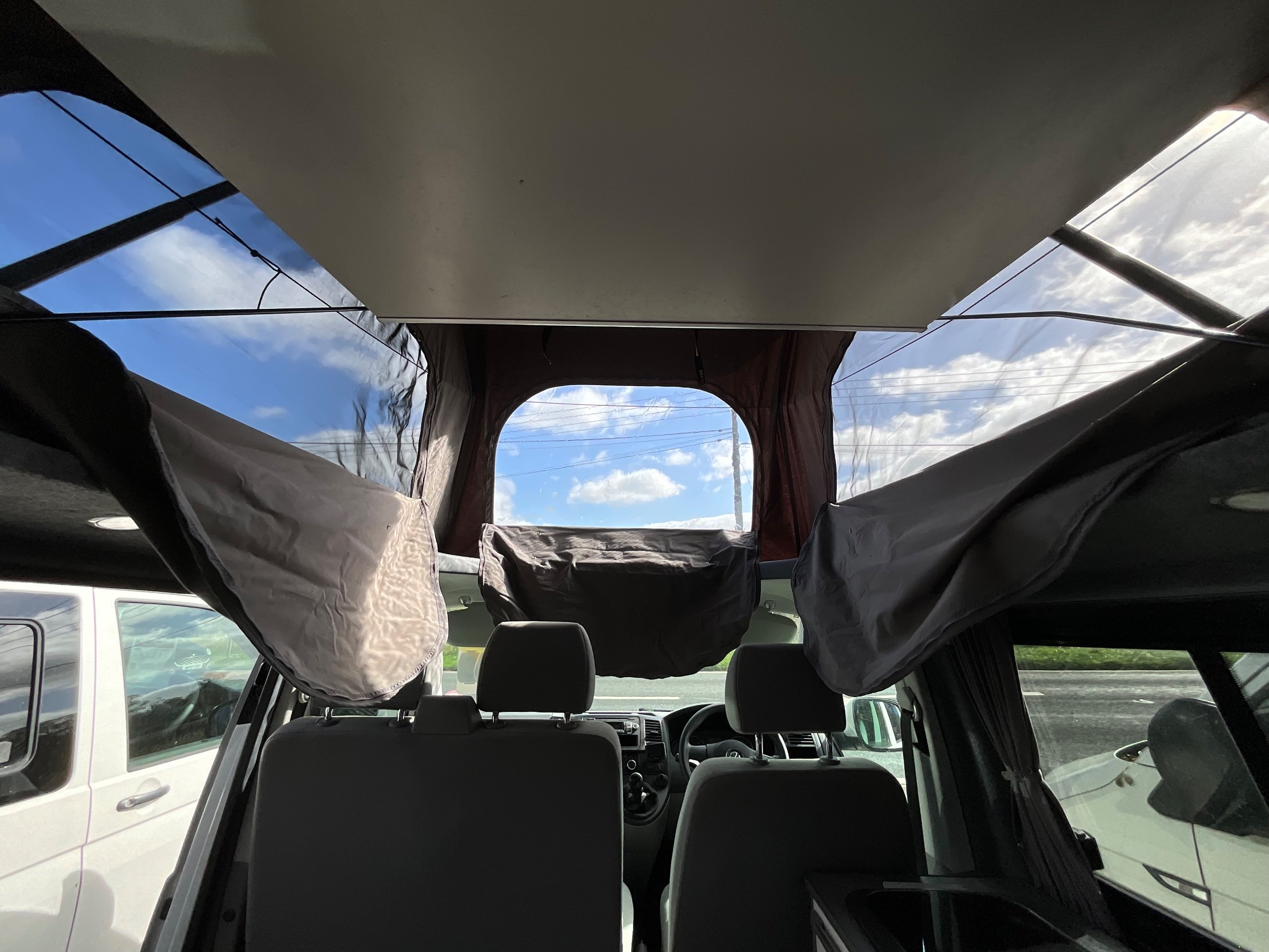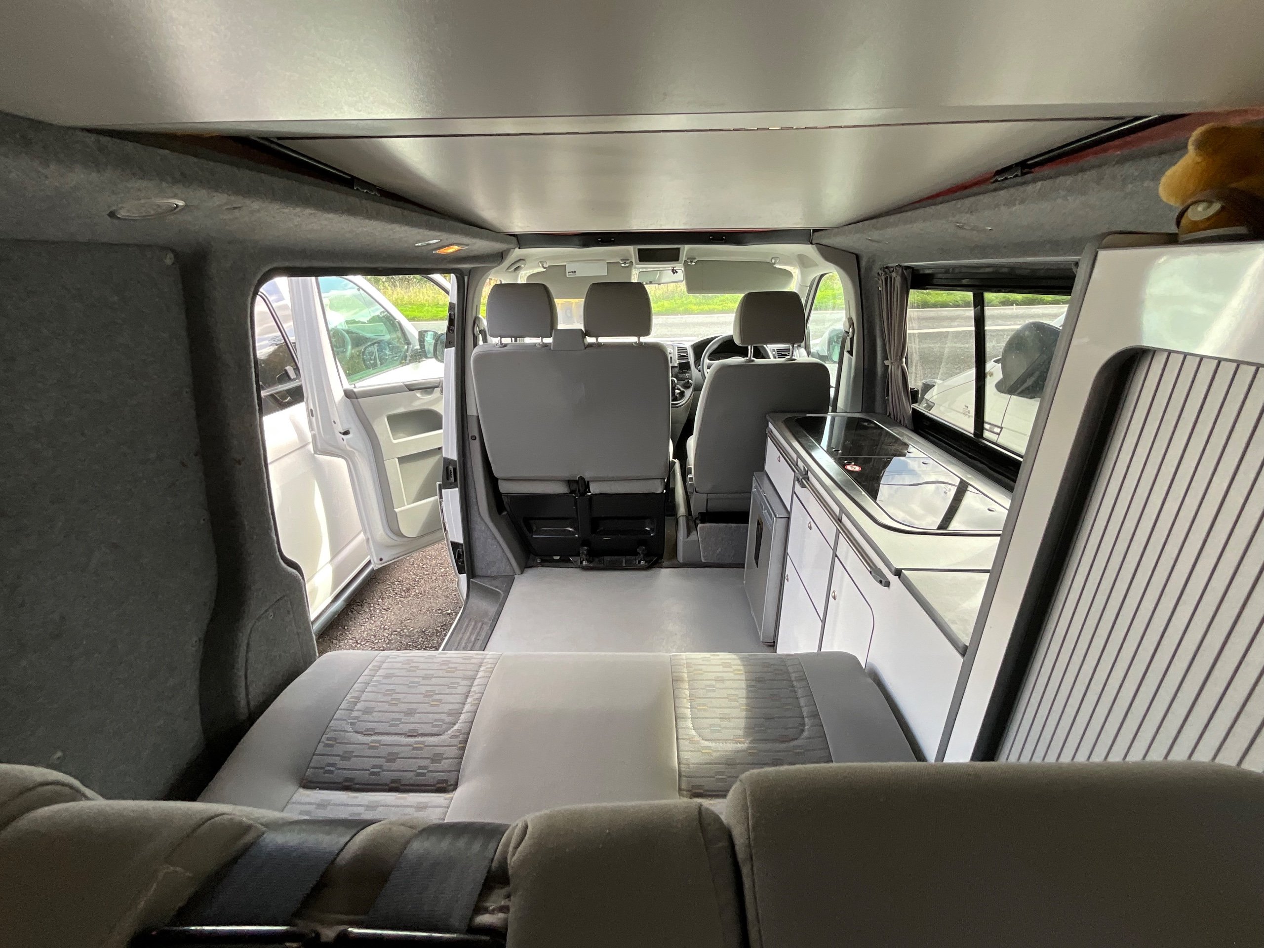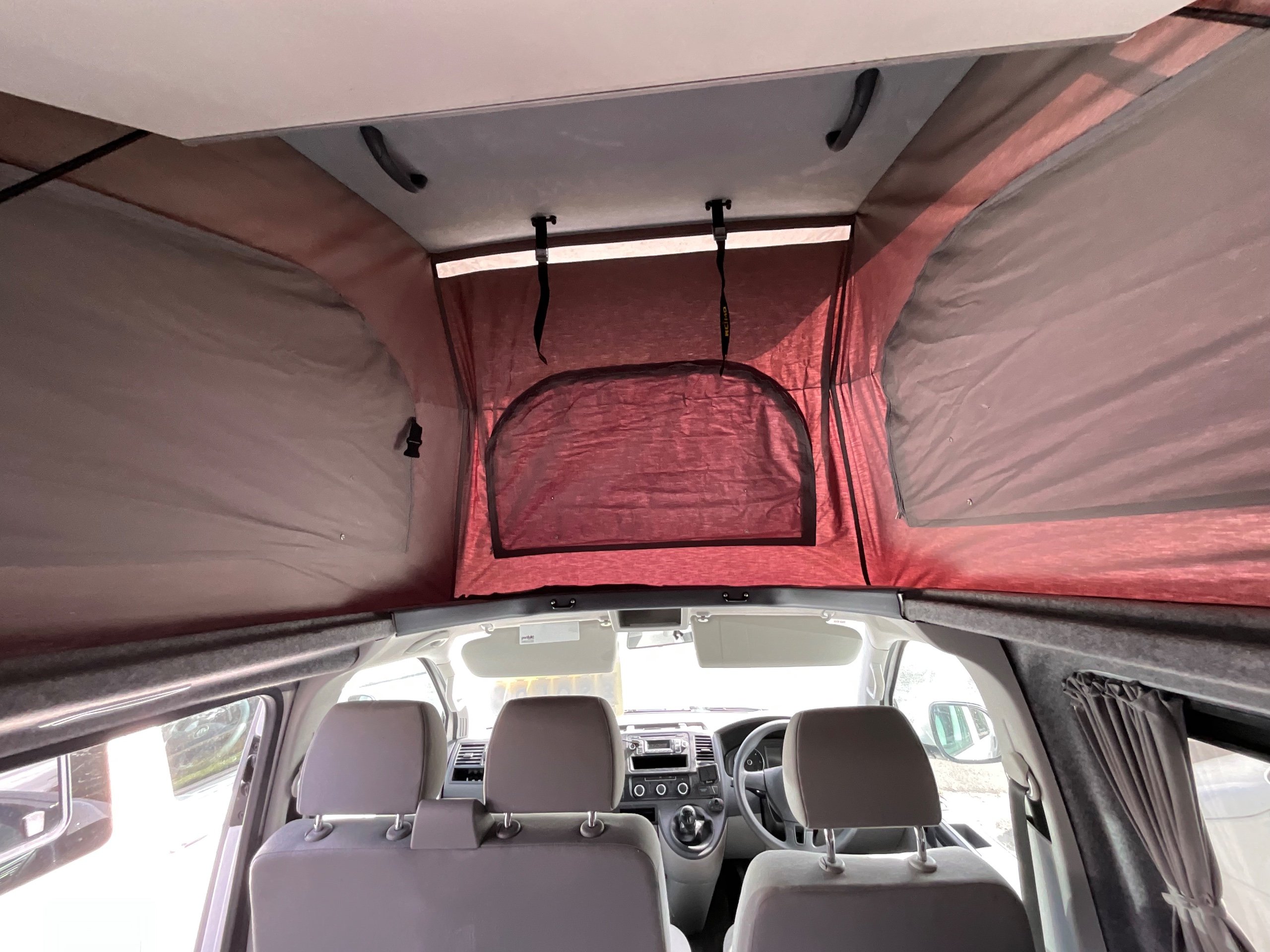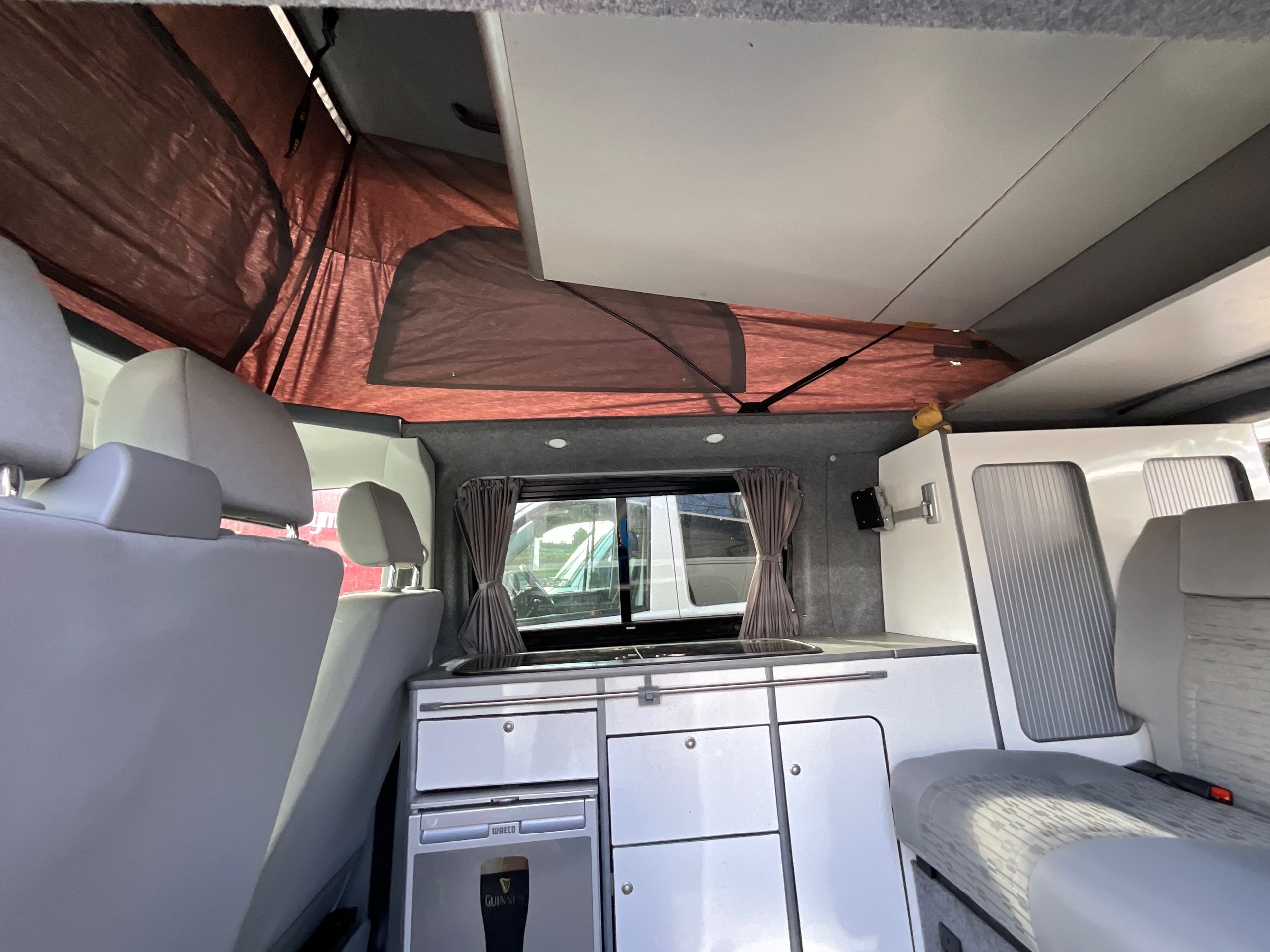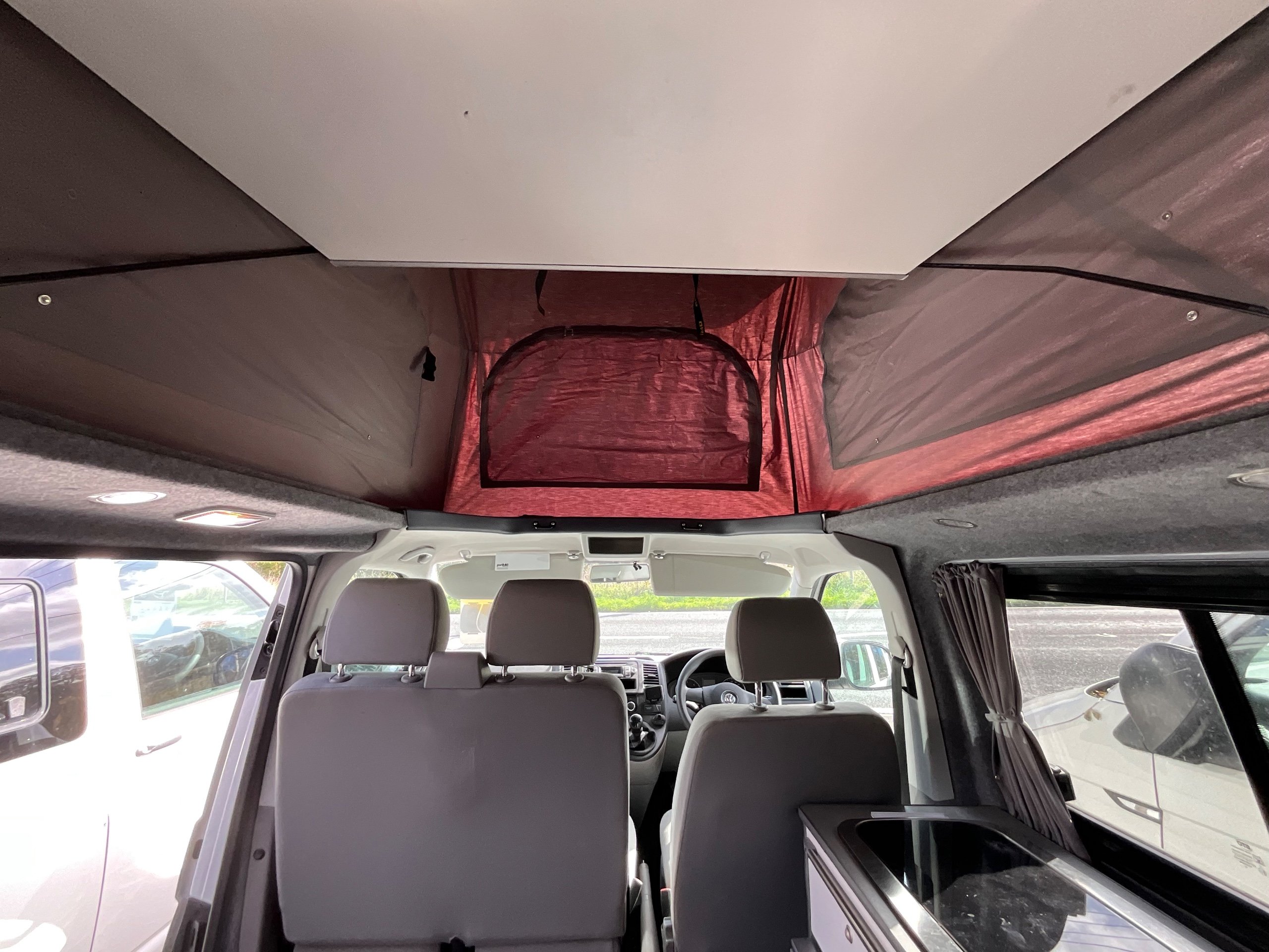 2014 VW campervan offers everything from comfort, practicality, Built in Radio with Bluetooth shows its quality. It has been fully converted with grey interior fabric, white units, fabric lined walls with grey non slip flooring. There is also interior light fittings. The VW has been fitted with a hi-lo Remio roof with a coloured canvas and struts, three windows with insect proof netting for the sides and clear fabric at the front. This van is registered as a 5-seater and sleeps 4.
