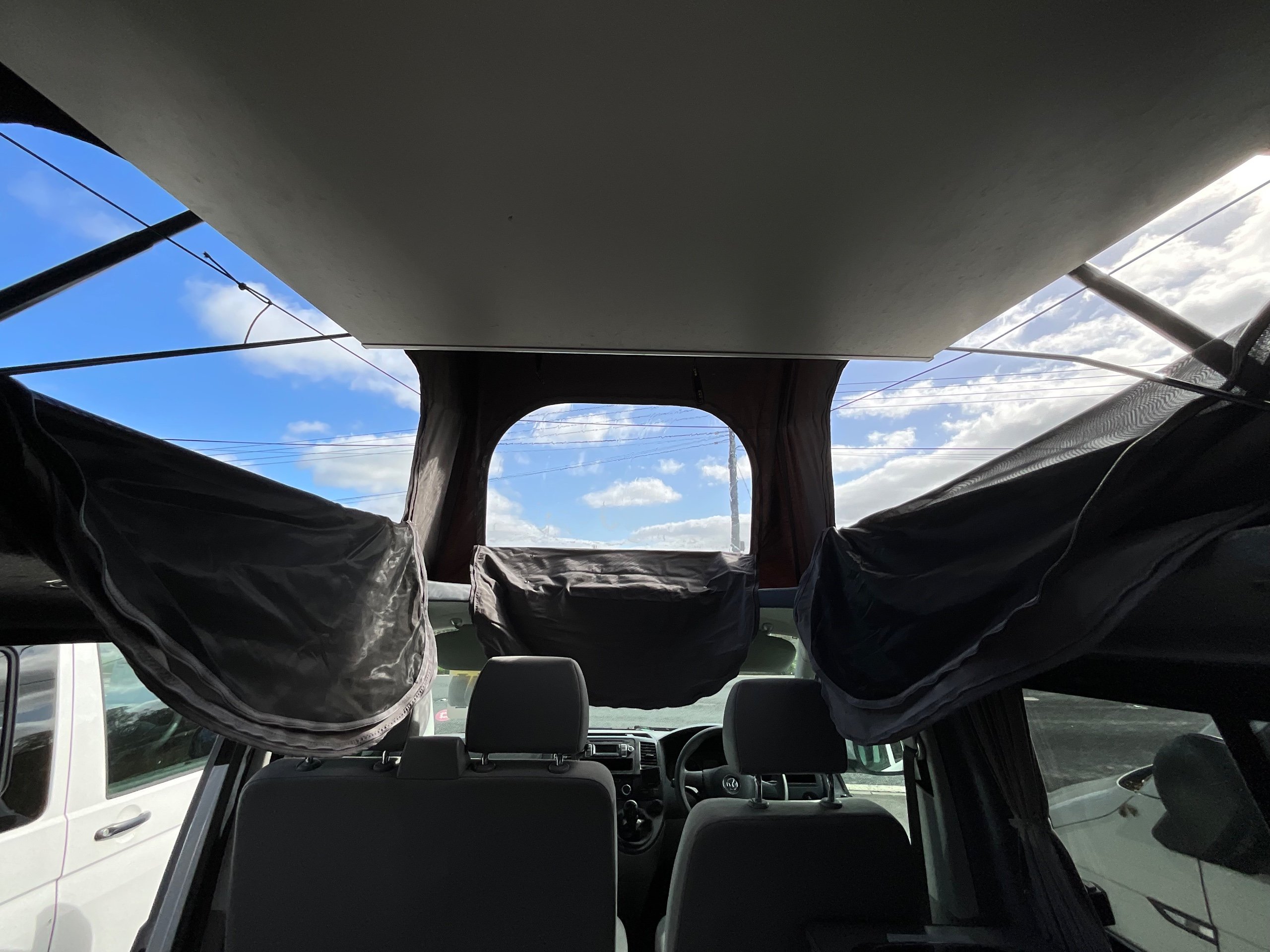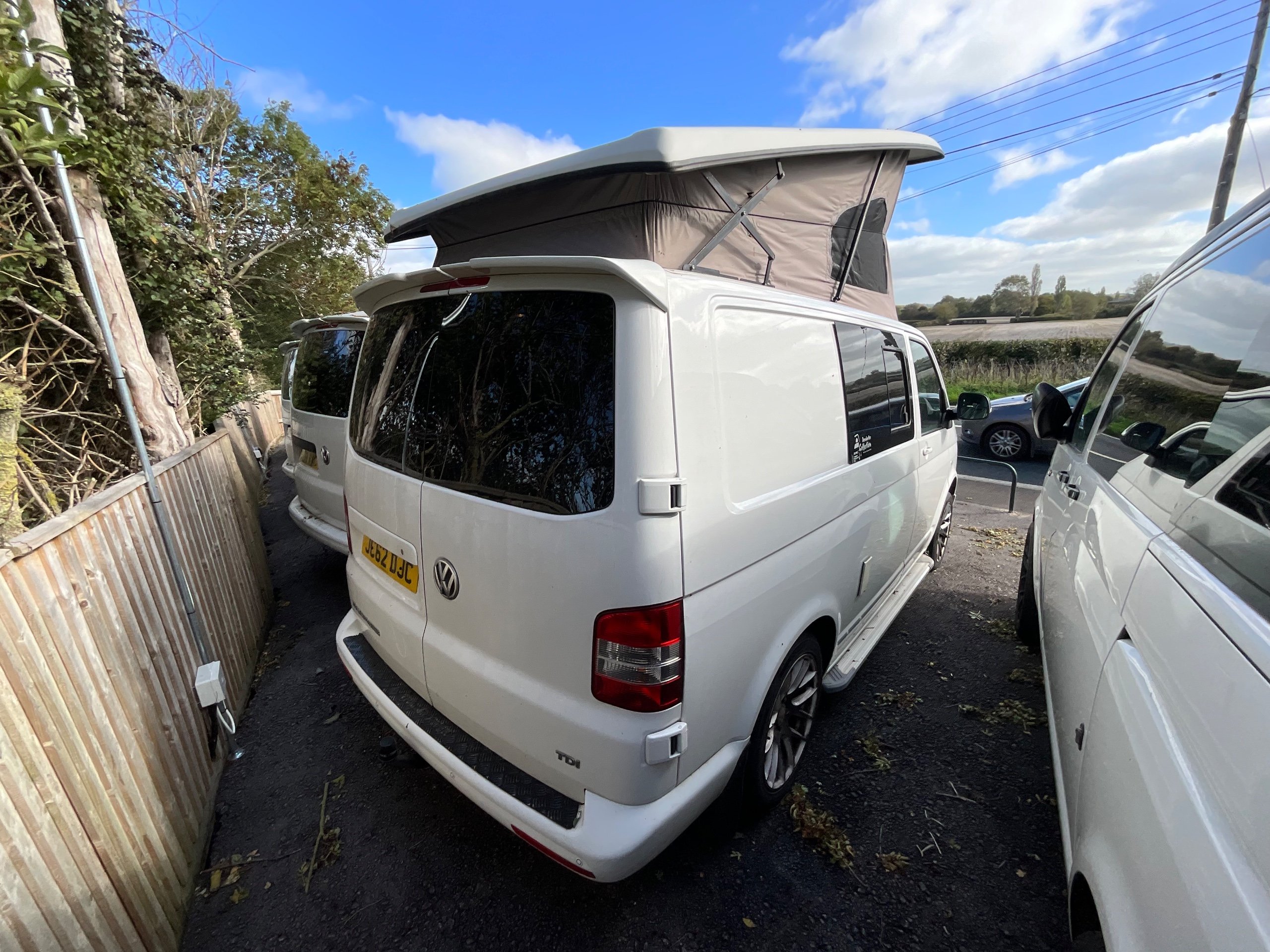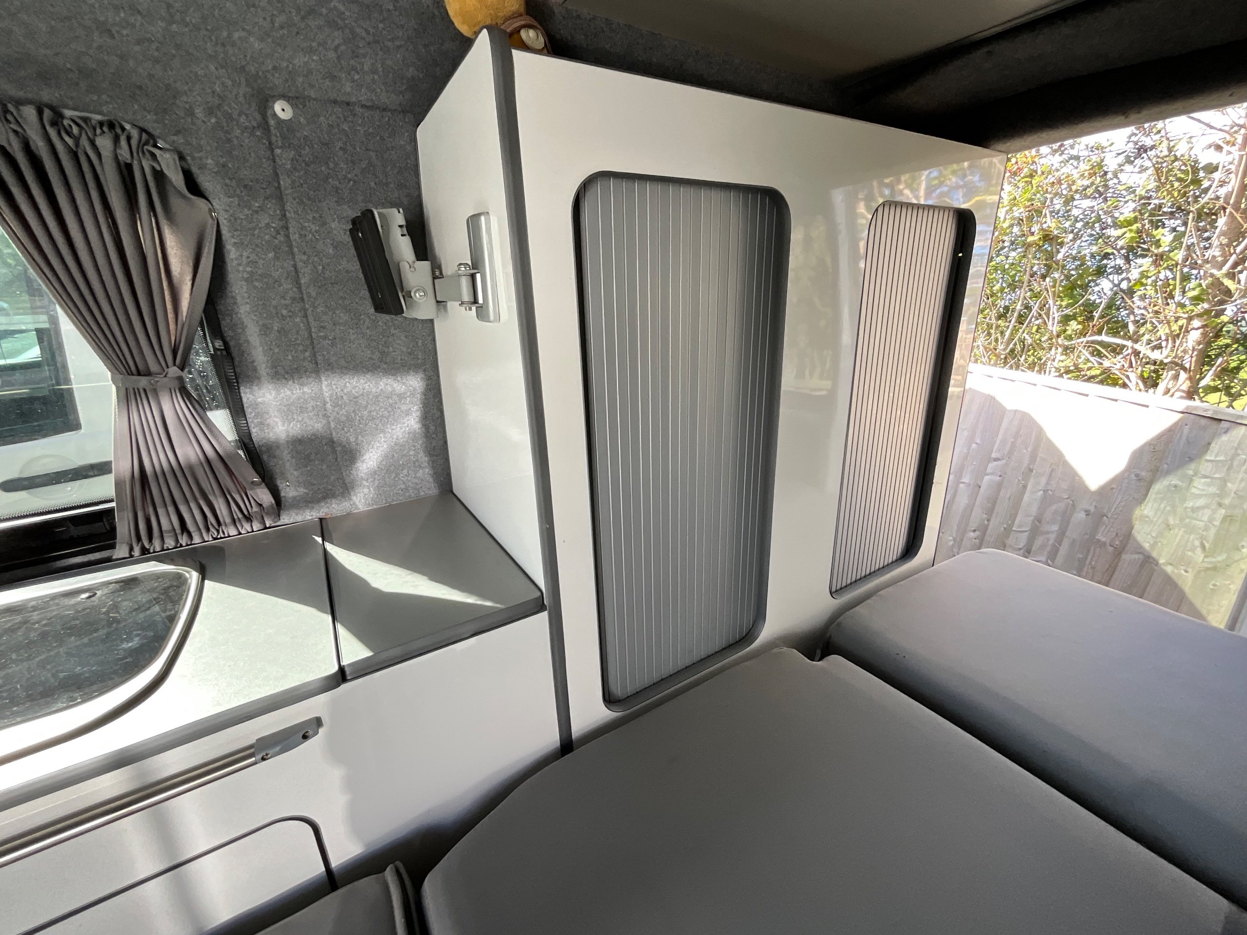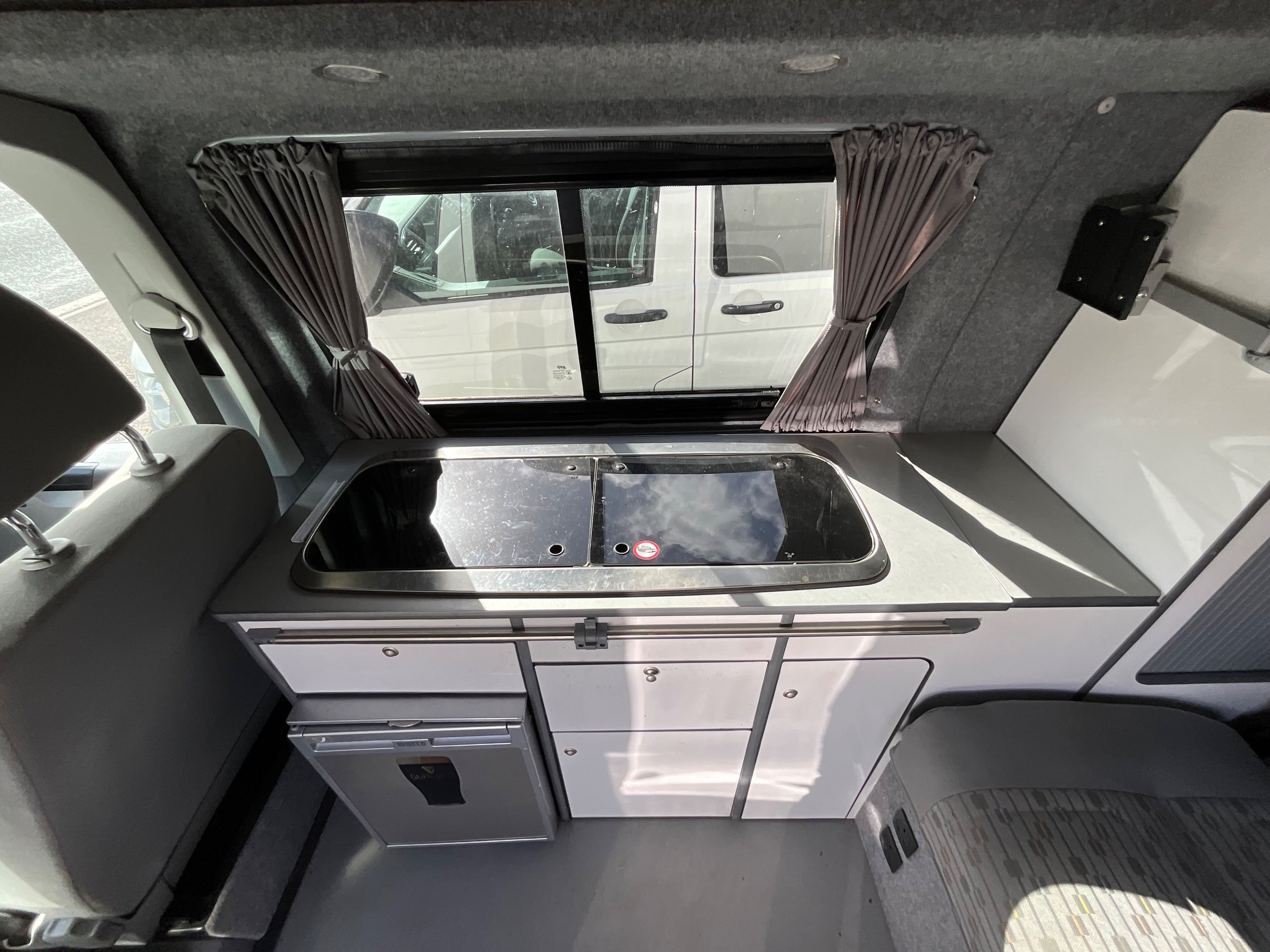 2014 VW campervan offers everything from comfort, practicality, Built in Radio with Bluetooth shows its quality. It has been fully converted with grey interior fabric, white units, fabric lined walls with grey non slip flooring. There is also interior light fittings. The VW has been fitted with a hi-lo Remio roof with a coloured canvas and struts, three windows with insect proof netting for the sides and clear fabric at the front. This van is registered as a 5-seater and sleeps 4.