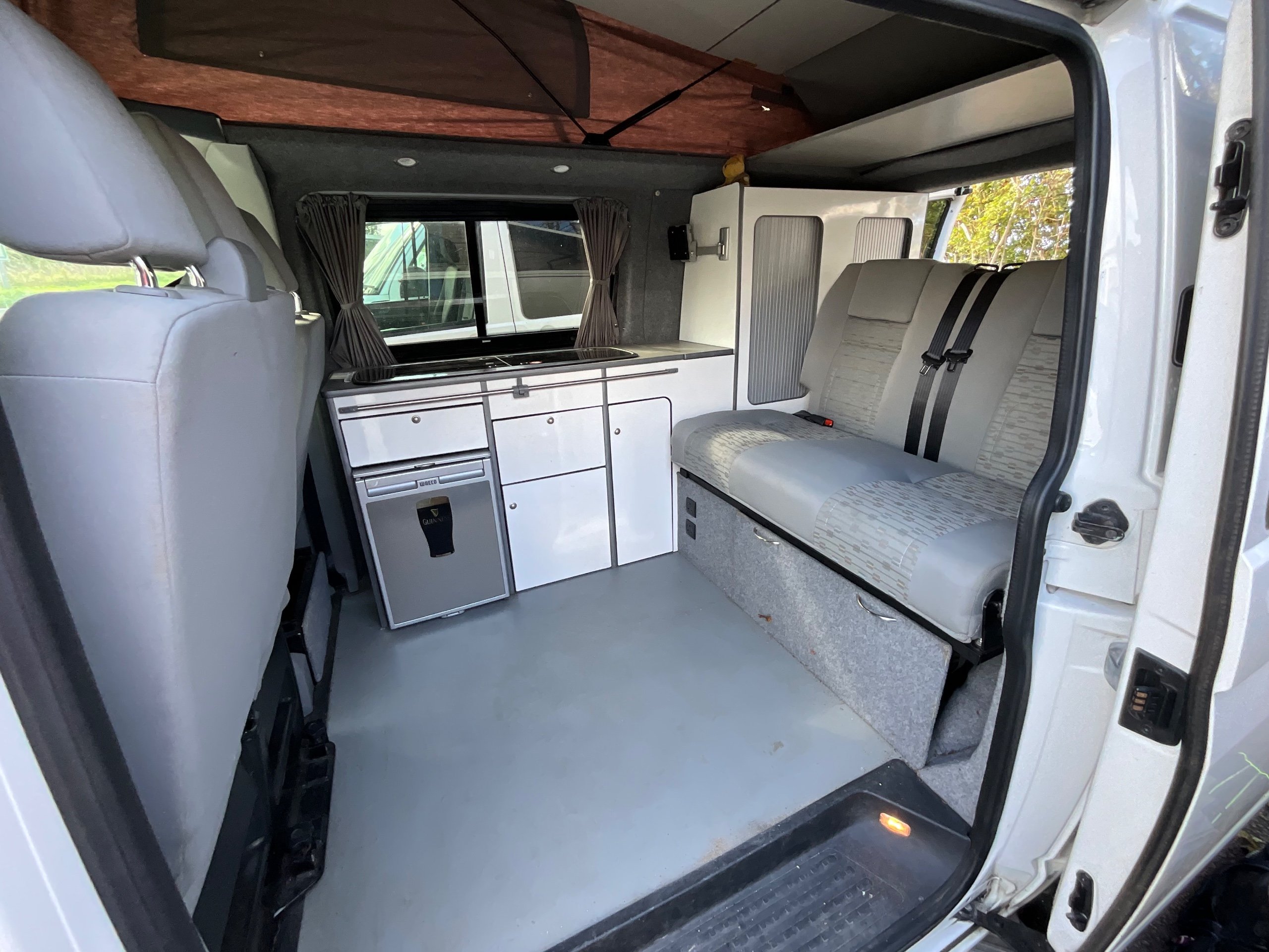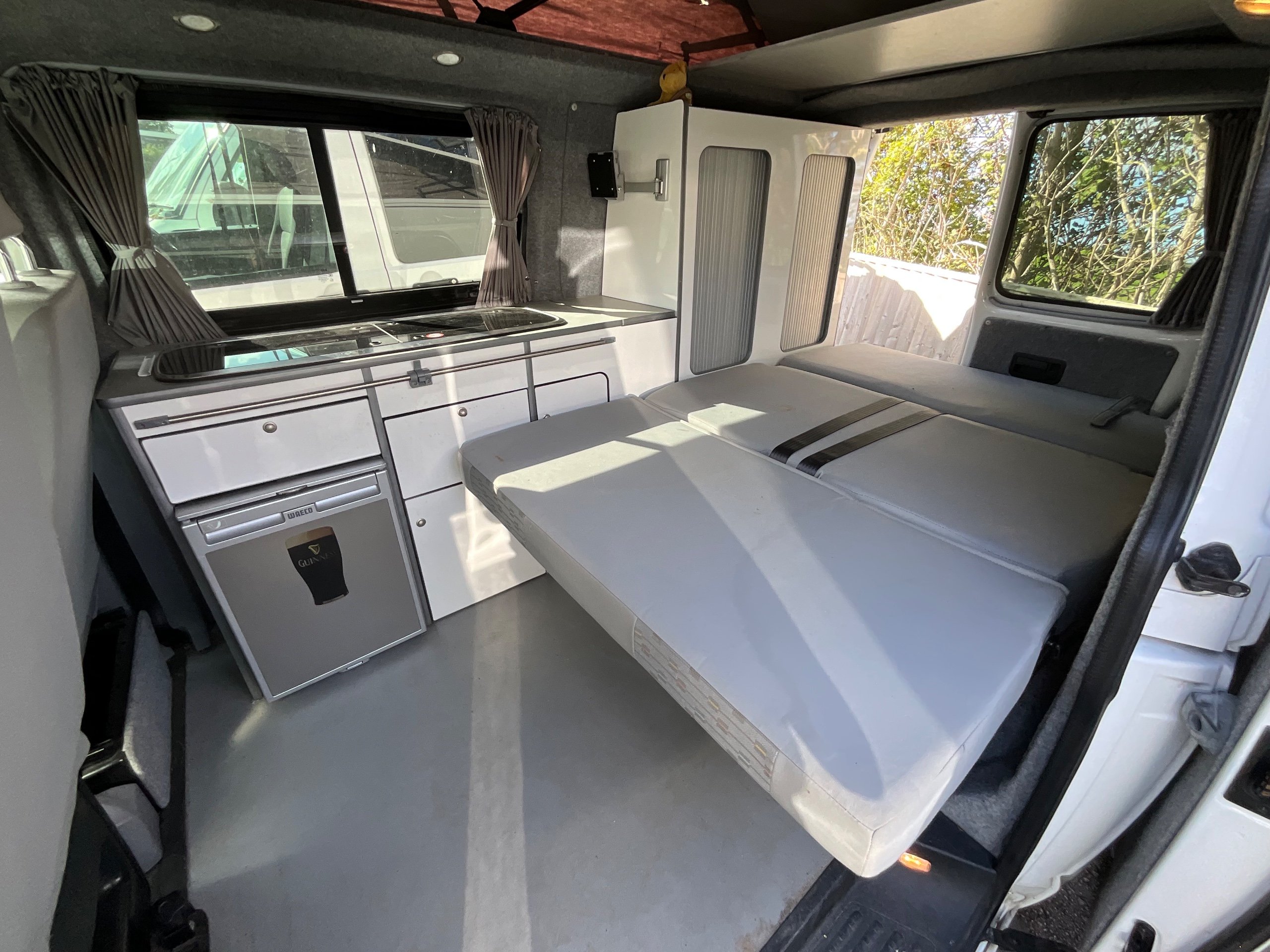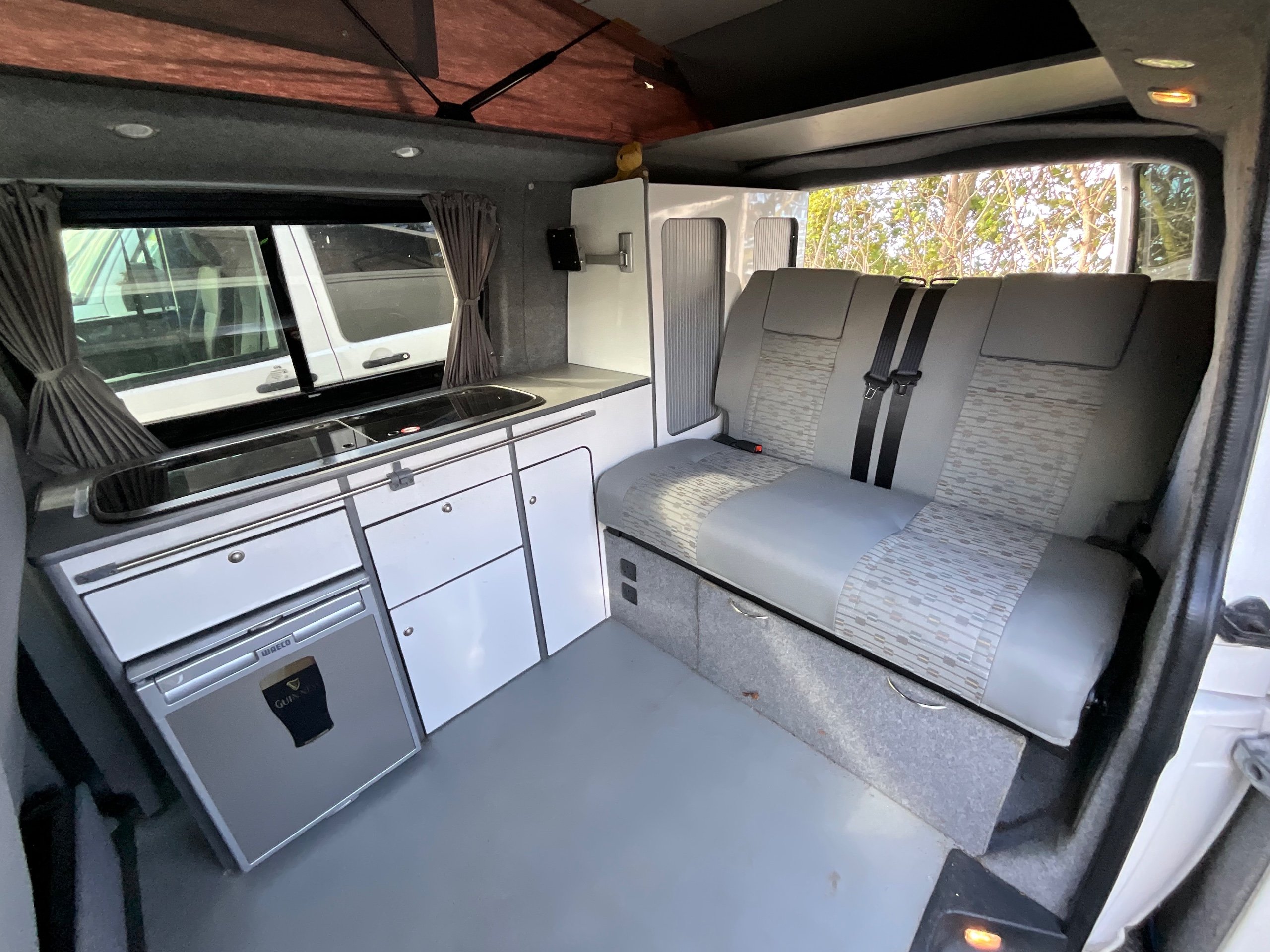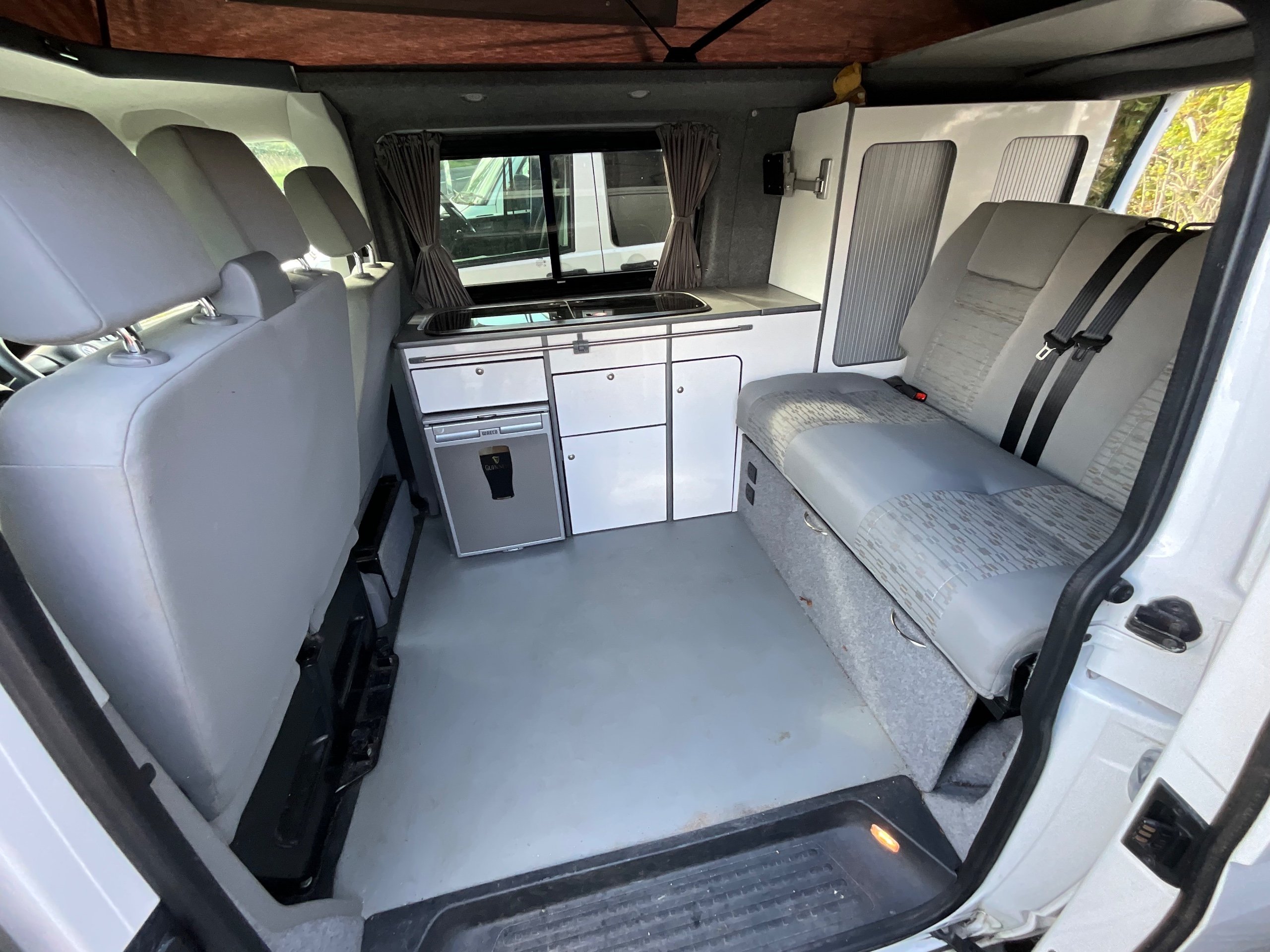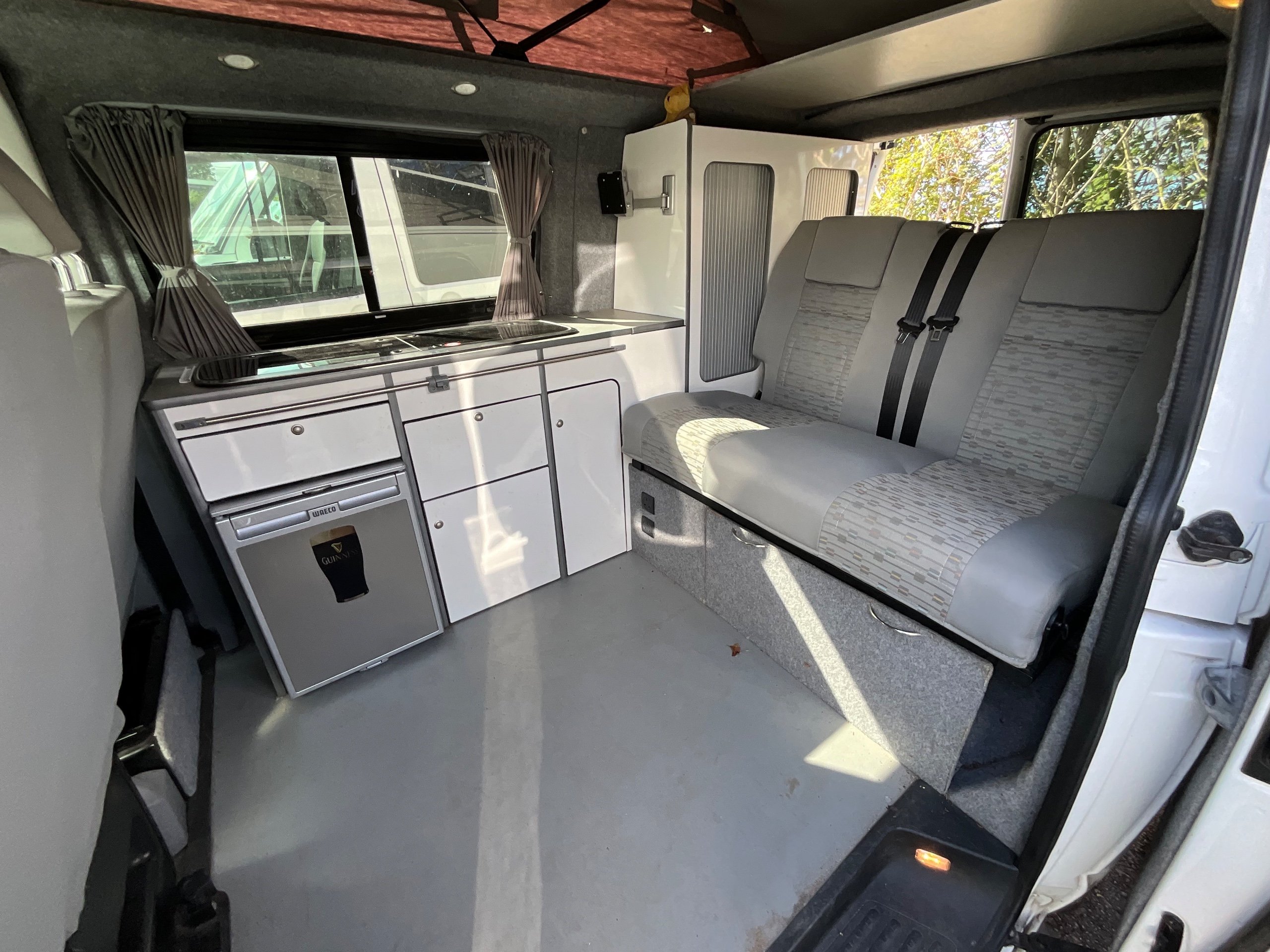 The seats in the back are created out of the crash tested and approved ribbed bed (forming a spacious doubled bed) to have the classic VW layout inside, while still having the all the standard comforts as well as belted seats. The fridge is 12V, with the fridge having a freezer box. There is also a removeable table. A double swivel seat for extending the social space and ease of sleeping upstairs. There is also a domestic double gas hob (working off a camping gas bottle), and a sink with an electrical water pump which is connected to a fresh water tank. There is also 240V hook up. The van has plenty of storage throughout the motorhome as well.