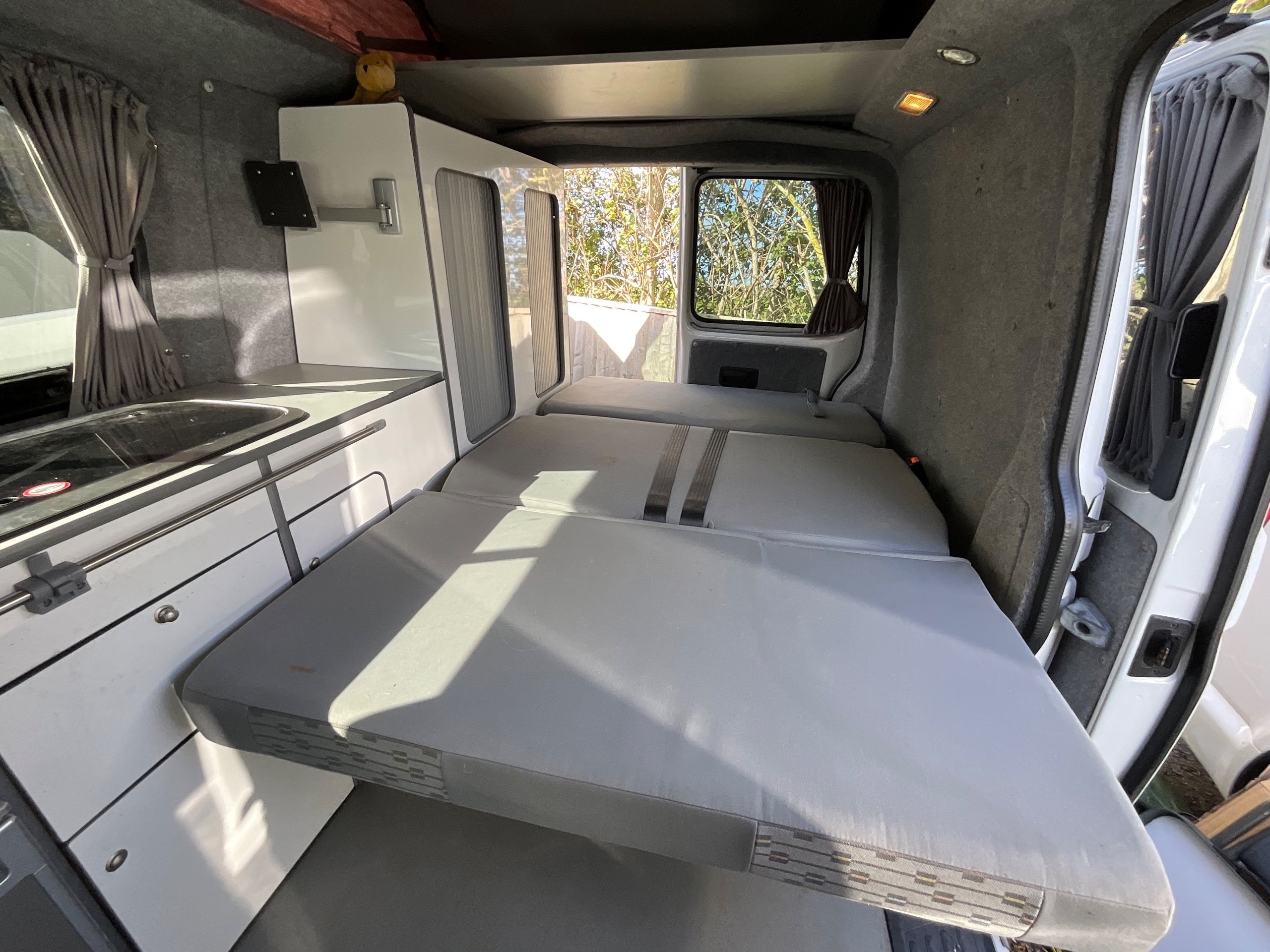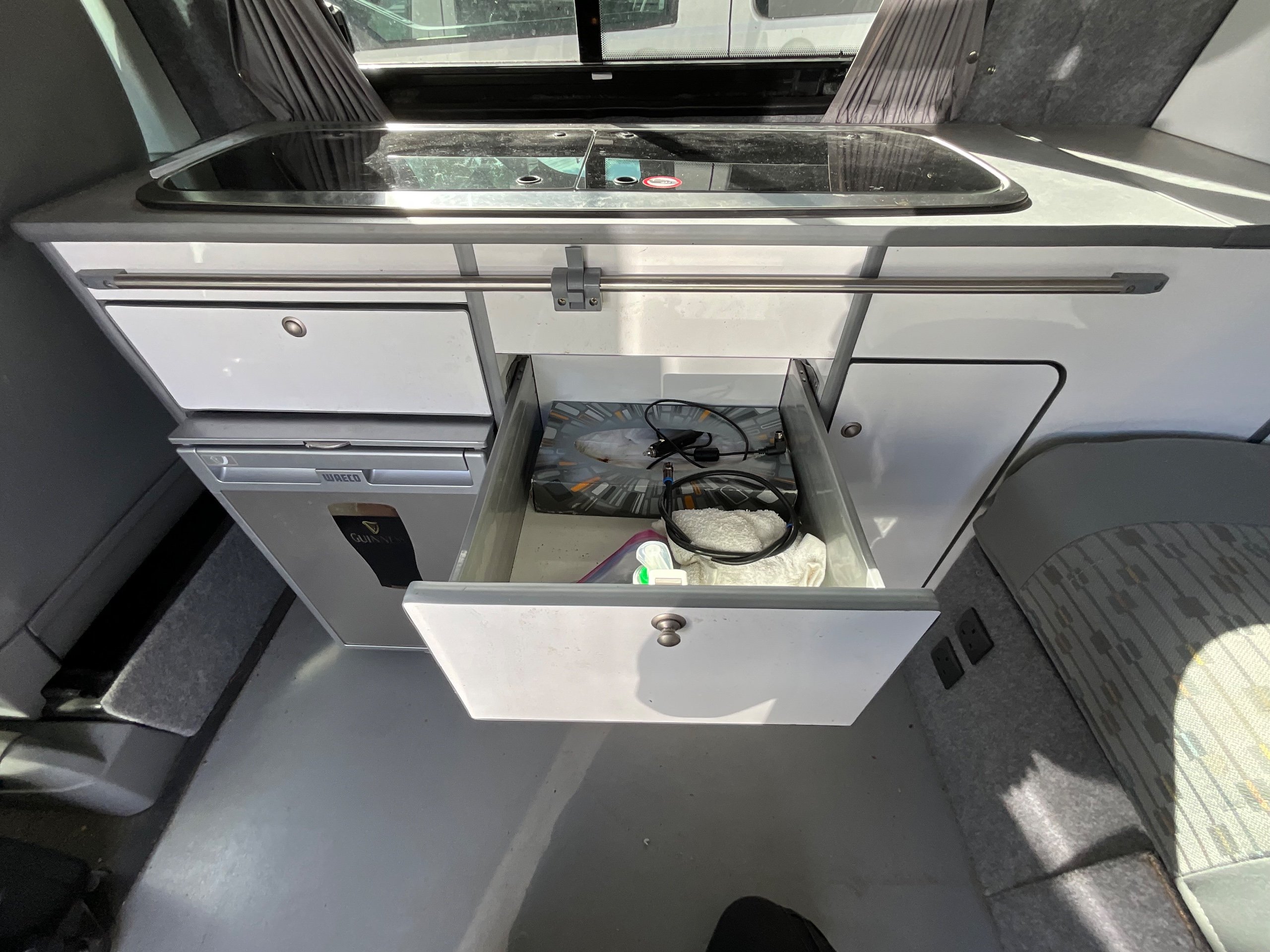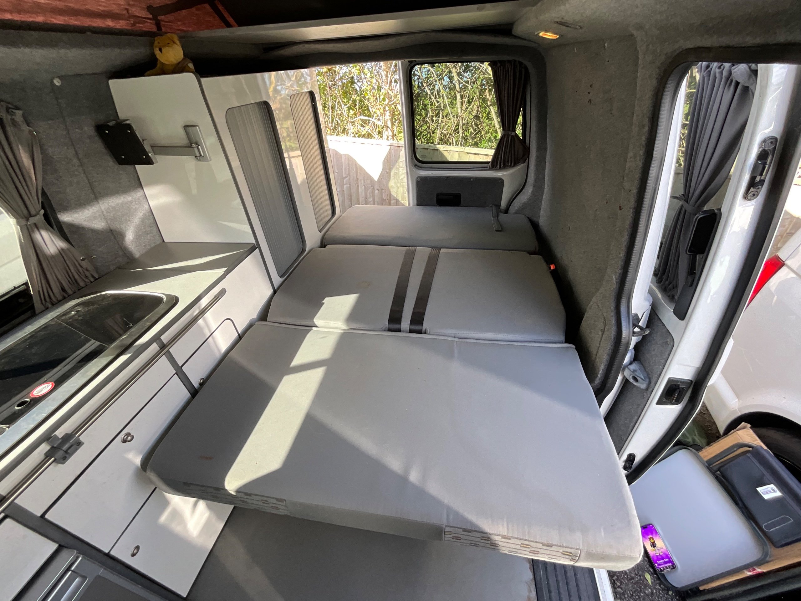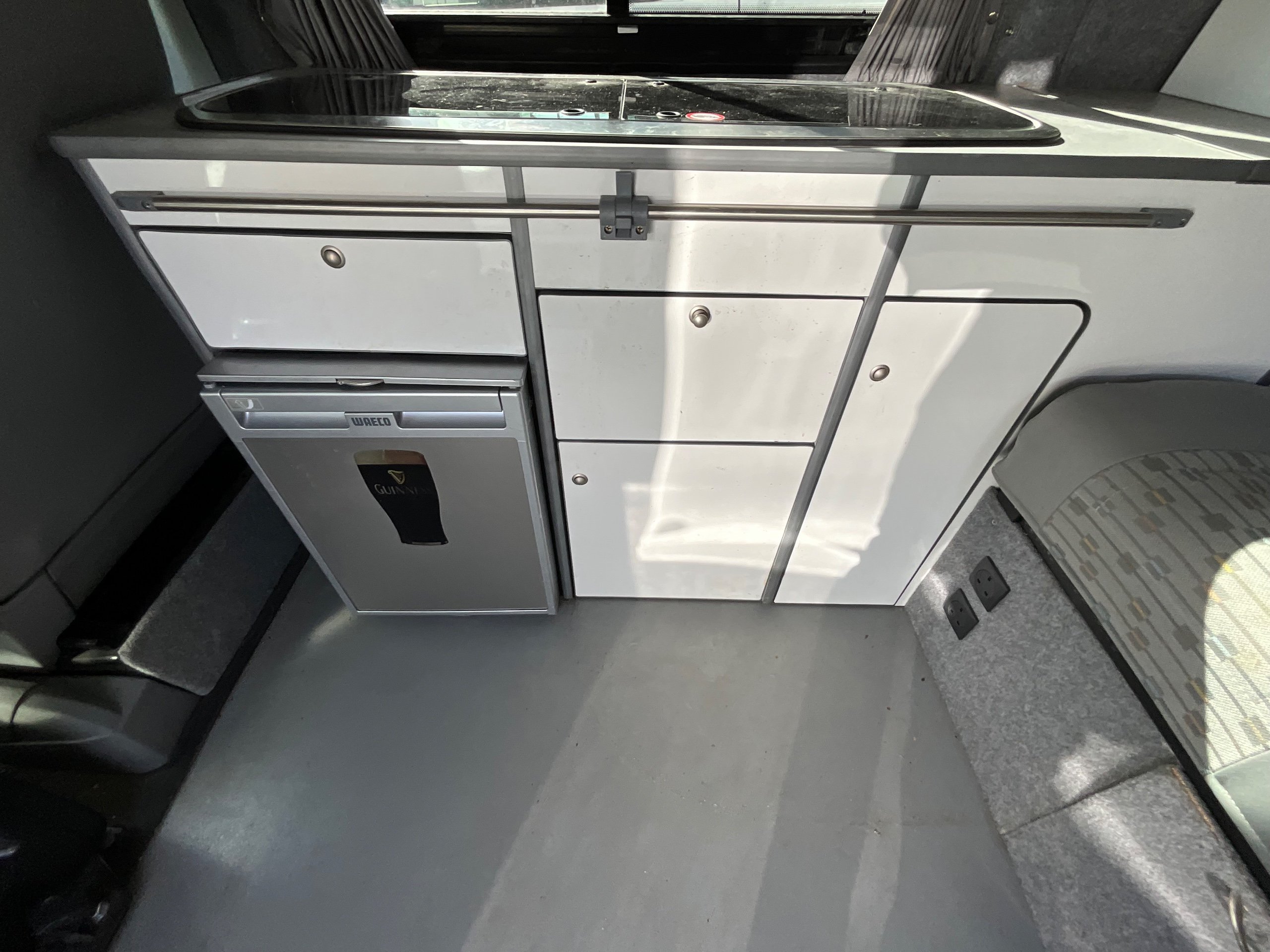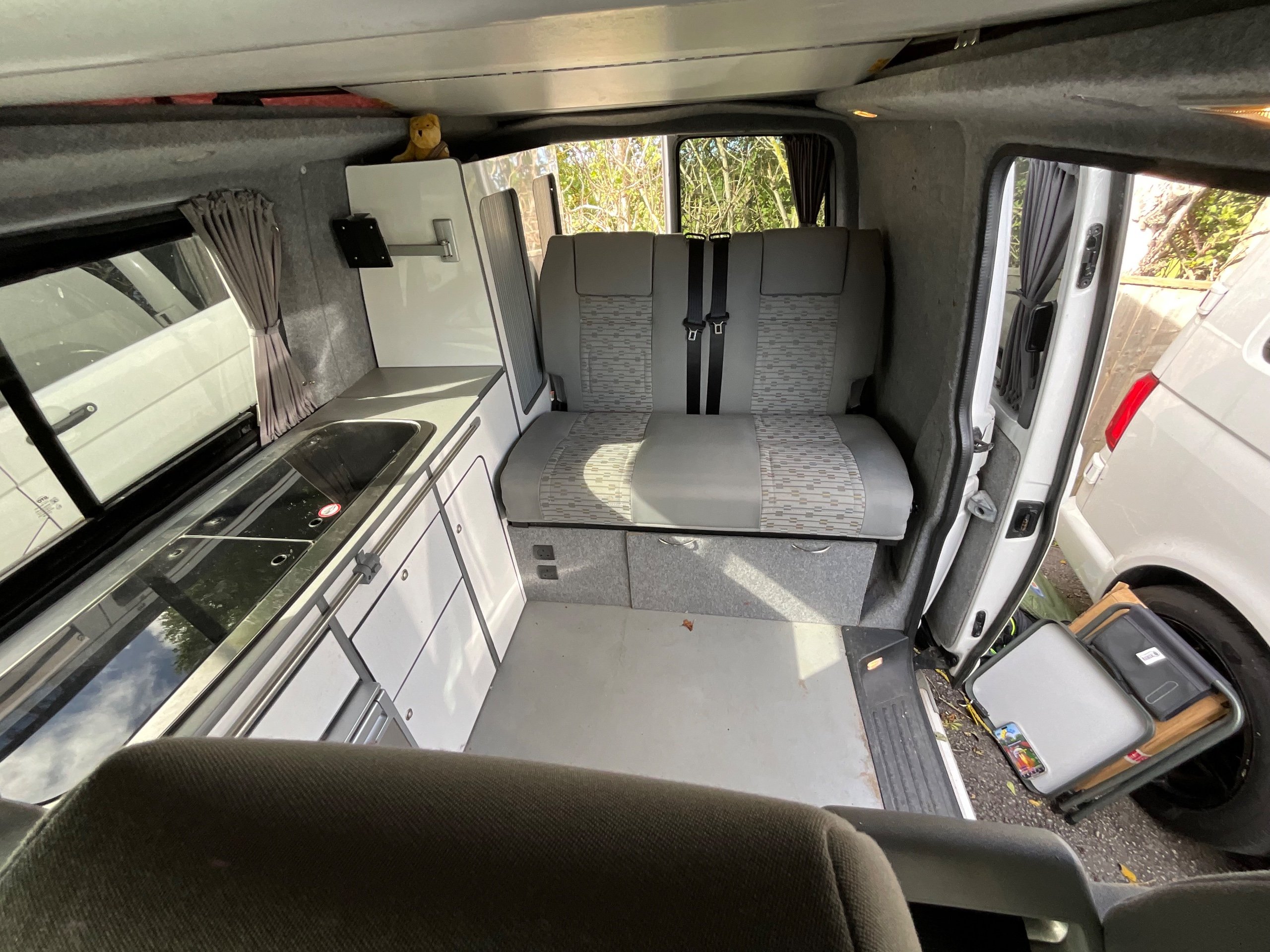 The seats in the back are created out of the crash tested and approved ribbed bed (forming a spacious doubled bed) to have the classic VW layout inside, while still having the all the standard comforts as well as belted seats. The fridge is 12V, with the fridge having a freezer box. There is also a removeable table. A double swivel seat for extending the social space and ease of sleeping upstairs. There is also a domestic double gas hob (working off a camping gas bottle), and a sink with an electrical water pump which is connected to a fresh water tank. There is also 240V hook up. The van has plenty of storage throughout the motorhome as well.