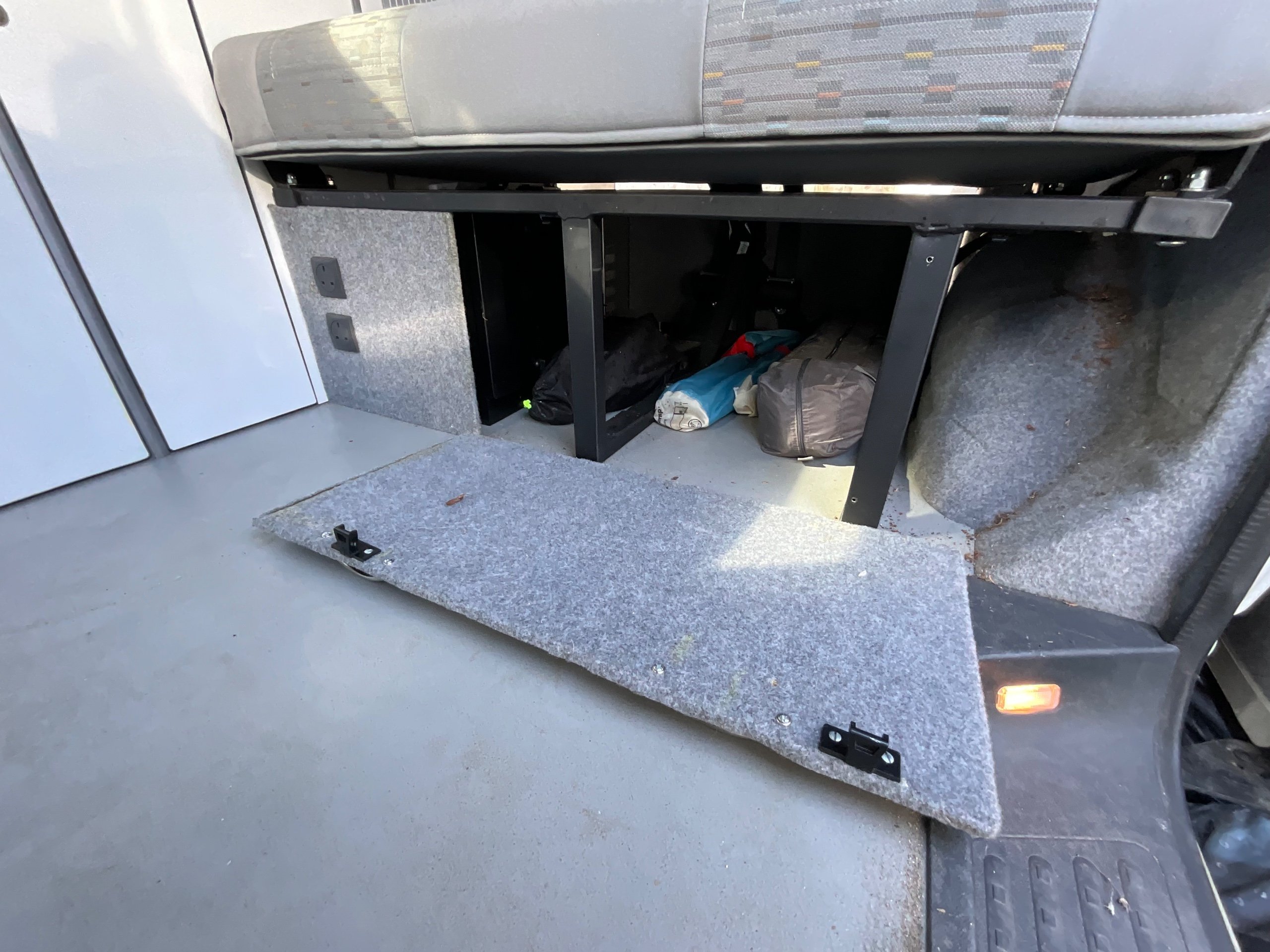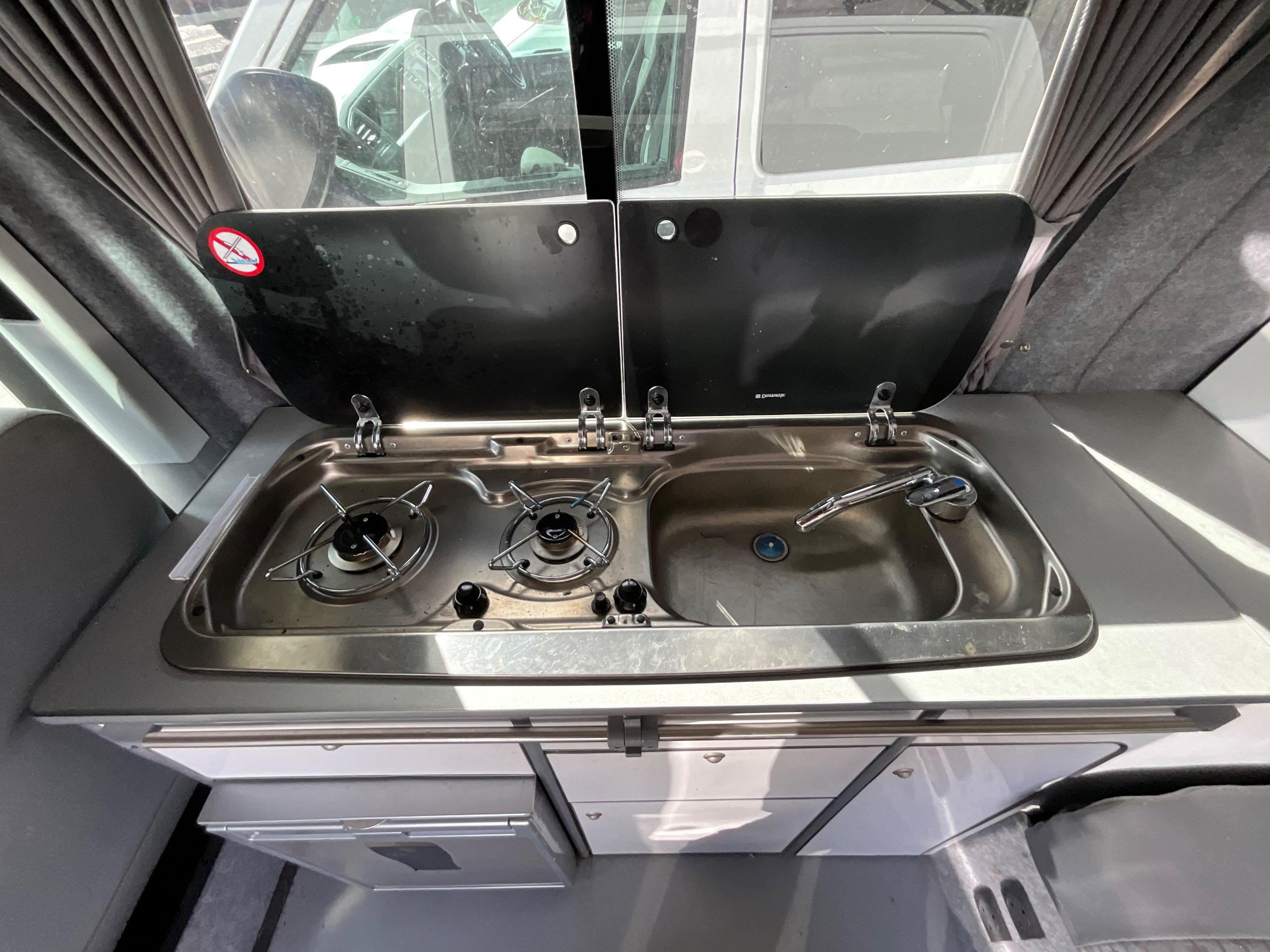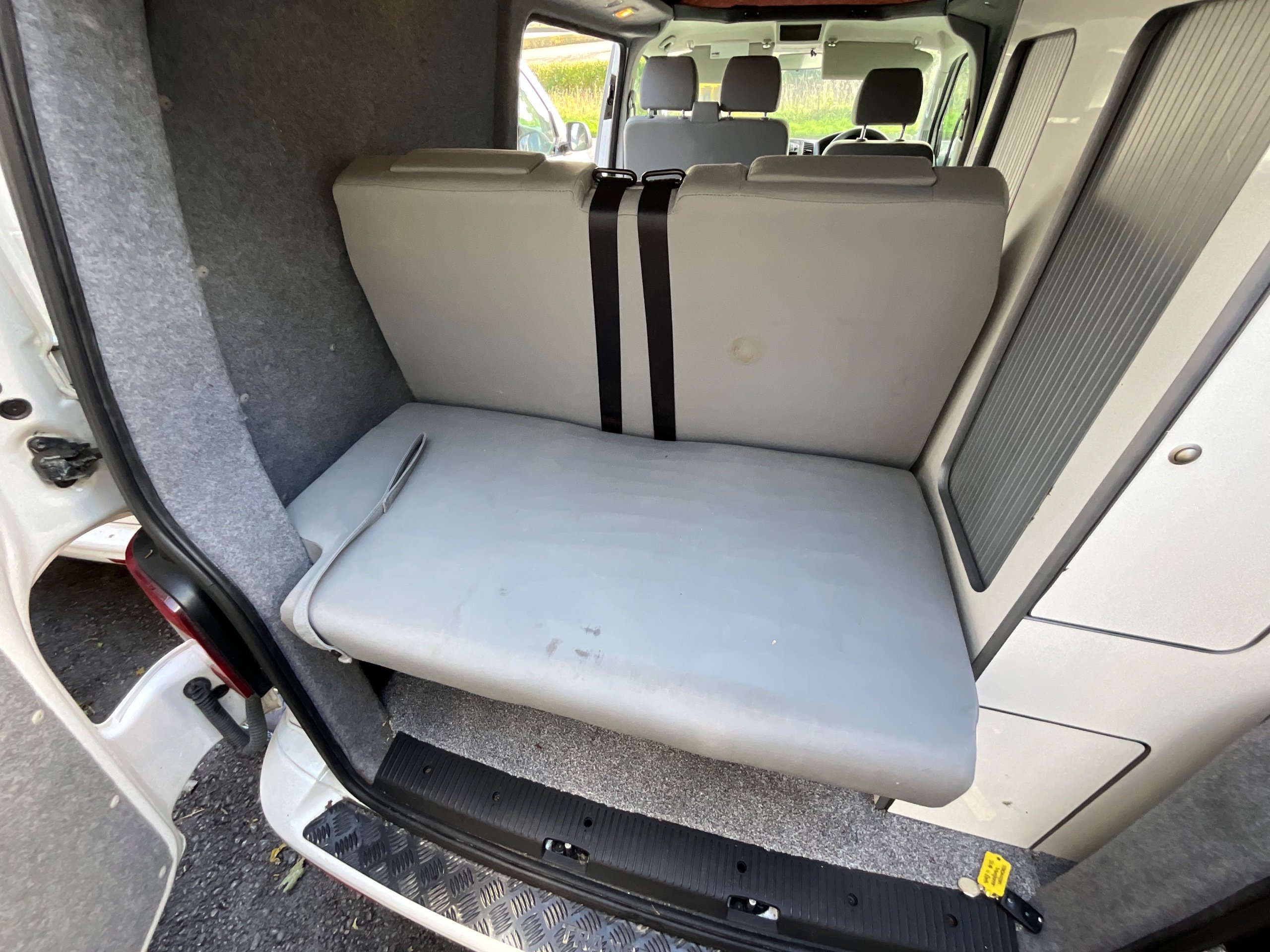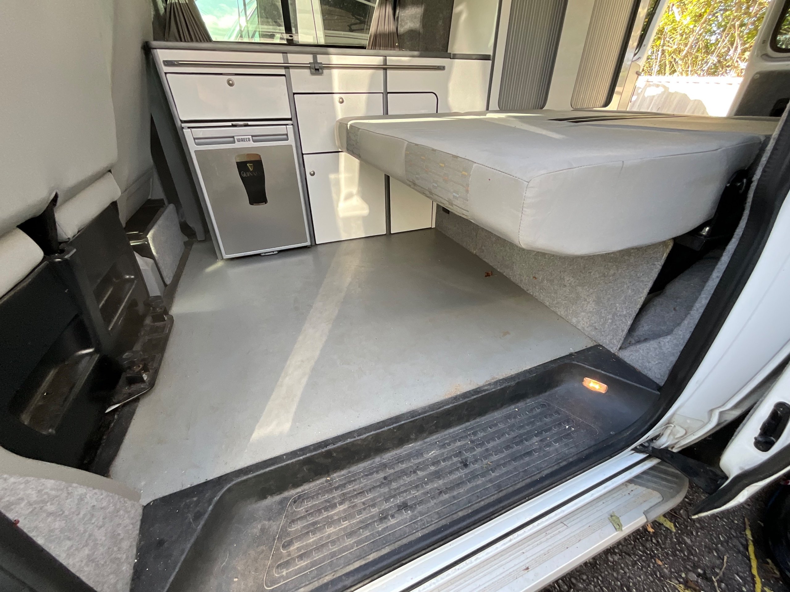 The seats in the back are created out of the crash tested and approved ribbed bed (forming a spacious doubled bed) to have the classic VW layout inside, while still having the all the standard comforts as well as belted seats. The fridge is 12V, with the fridge having a freezer box. There is also a removeable table. A double swivel seat for extending the social space and ease of sleeping upstairs. There is also a domestic double gas hob (working off a camping gas bottle), and a sink with an electrical water pump which is connected to a fresh water tank. There is also 240V hook up. The van has plenty of storage throughout the motorhome as well.