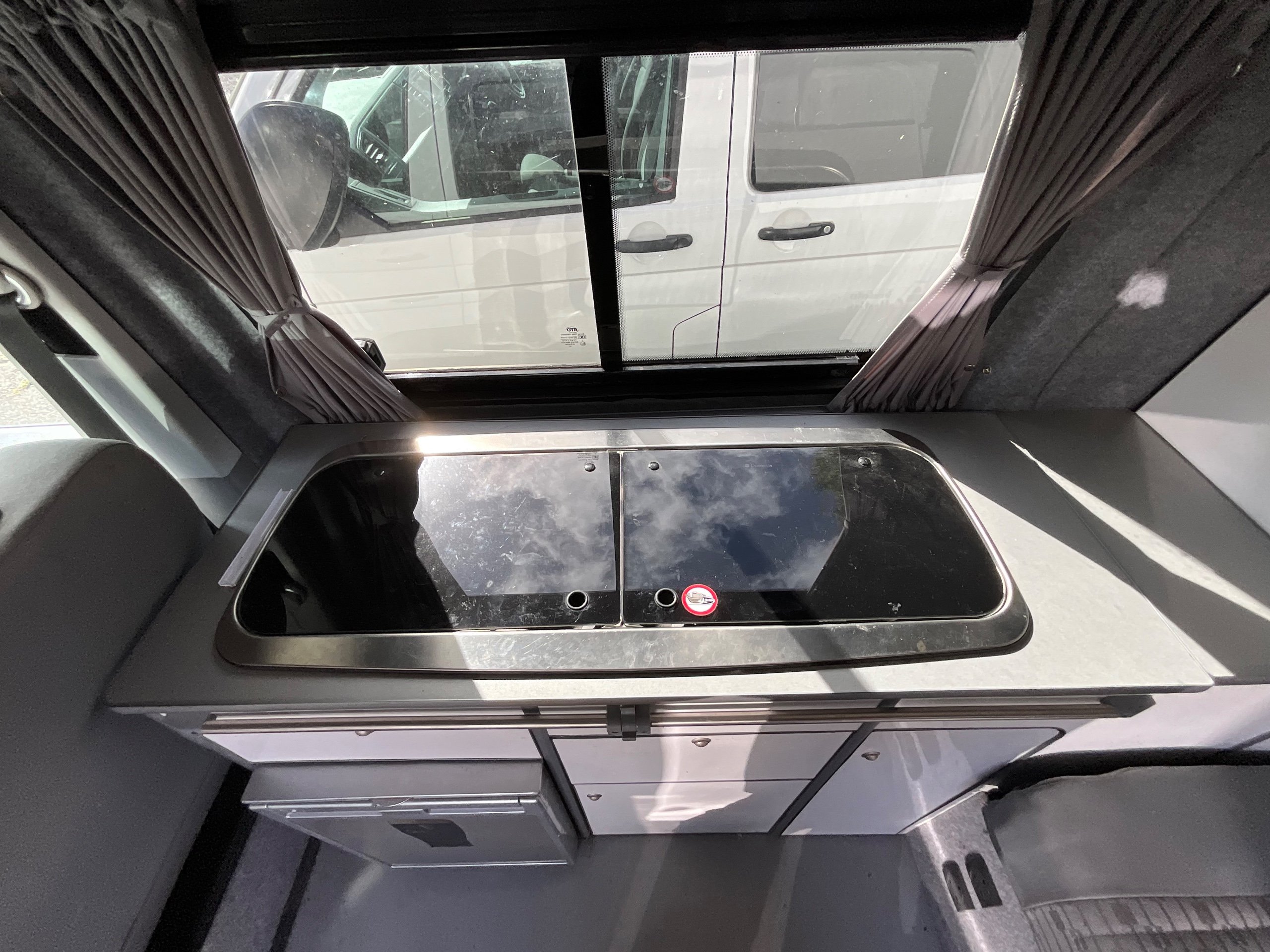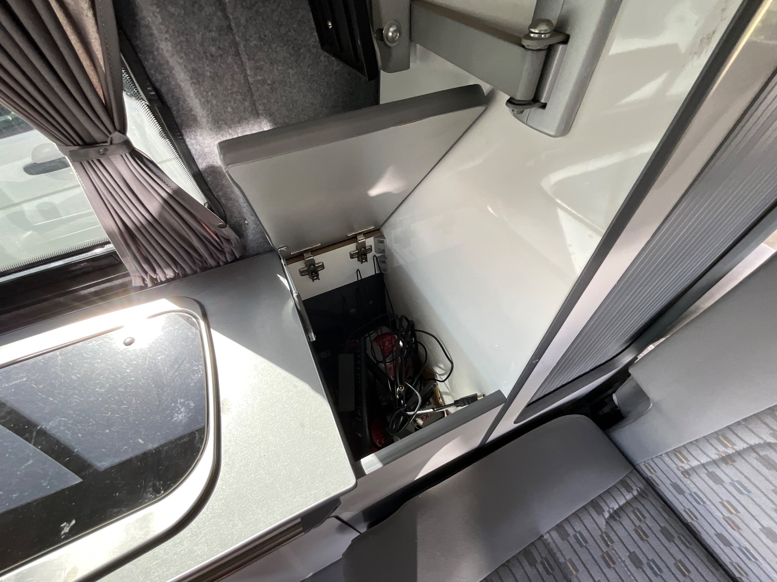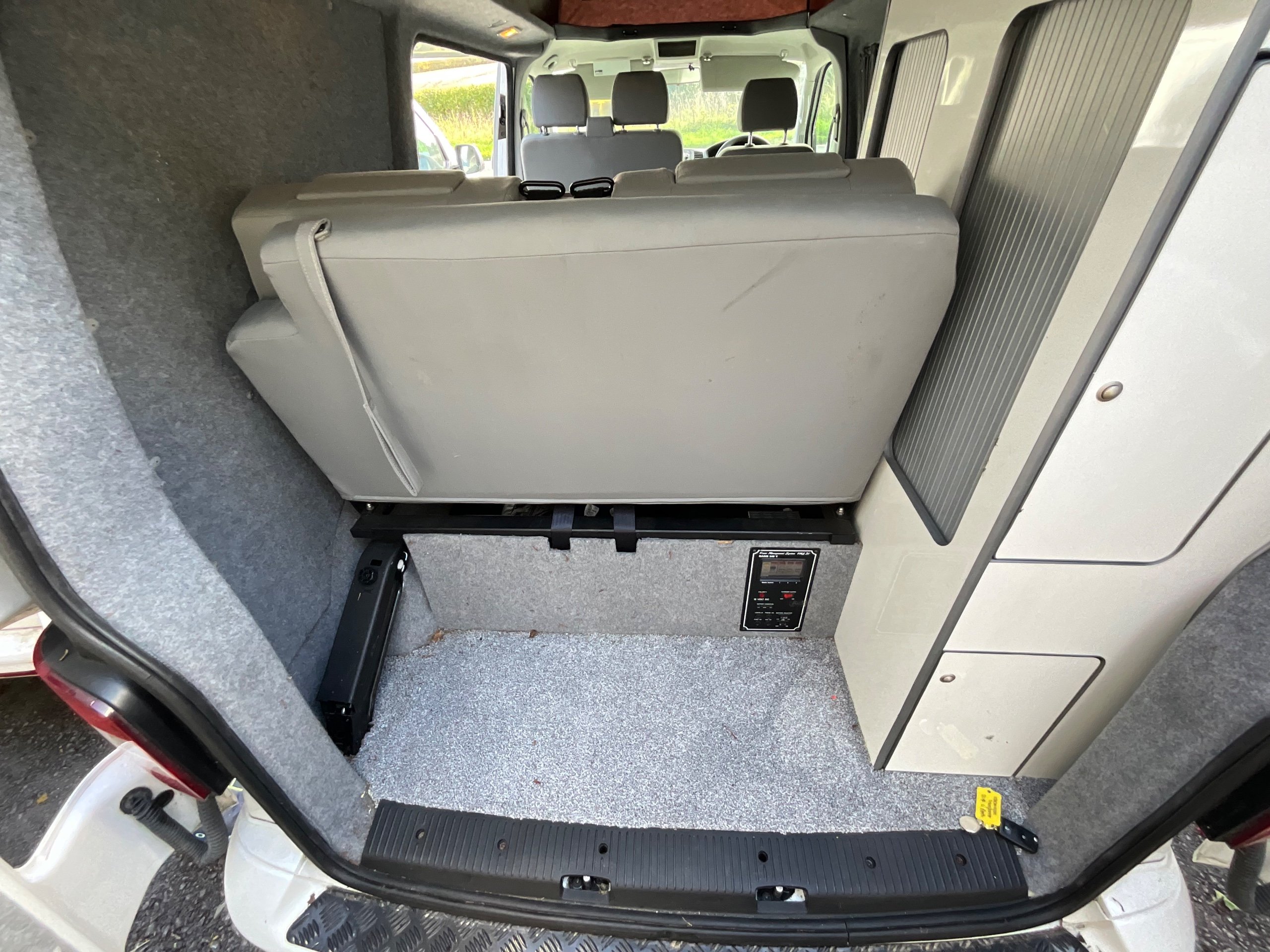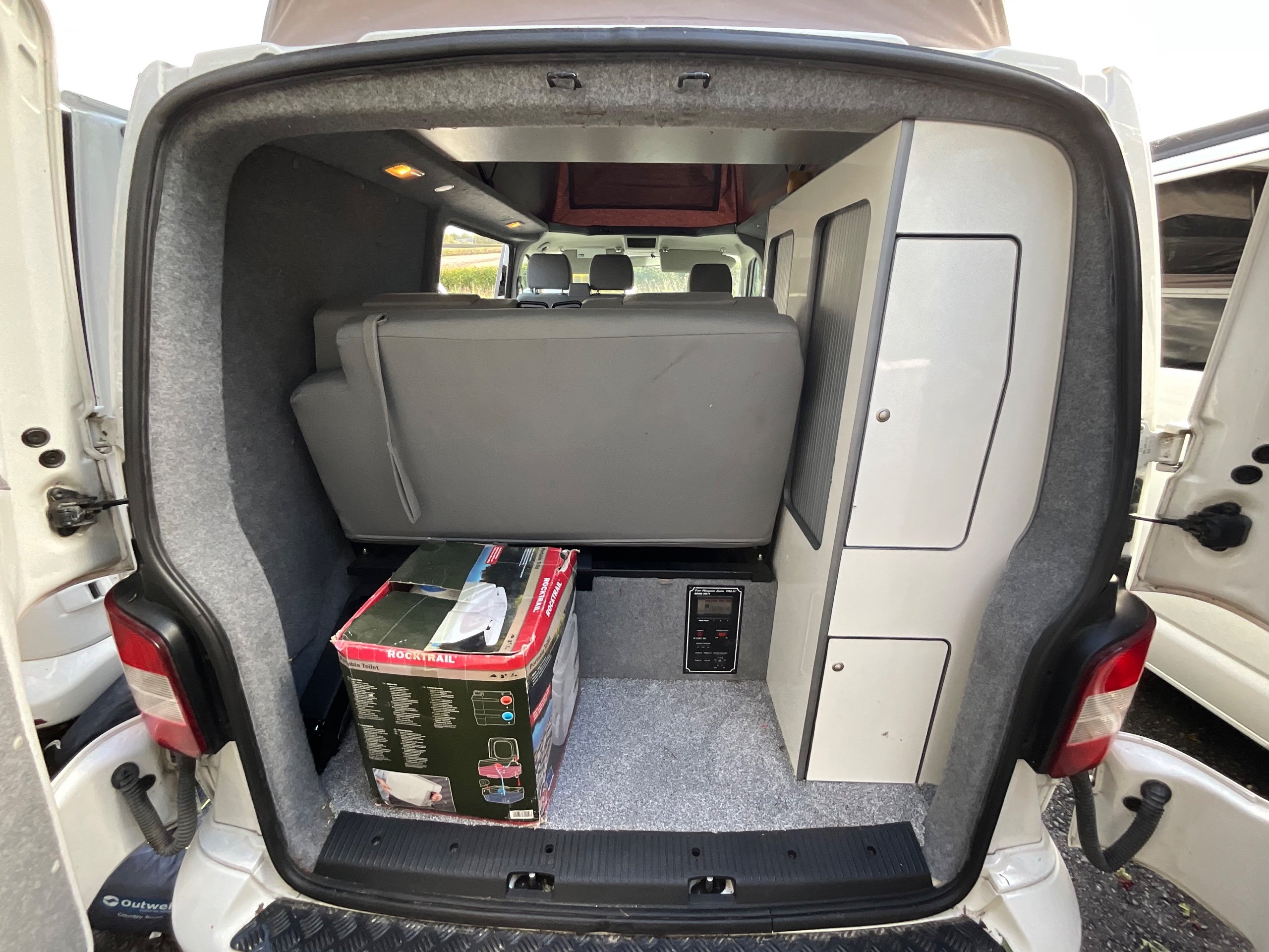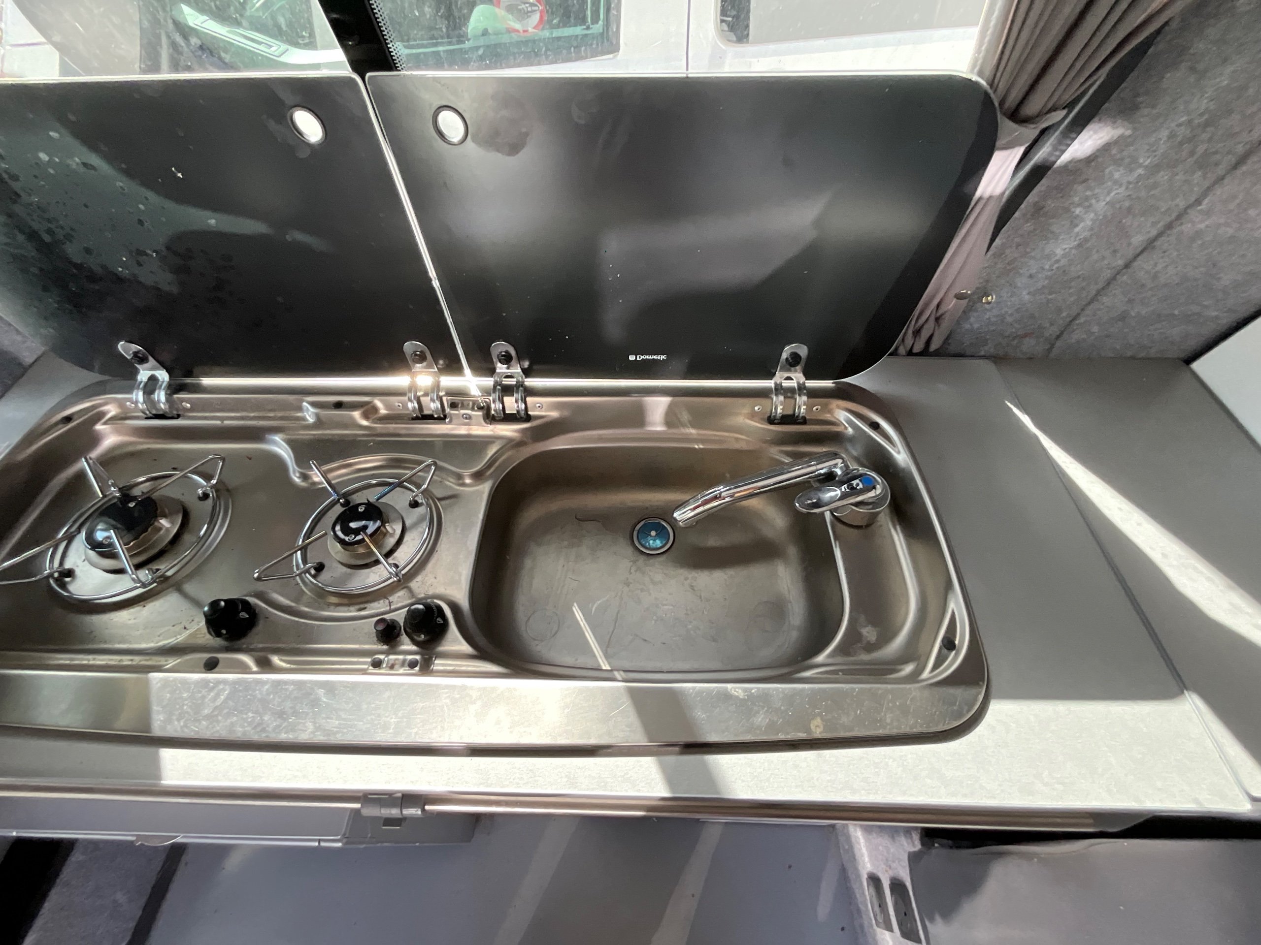 The seats in the back are created out of the crash tested and approved ribbed bed (forming a spacious doubled bed) to have the classic VW layout inside, while still having the all the standard comforts as well as belted seats. The fridge is 12V, with the fridge having a freezer box. There is also a removeable table. A double swivel seat for extending the social space and ease of sleeping upstairs. There is also a domestic double gas hob (working off a camping gas bottle), and a sink with an electrical water pump which is connected to a fresh water tank. There is also 240V hook up. The van has plenty of storage throughout the motorhome as well.