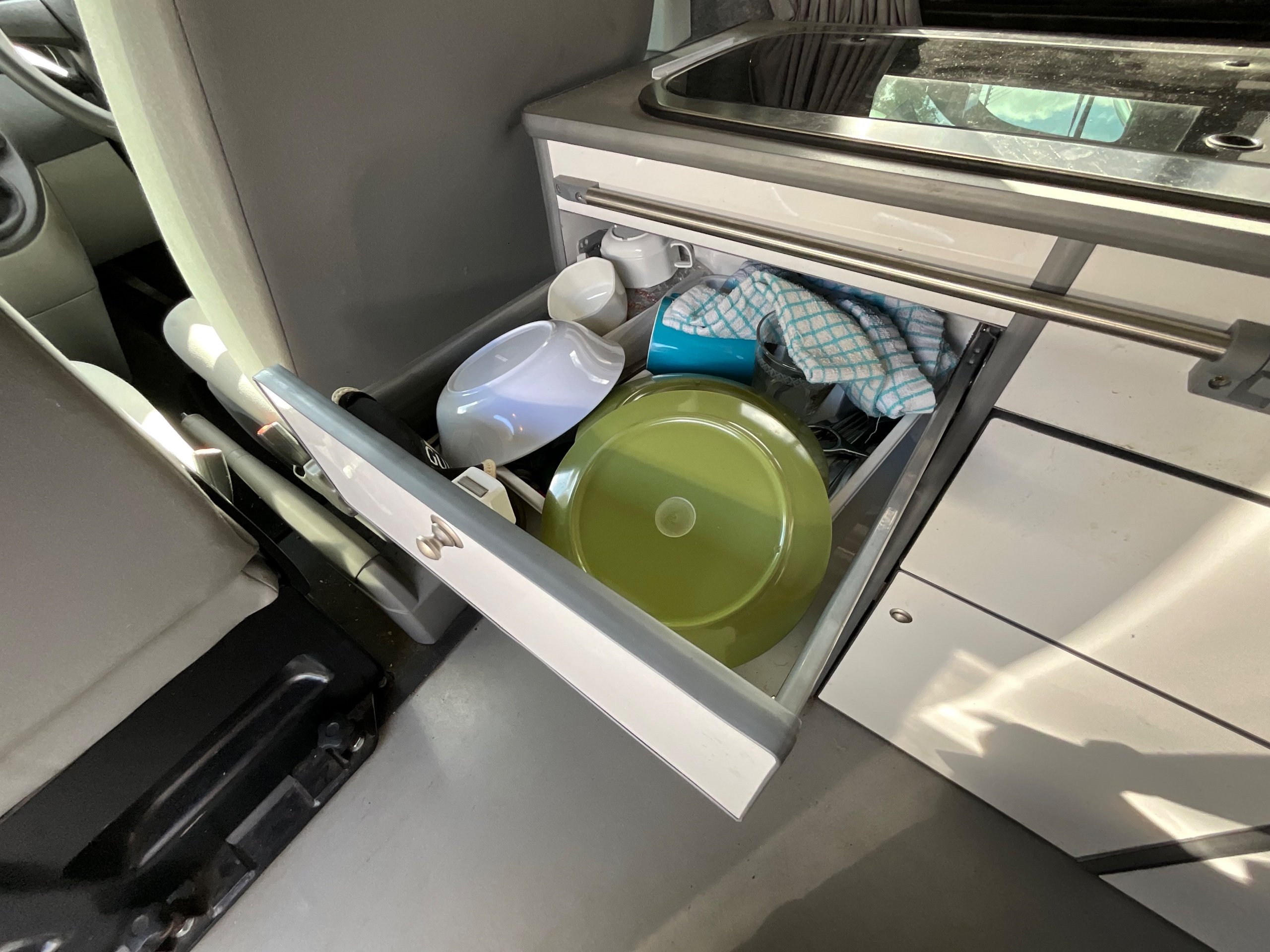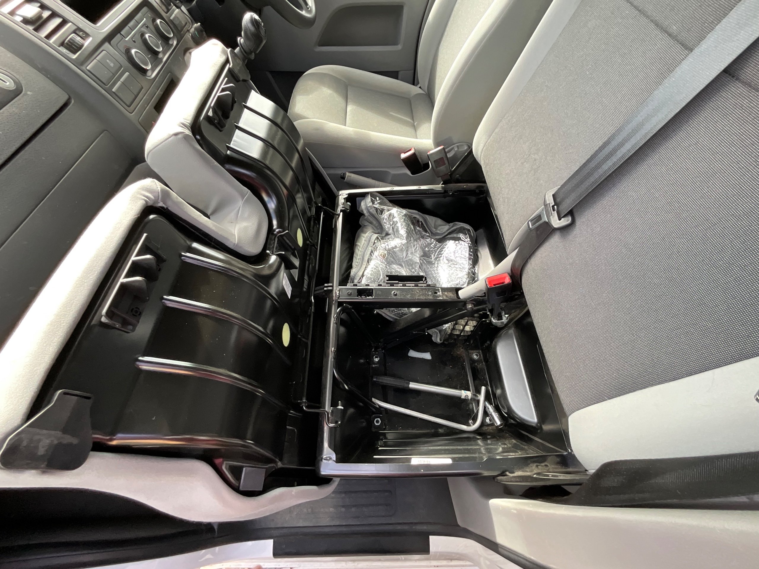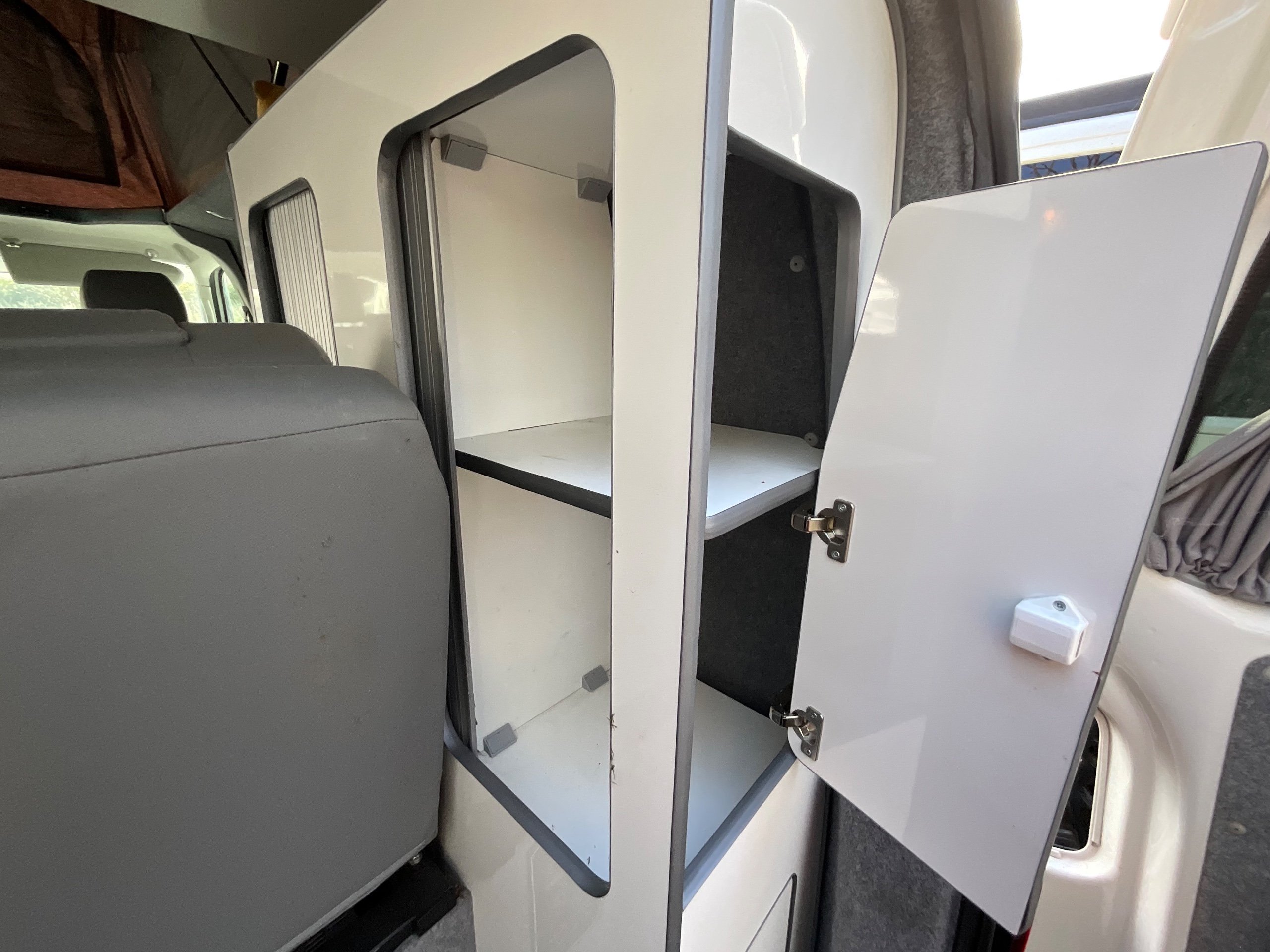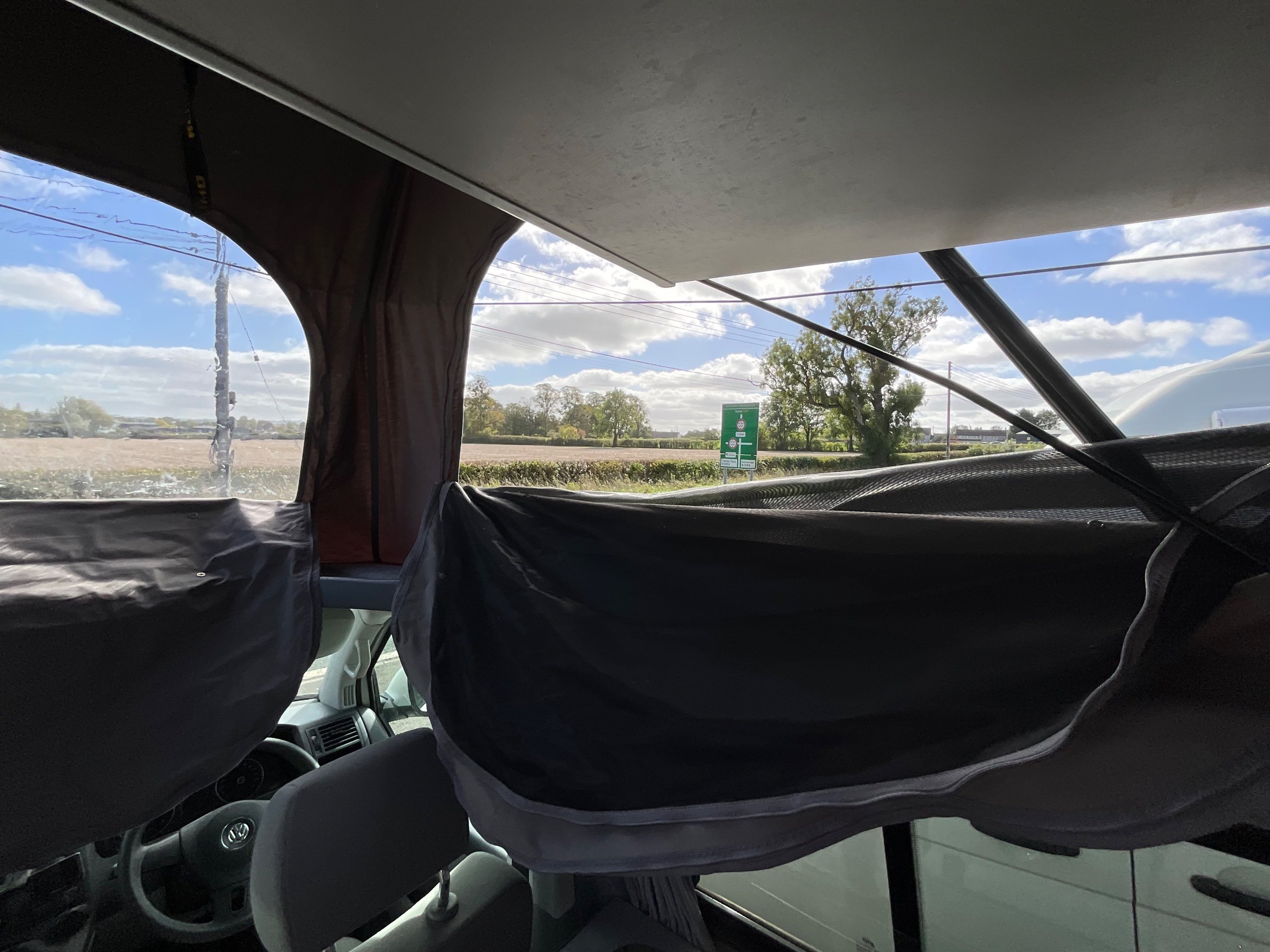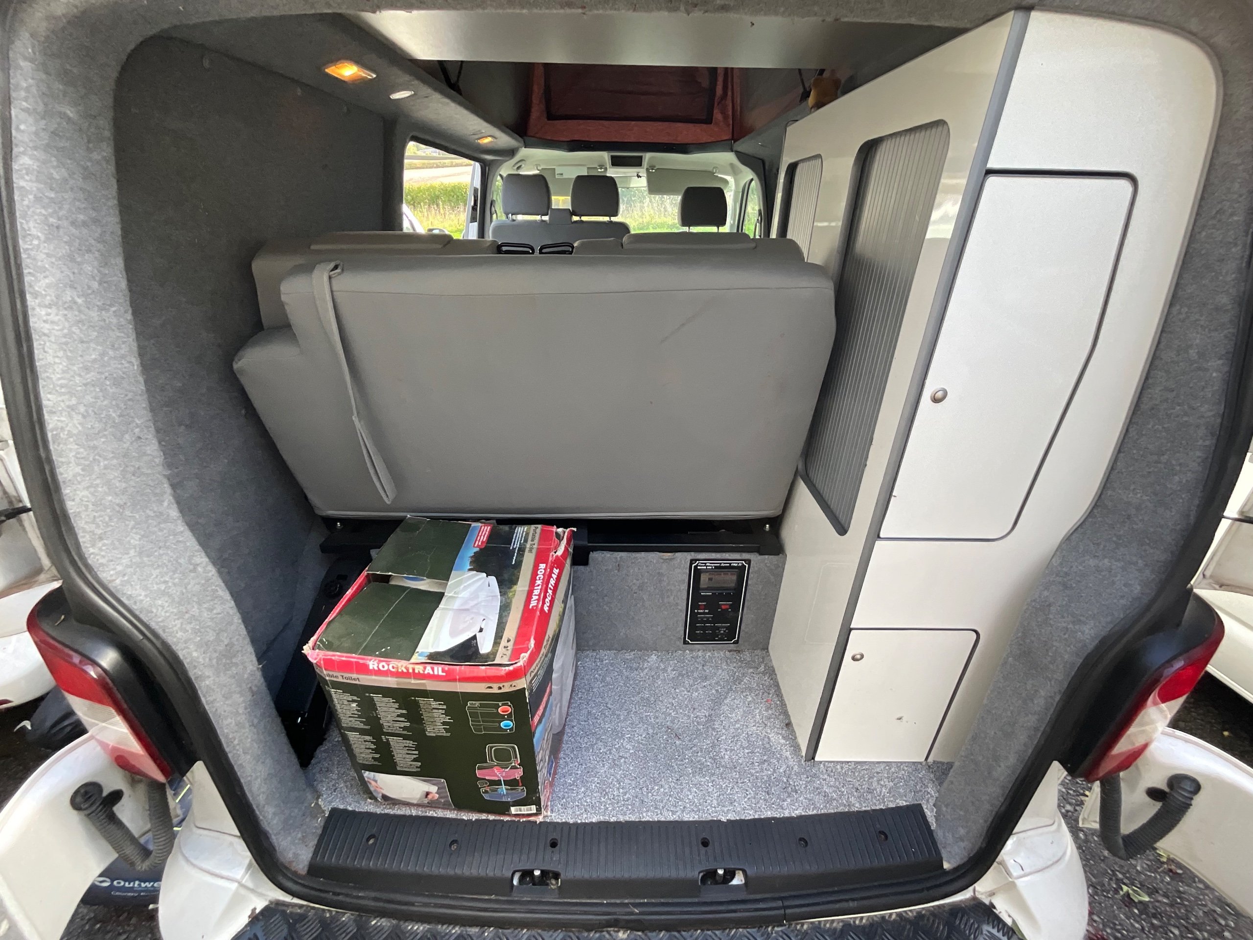 The seats in the back are created out of the crash tested and approved ribbed bed (forming a spacious doubled bed) to have the classic VW layout inside, while still having the all the standard comforts as well as belted seats. The fridge is 12V, with the fridge having a freezer box. There is also a removeable table. A double swivel seat for extending the social space and ease of sleeping upstairs. There is also a domestic double gas hob (working off a camping gas bottle), and a sink with an electrical water pump which is connected to a fresh water tank. There is also 240V hook up. The van has plenty of storage throughout the motorhome as well.