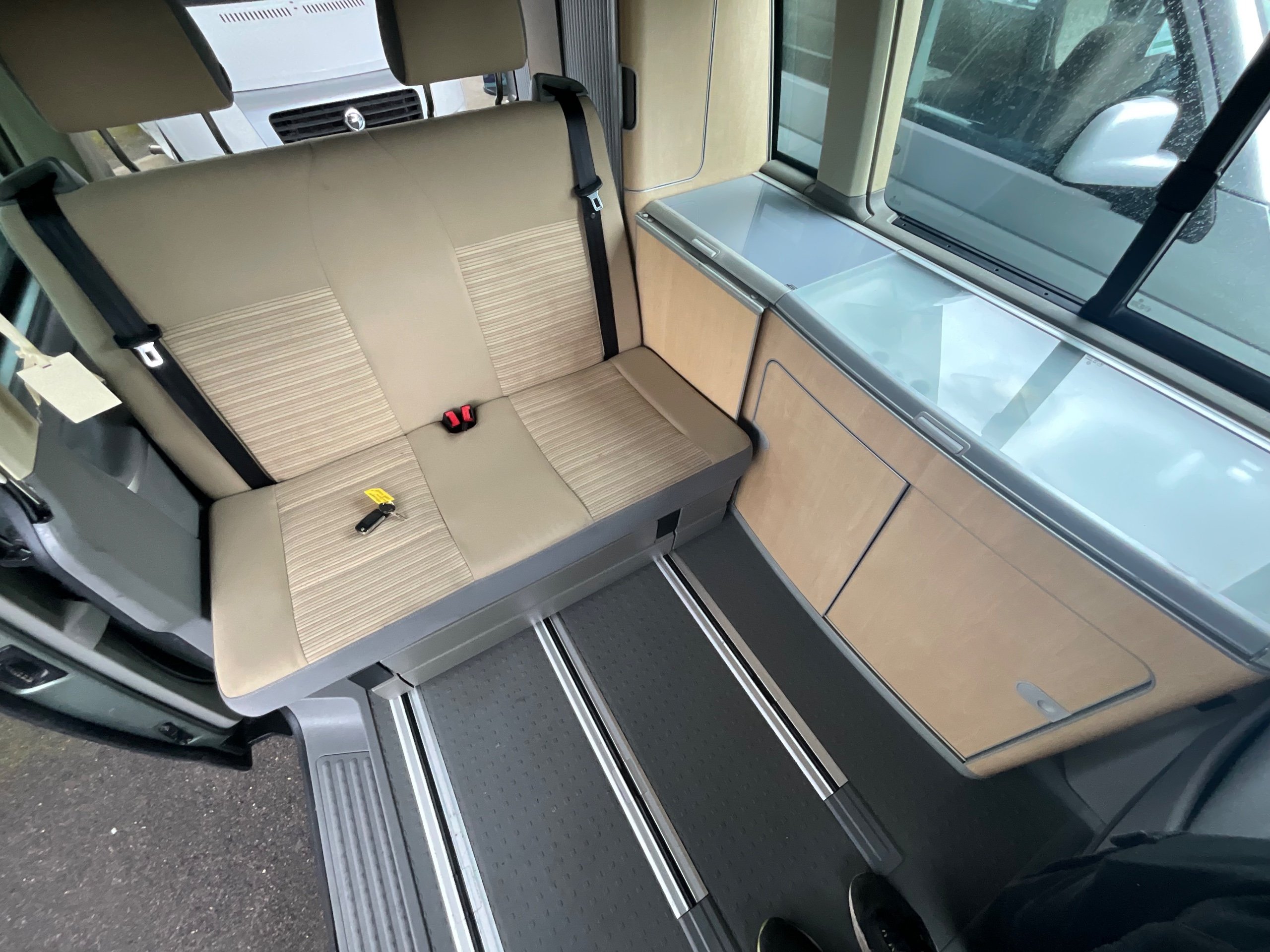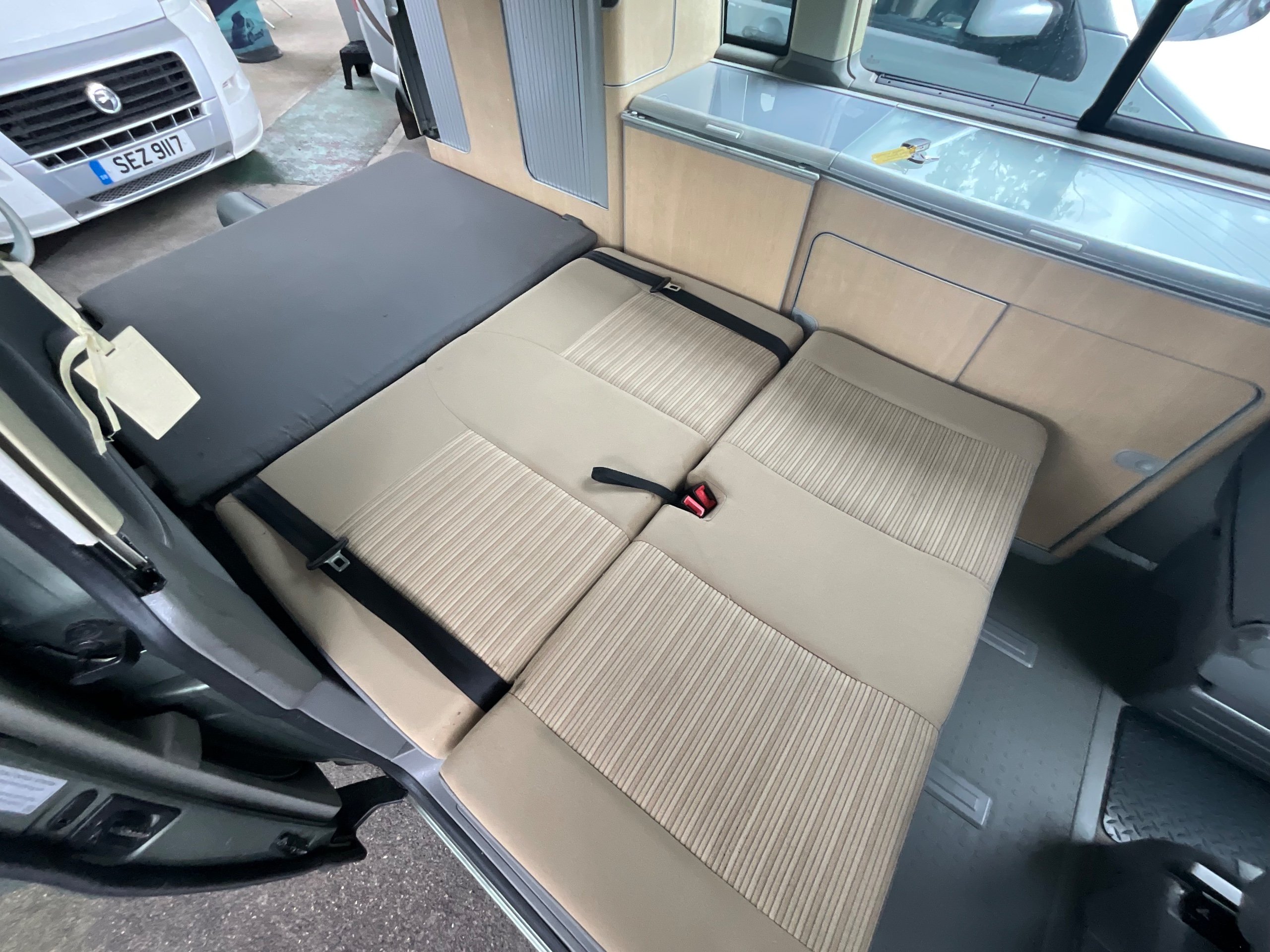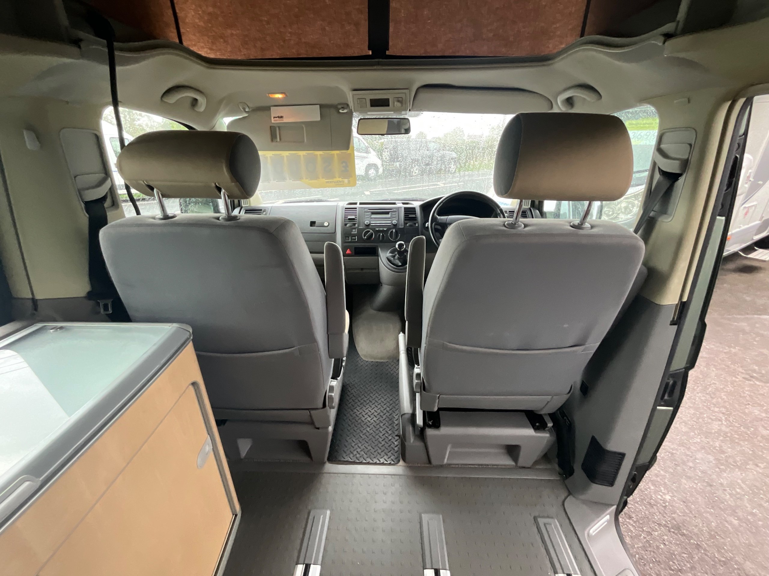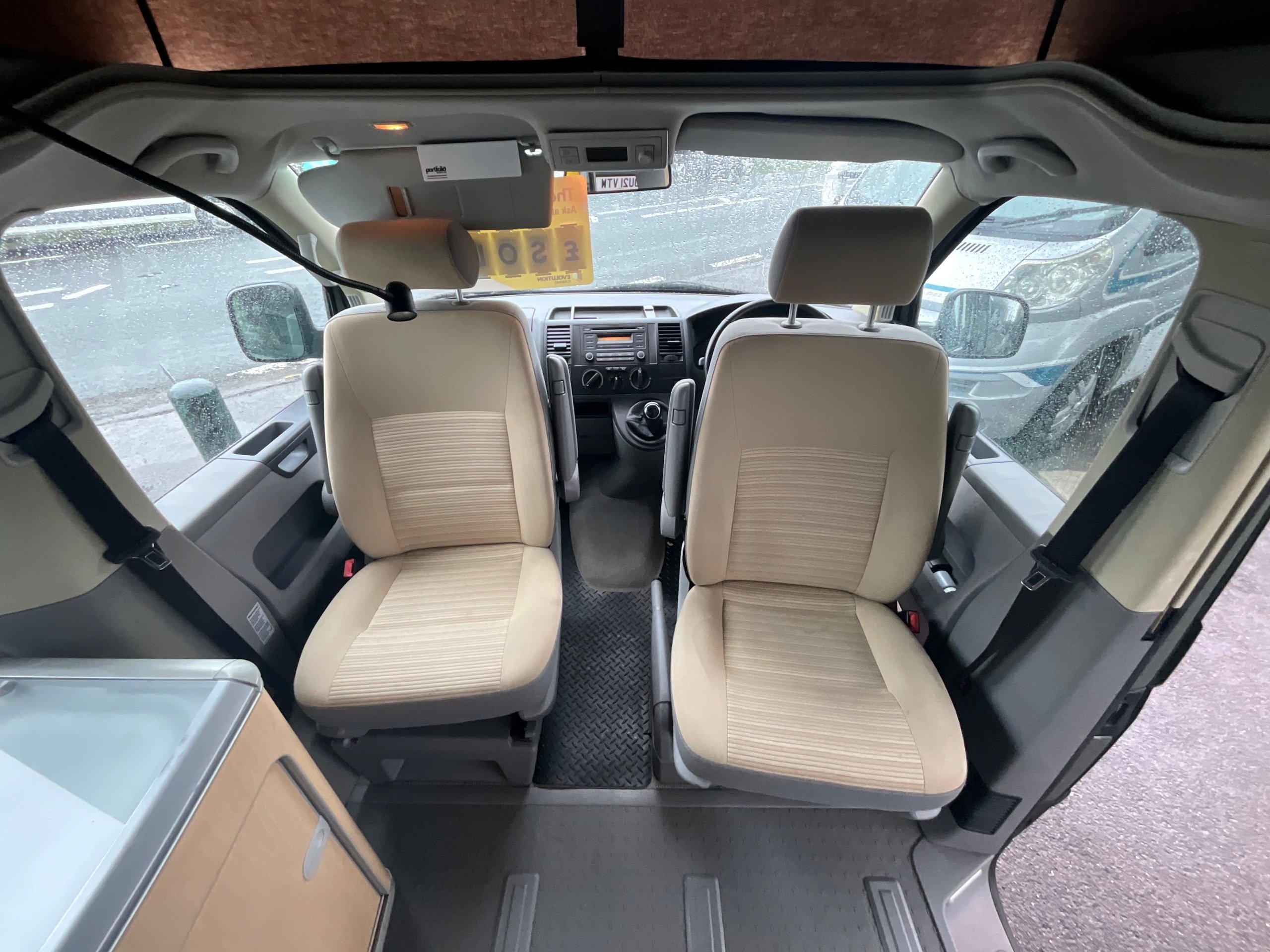 The seats in the back are created out of the crash tested and approved fold out bed (forming a spacious doubled bed) to have the classic VW layout inside, while still having the all the standard comforts as well as belted seats, an added benefit of this bench seat is the capability to slide forwards and backs enhancing the living space or rear space while driving or parked up. There is also the added benefit of both front seats working on a swivel mechanisms to enhance the living area when parked up and make it easier to climb to the bed in the roof.