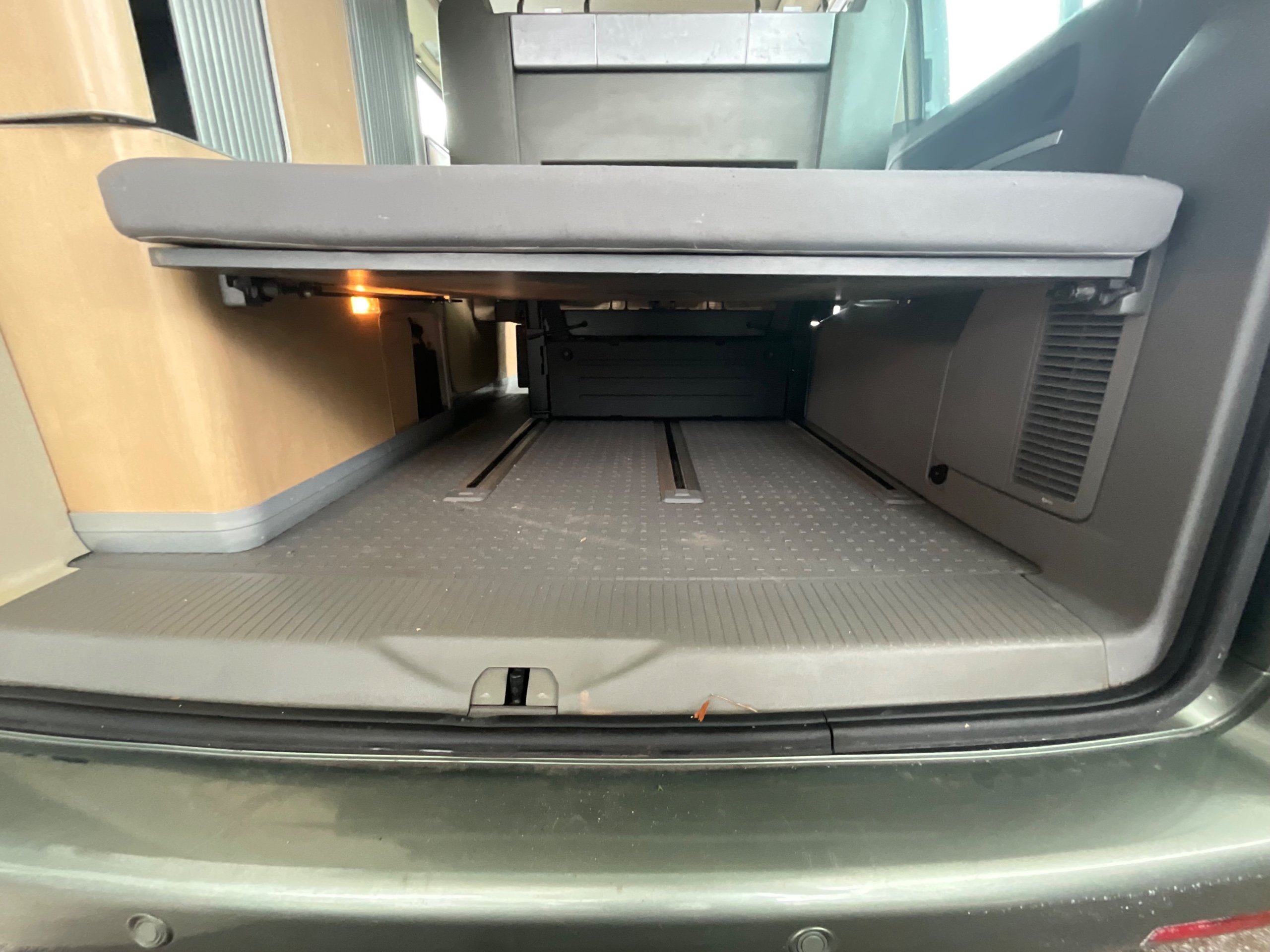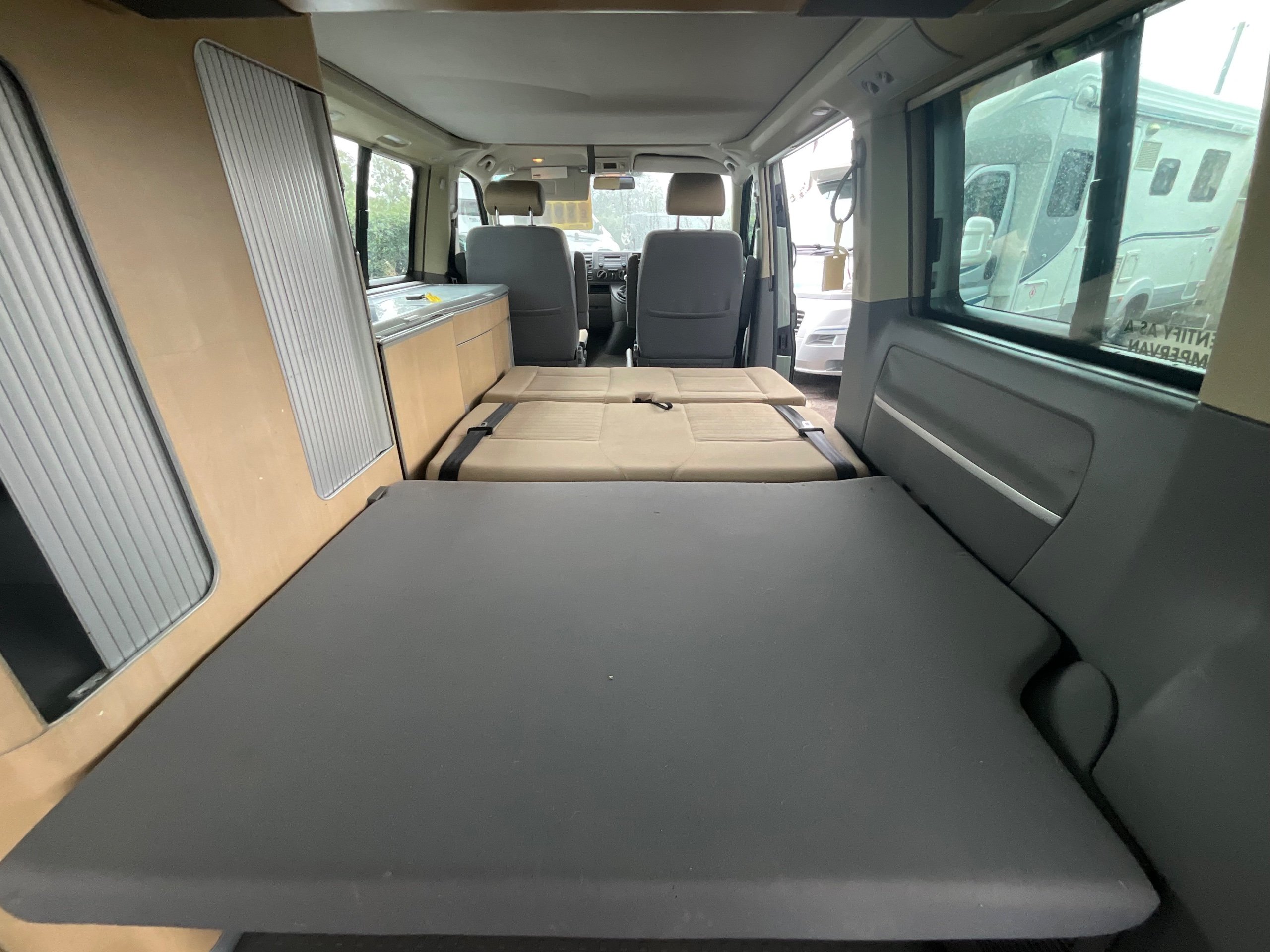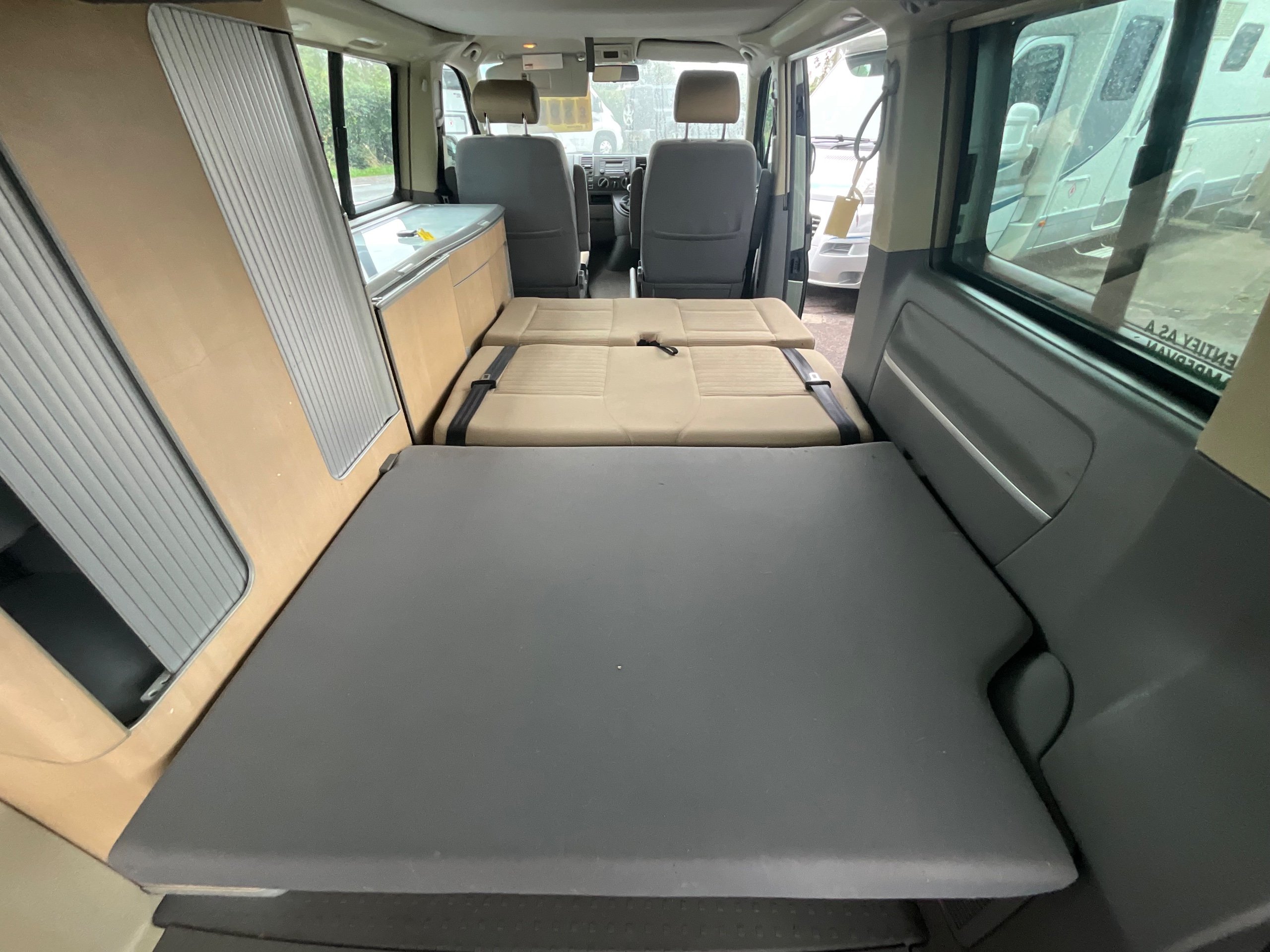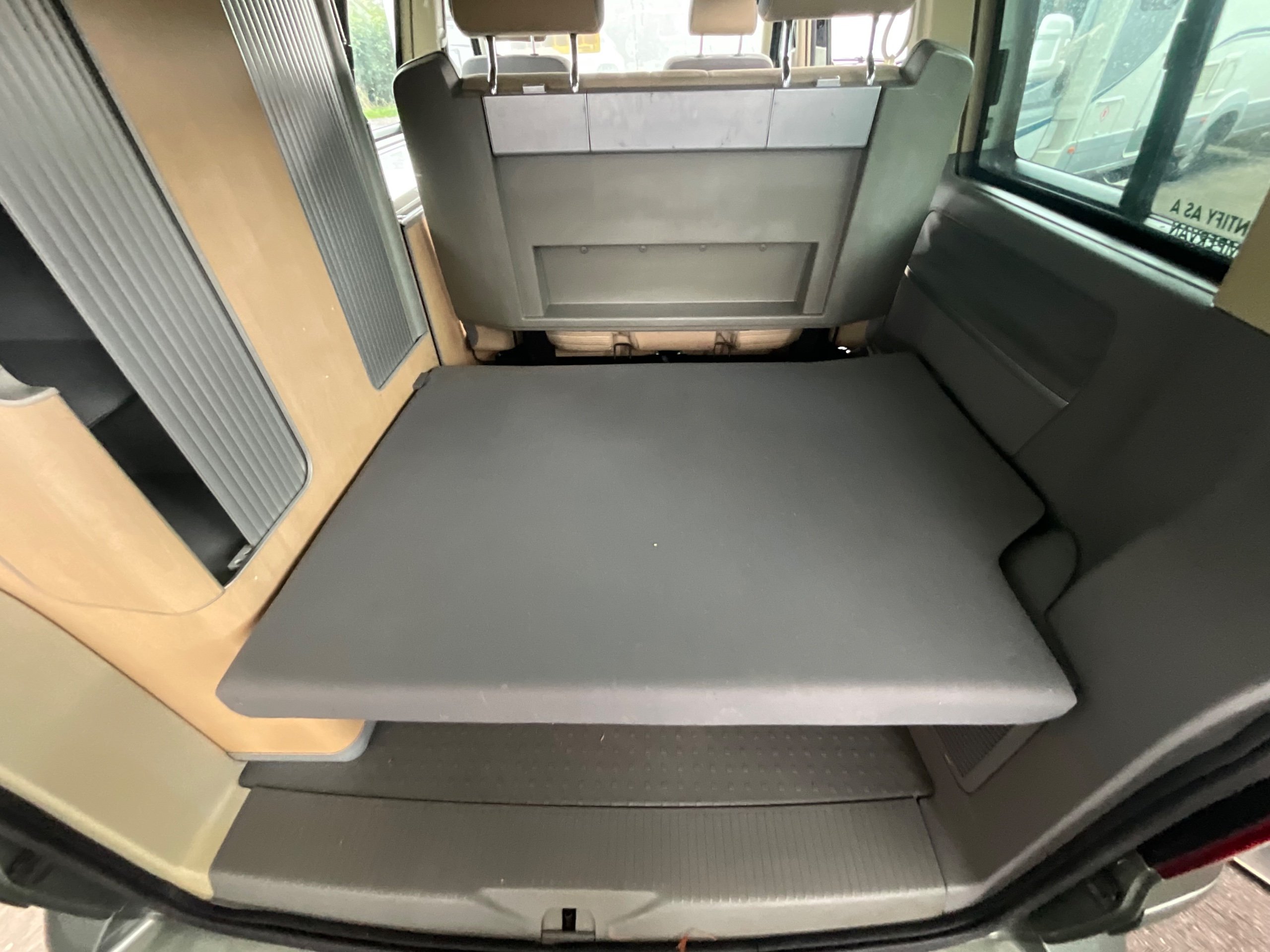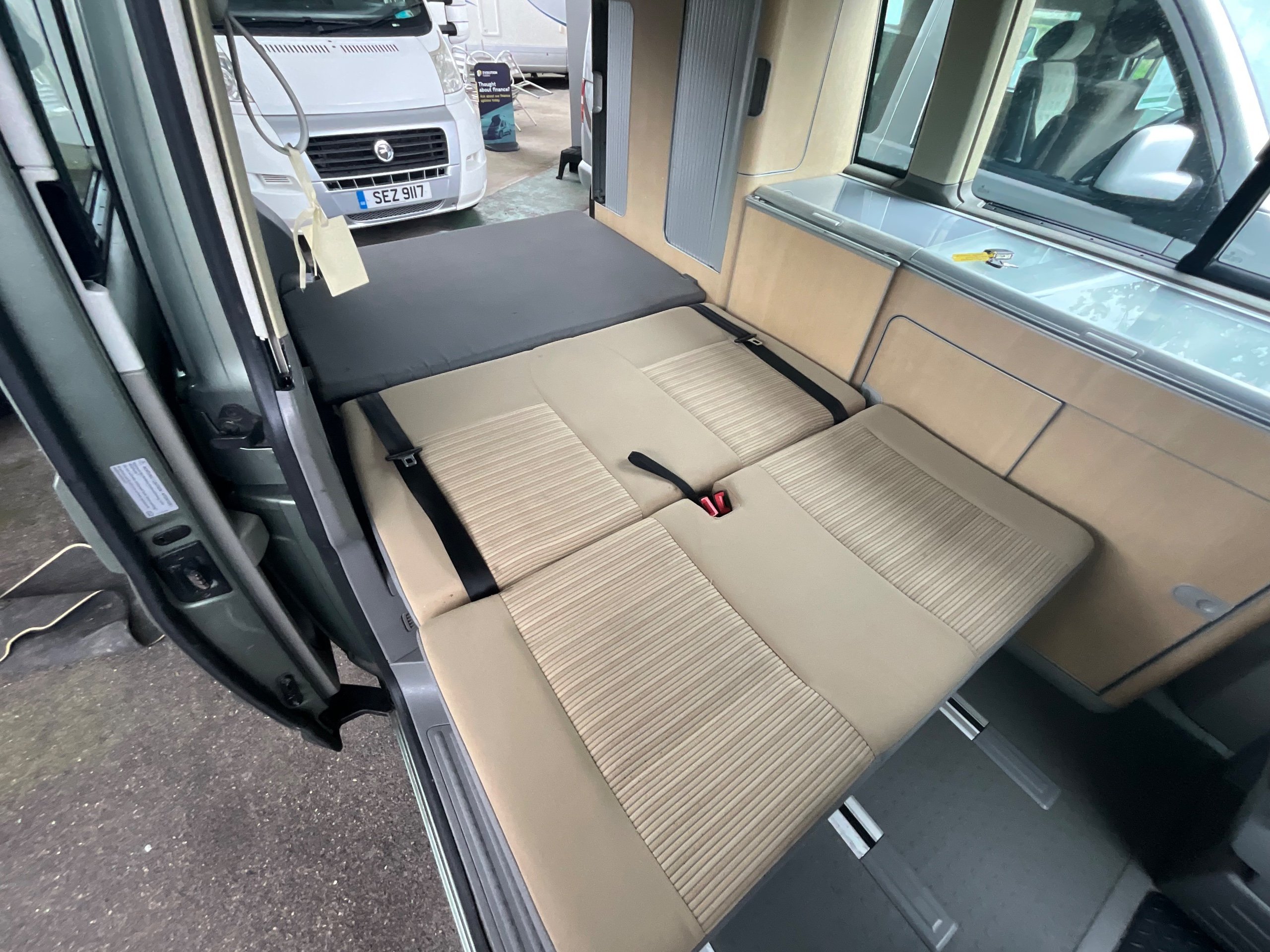 The seats in the back are created out of the crash tested and approved fold out bed (forming a spacious doubled bed) to have the classic VW layout inside, while still having the all the standard comforts as well as belted seats, an added benefit of this bench seat is the capability to slide forwards and backs enhancing the living space or rear space while driving or parked up. There is also the added benefit of both front seats working on a swivel mechanisms to enhance the living area when parked up and make it easier to climb to the bed in the roof.