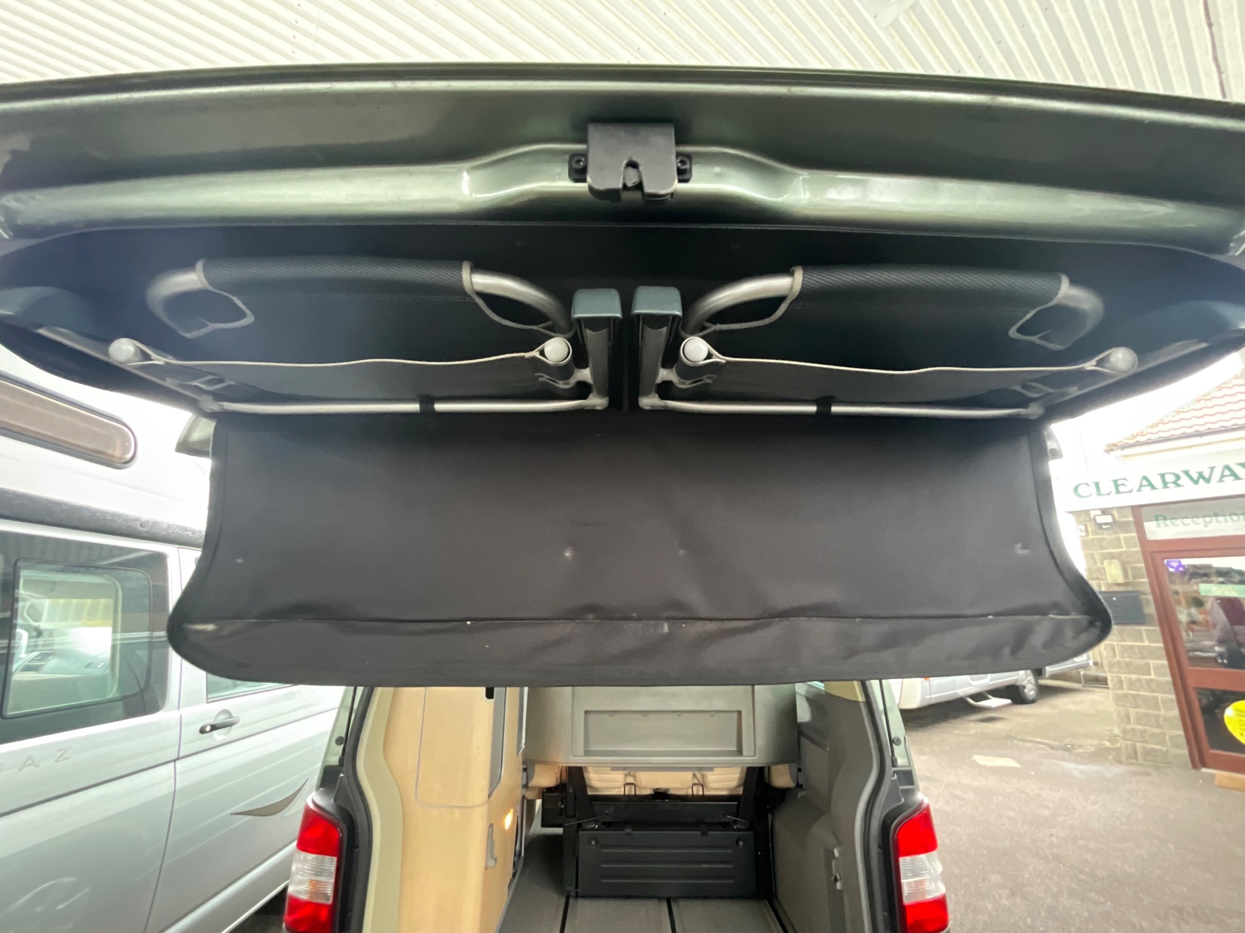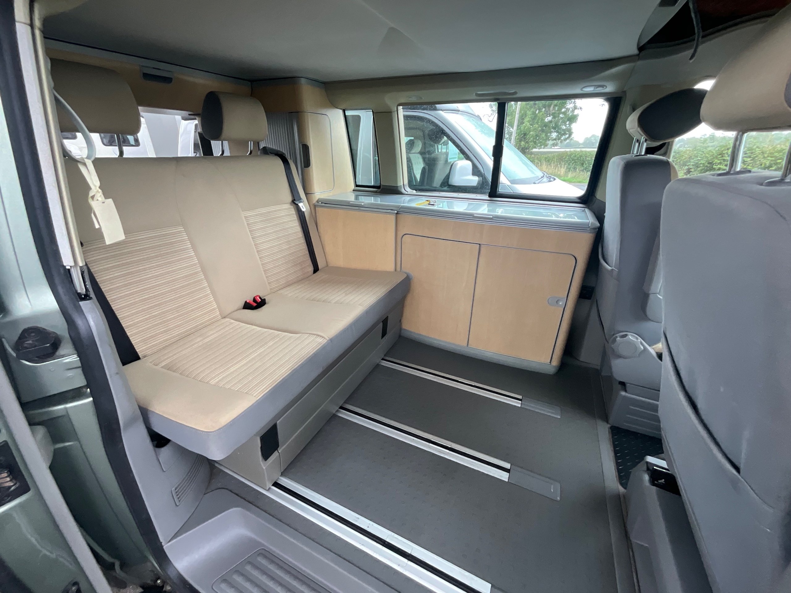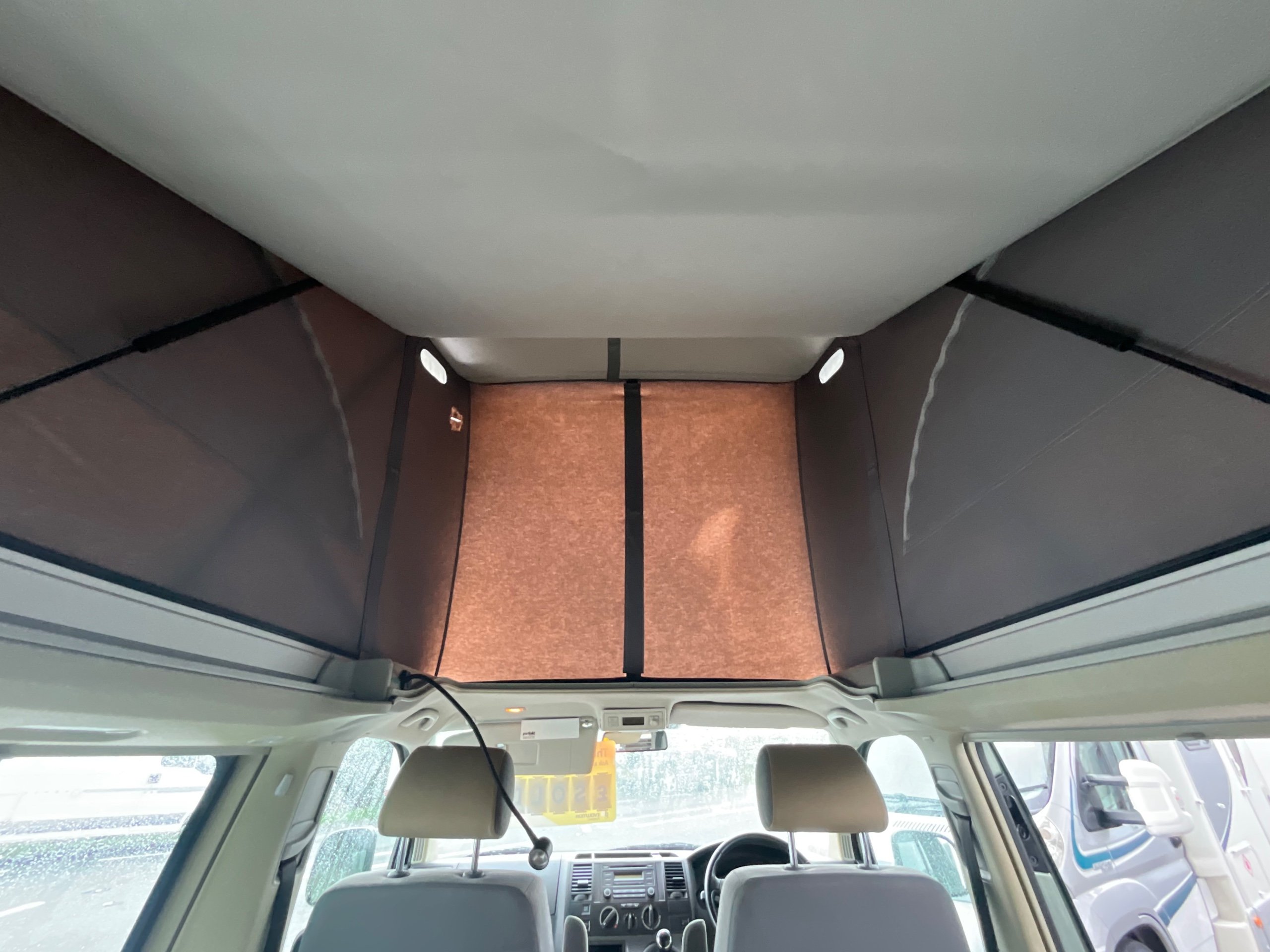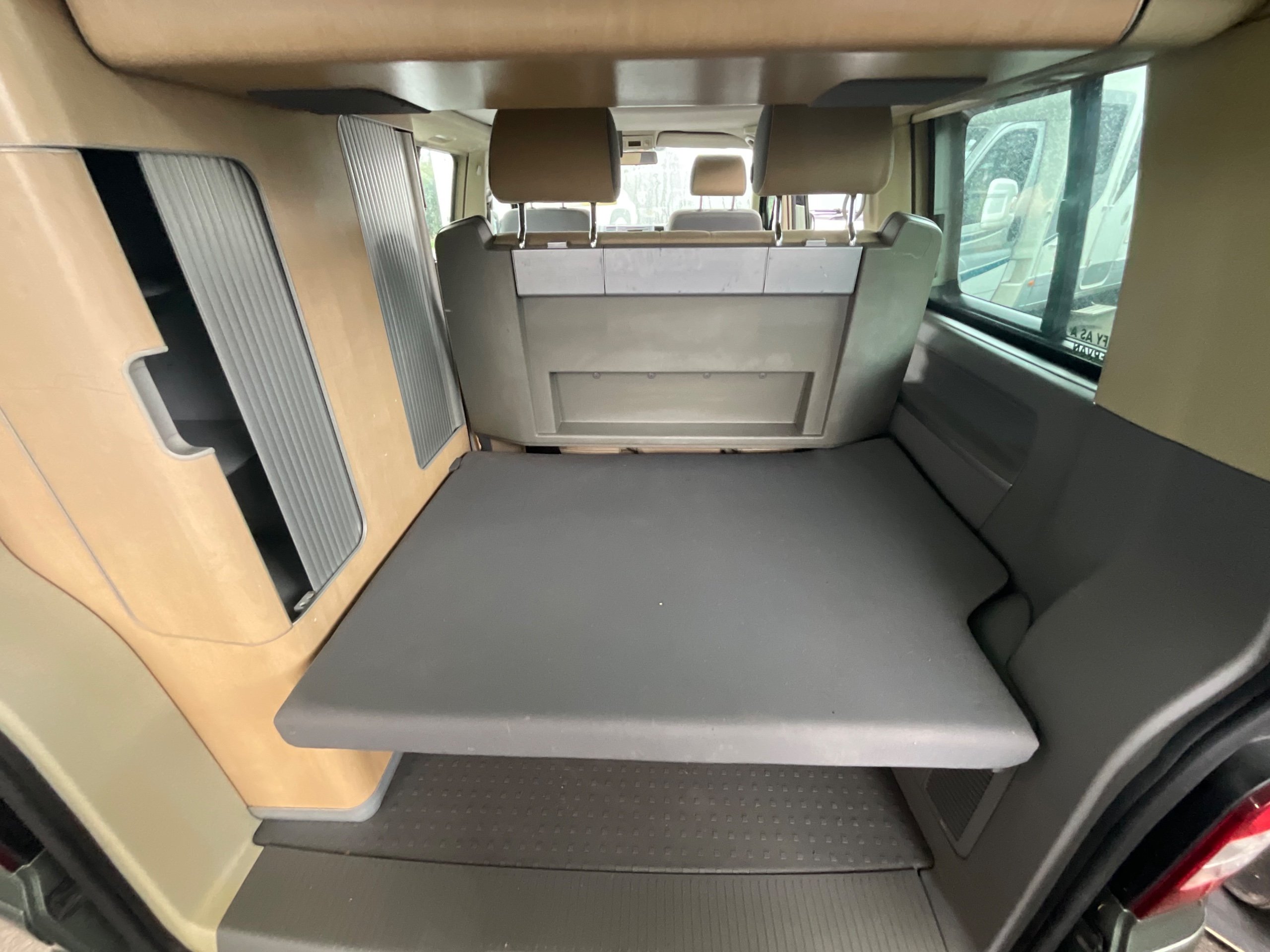 The seats in the back are created out of the crash tested and approved fold out bed (forming a spacious doubled bed) to have the classic VW layout inside, while still having the all the standard comforts as well as belted seats, an added benefit of this bench seat is the capability to slide forwards and backs enhancing the living space or rear space while driving or parked up. There is also the added benefit of both front seats working on a swivel mechanisms to enhance the living area when parked up and make it easier to climb to the bed in the roof.