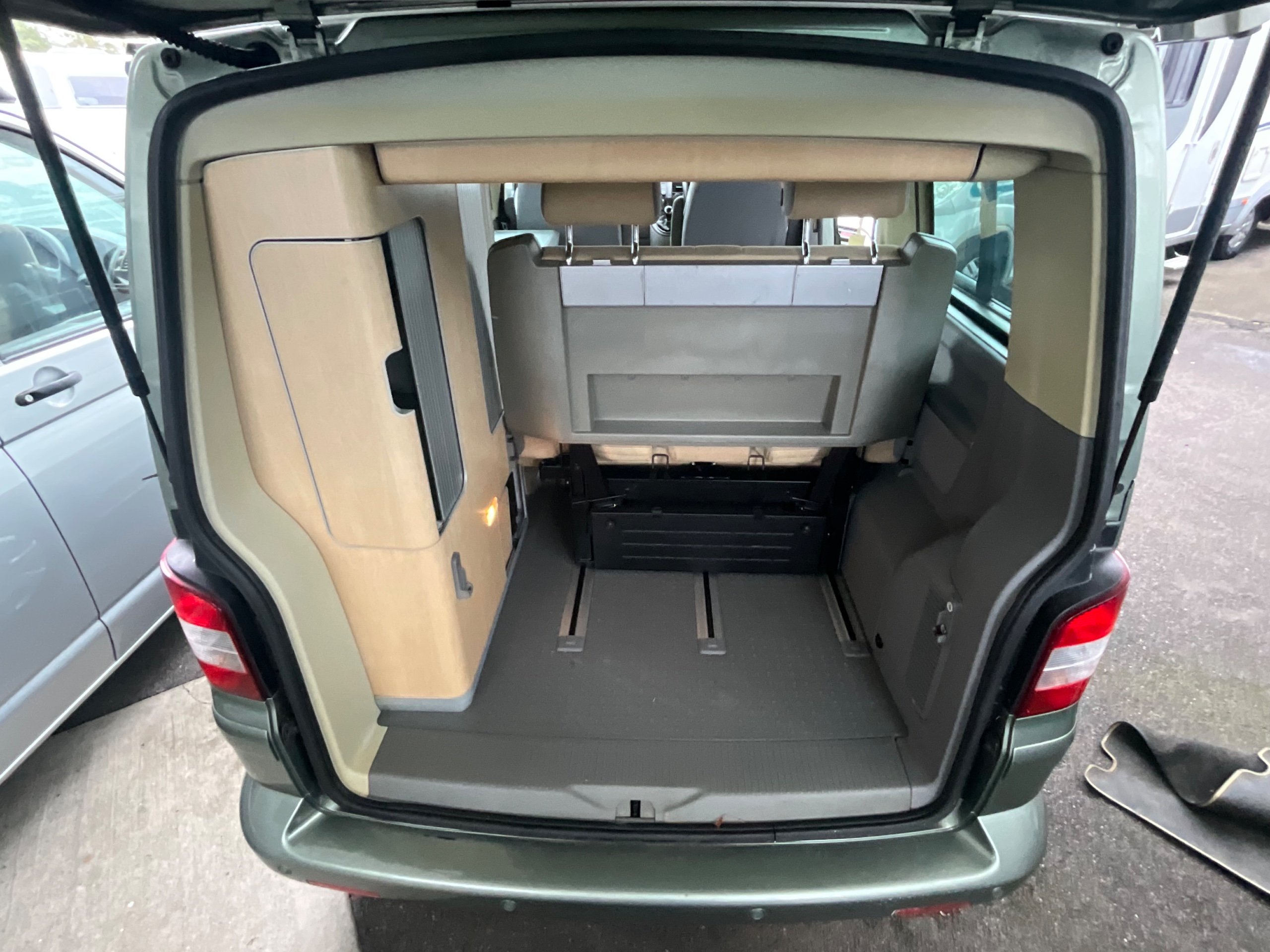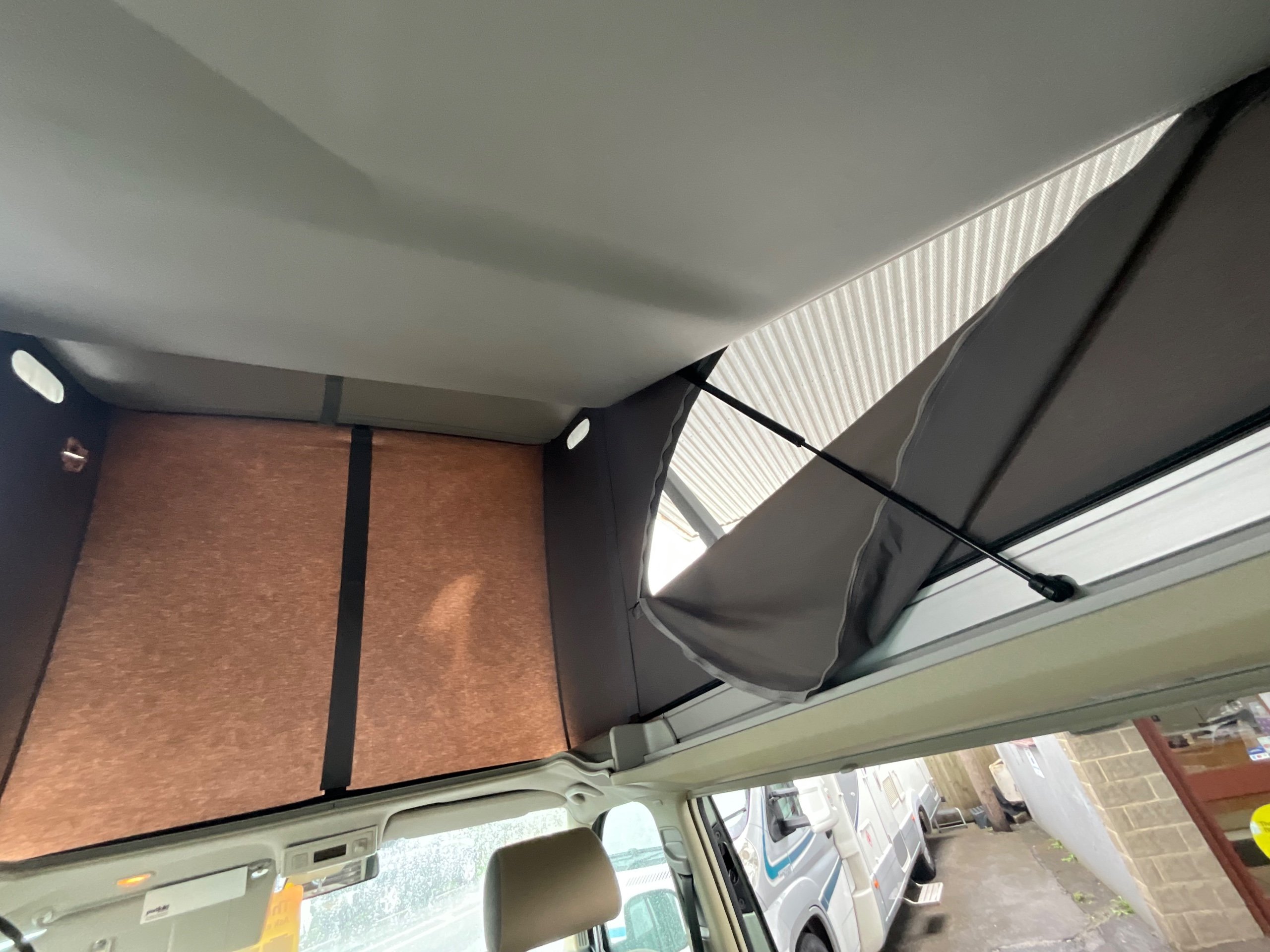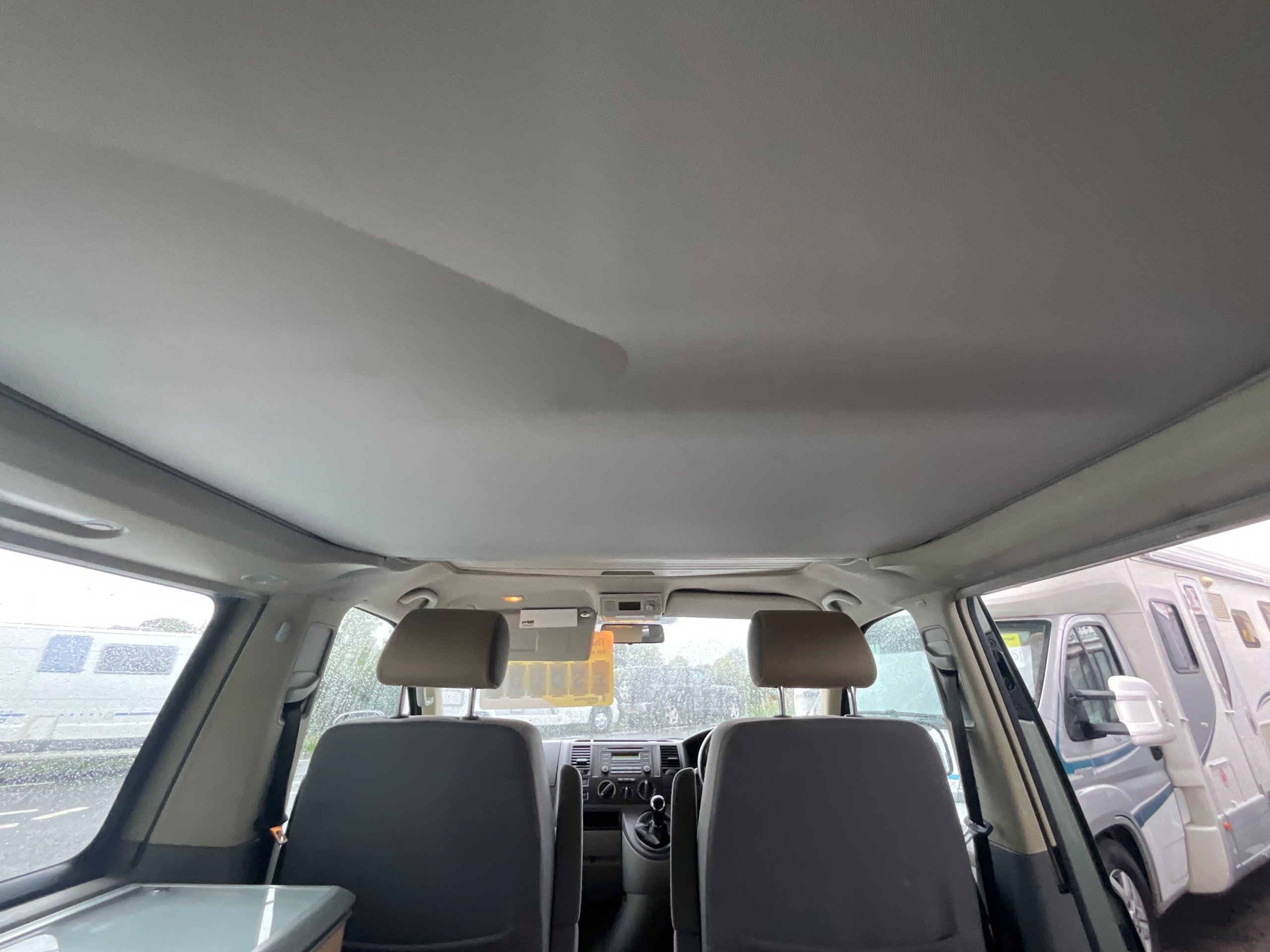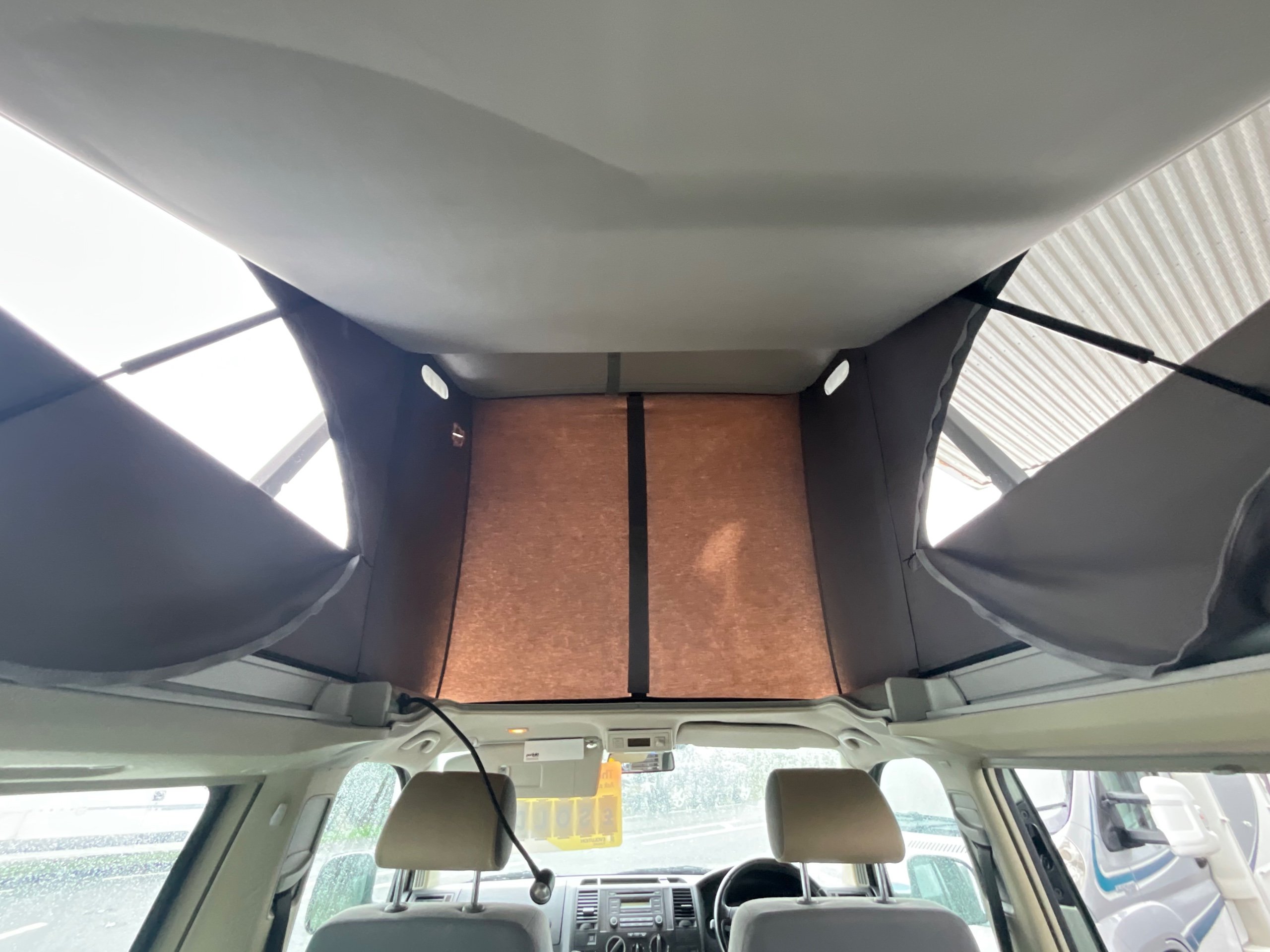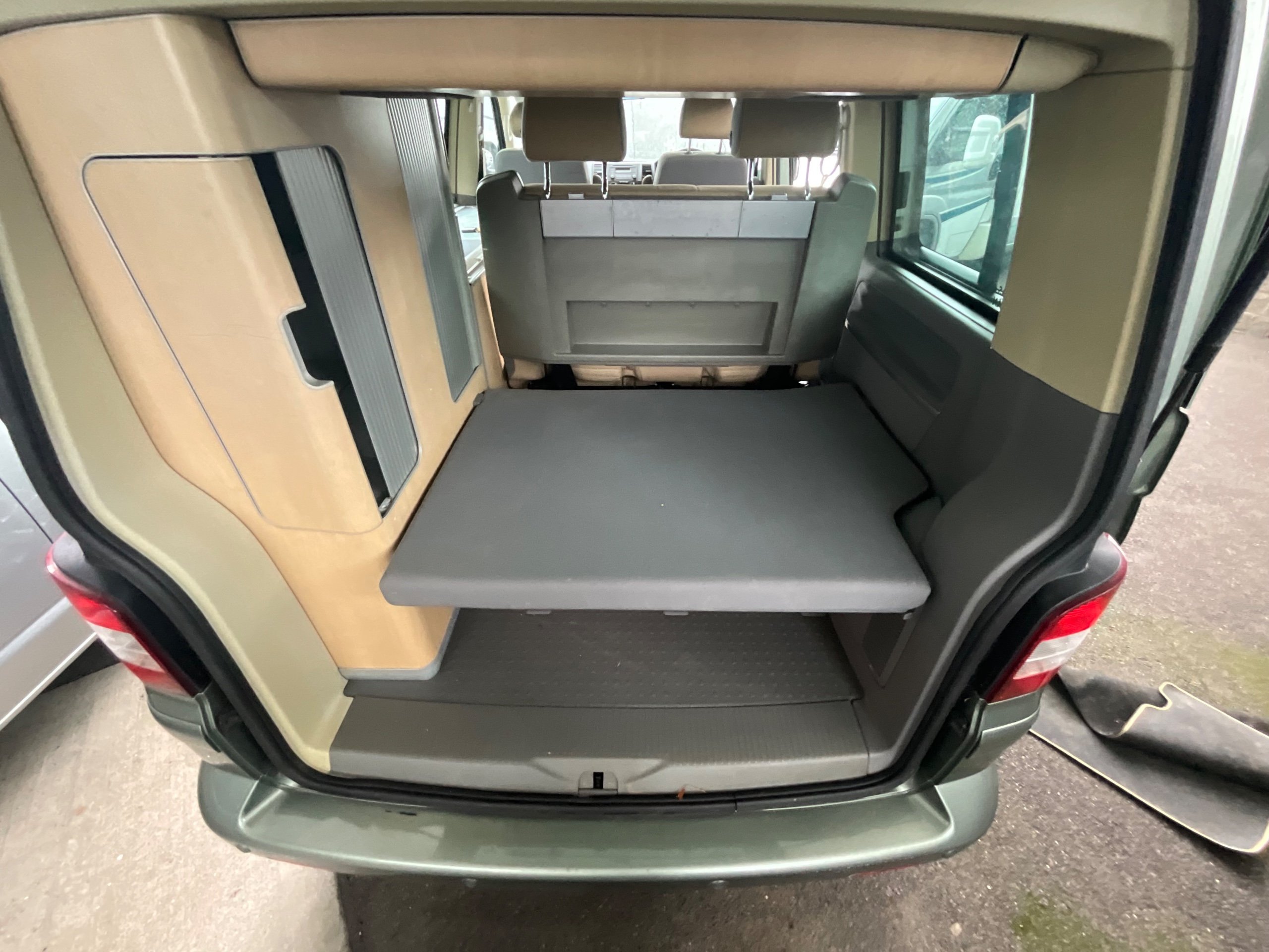 The seats in the back are created out of the crash tested and approved fold out bed (forming a spacious doubled bed) to have the classic VW layout inside, while still having the all the standard comforts as well as belted seats, an added benefit of this bench seat is the capability to slide forwards and backs enhancing the living space or rear space while driving or parked up. There is also the added benefit of both front seats working on a swivel mechanisms to enhance the living area when parked up and make it easier to climb to the bed in the roof.