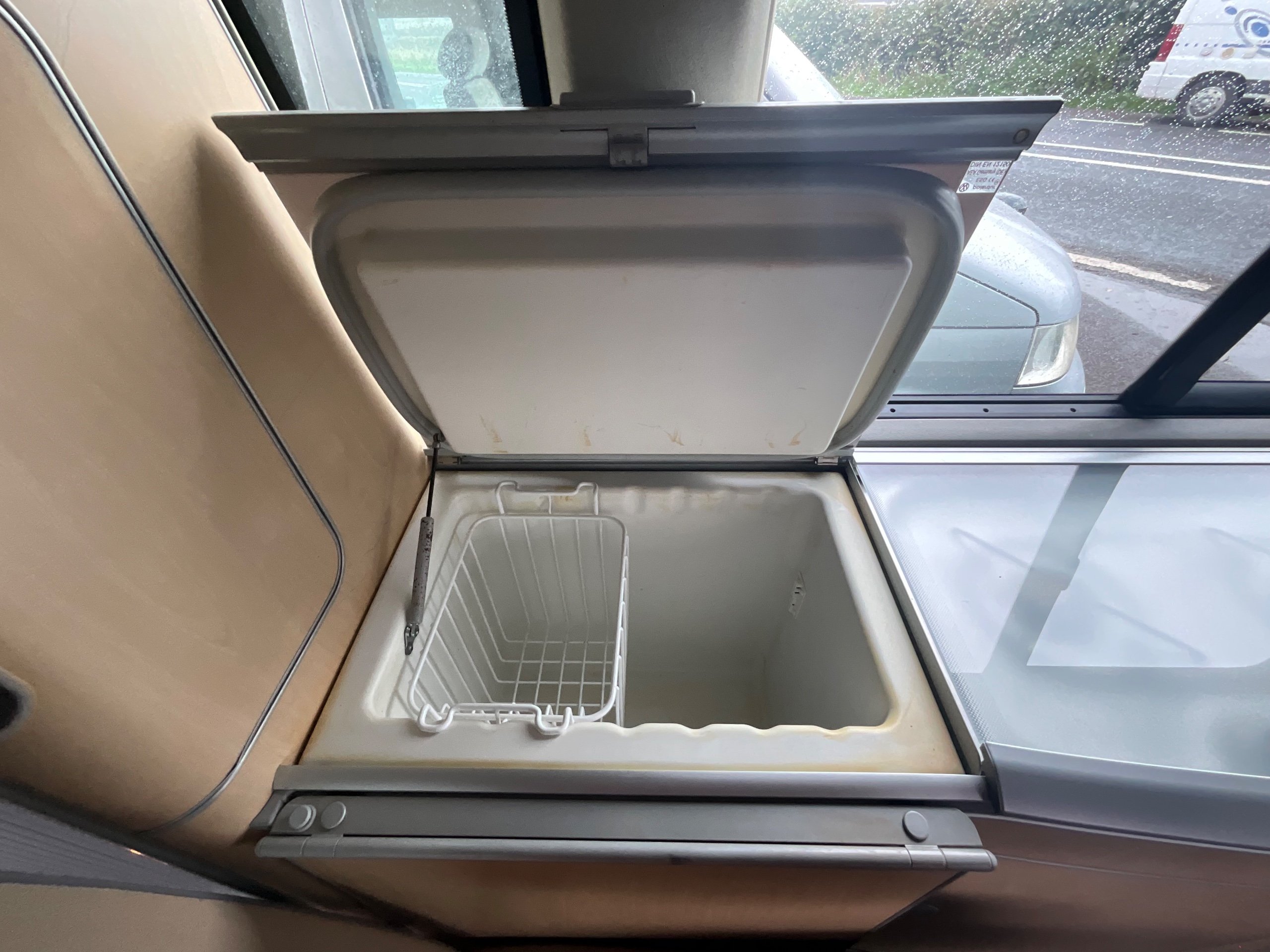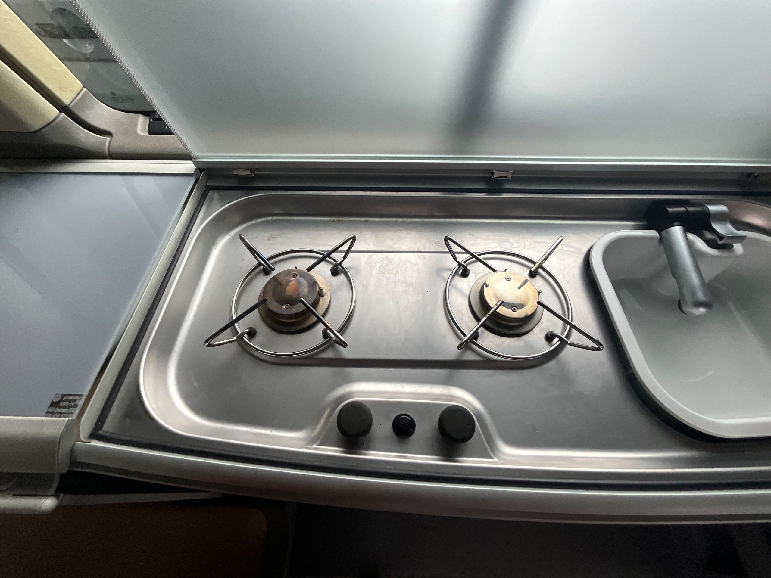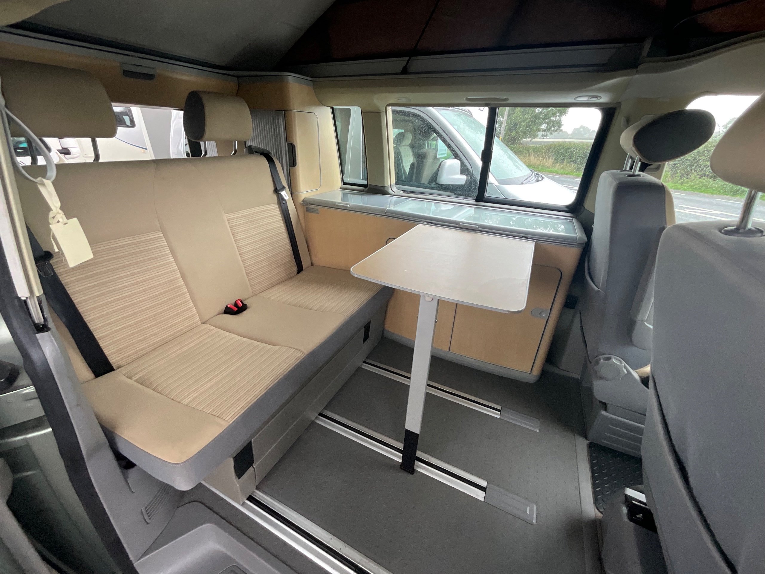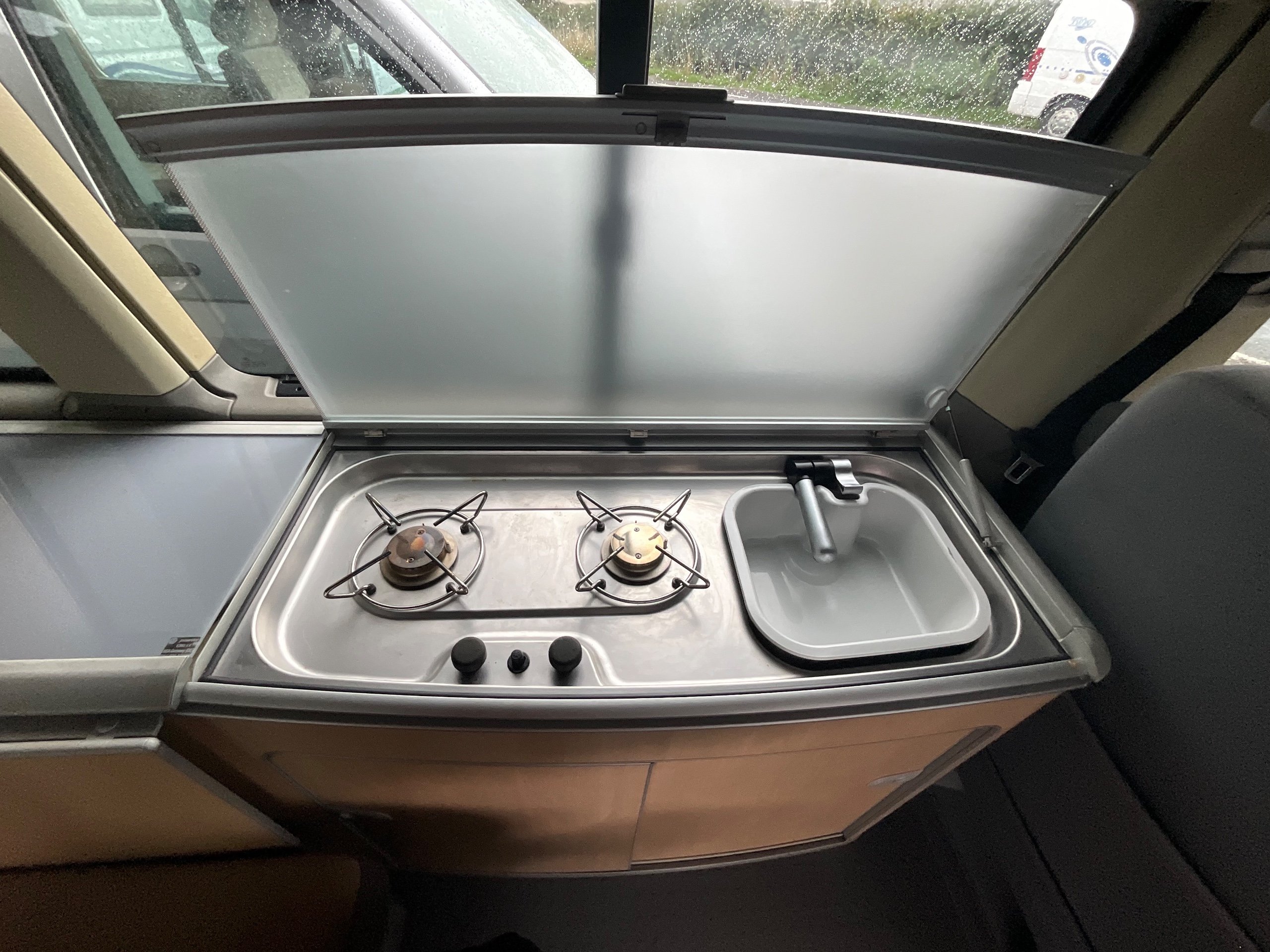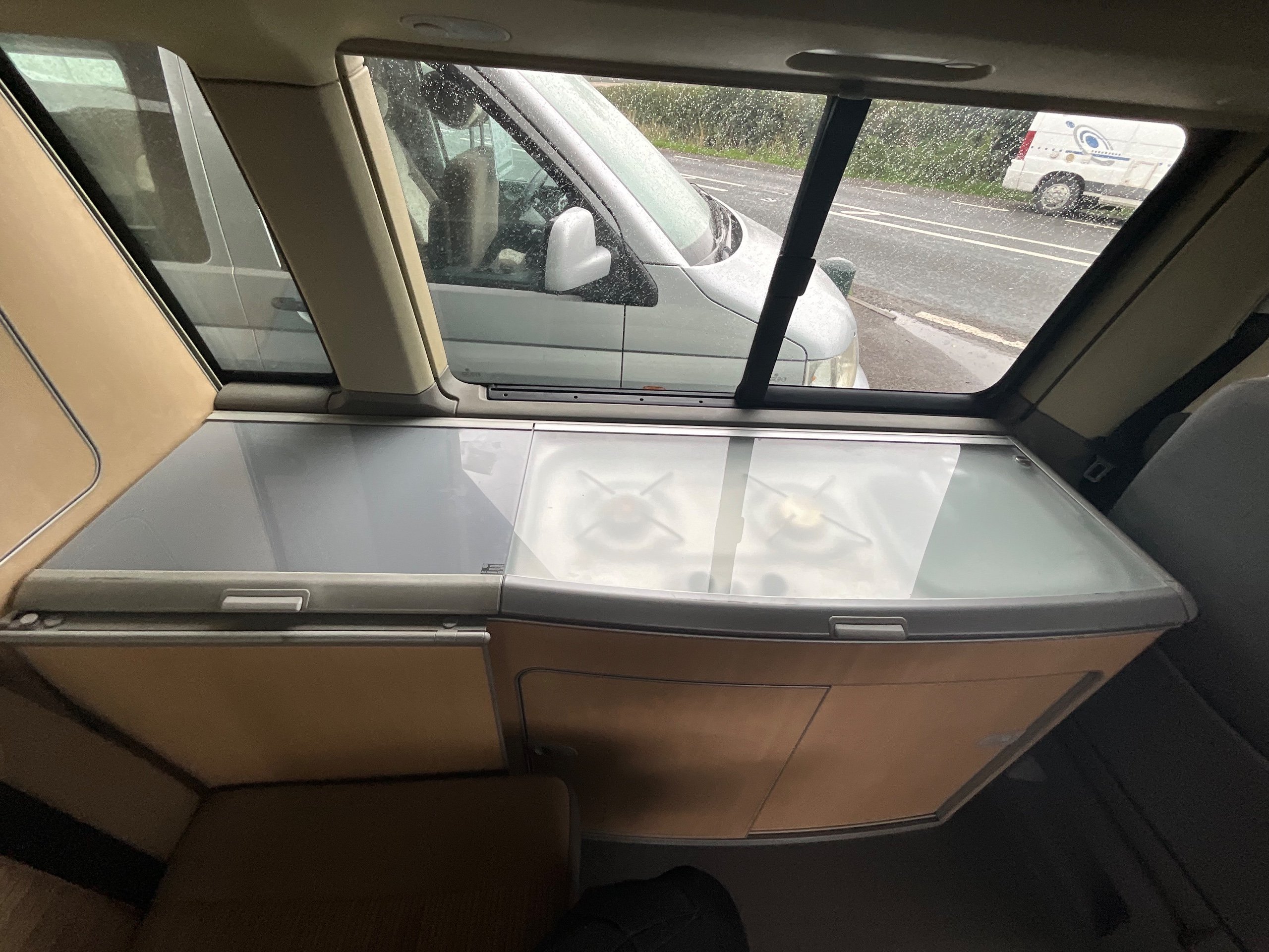 The fridge is 12V, with the fridge having a freezer box. There is also a fixed sliding table. There is also a domestic double gas hob (working off a gas bottle) and a sink which the water pump is electrical which is connected to a fresh water tank with a waste tank as well. The VW has plenty of storage.