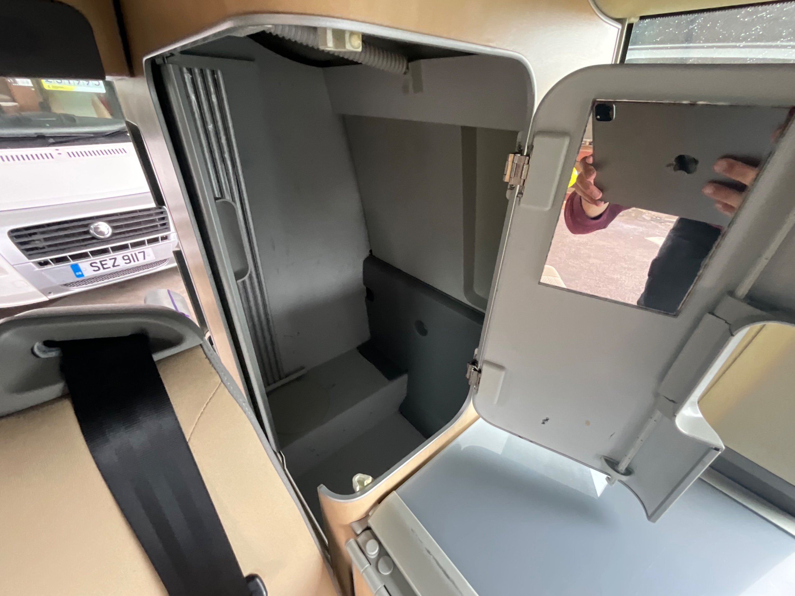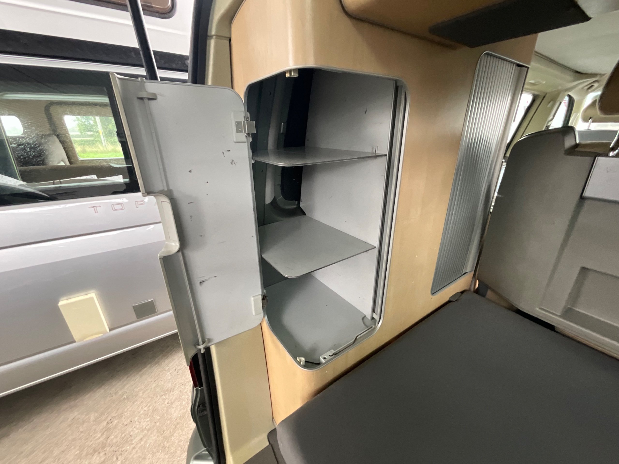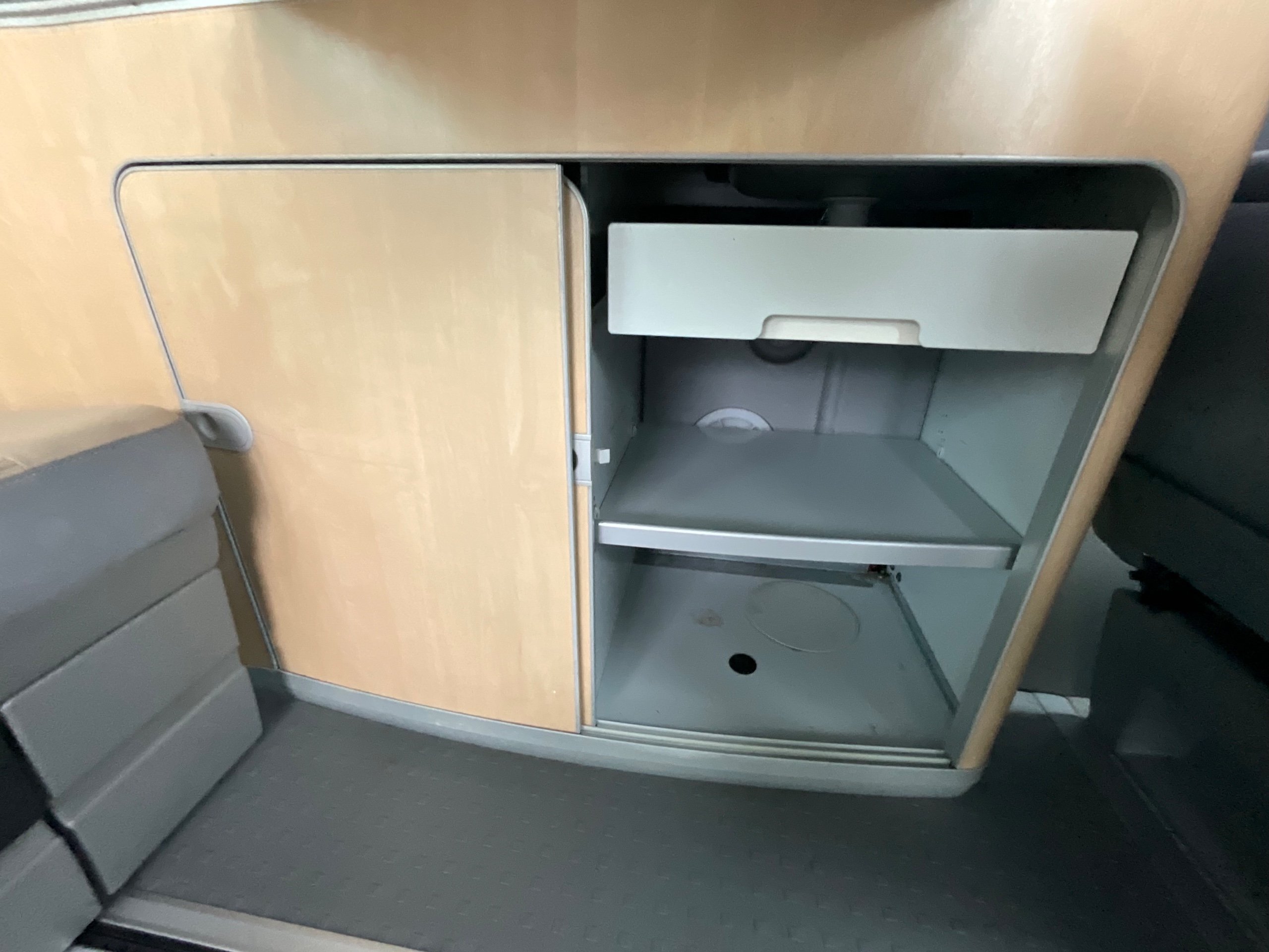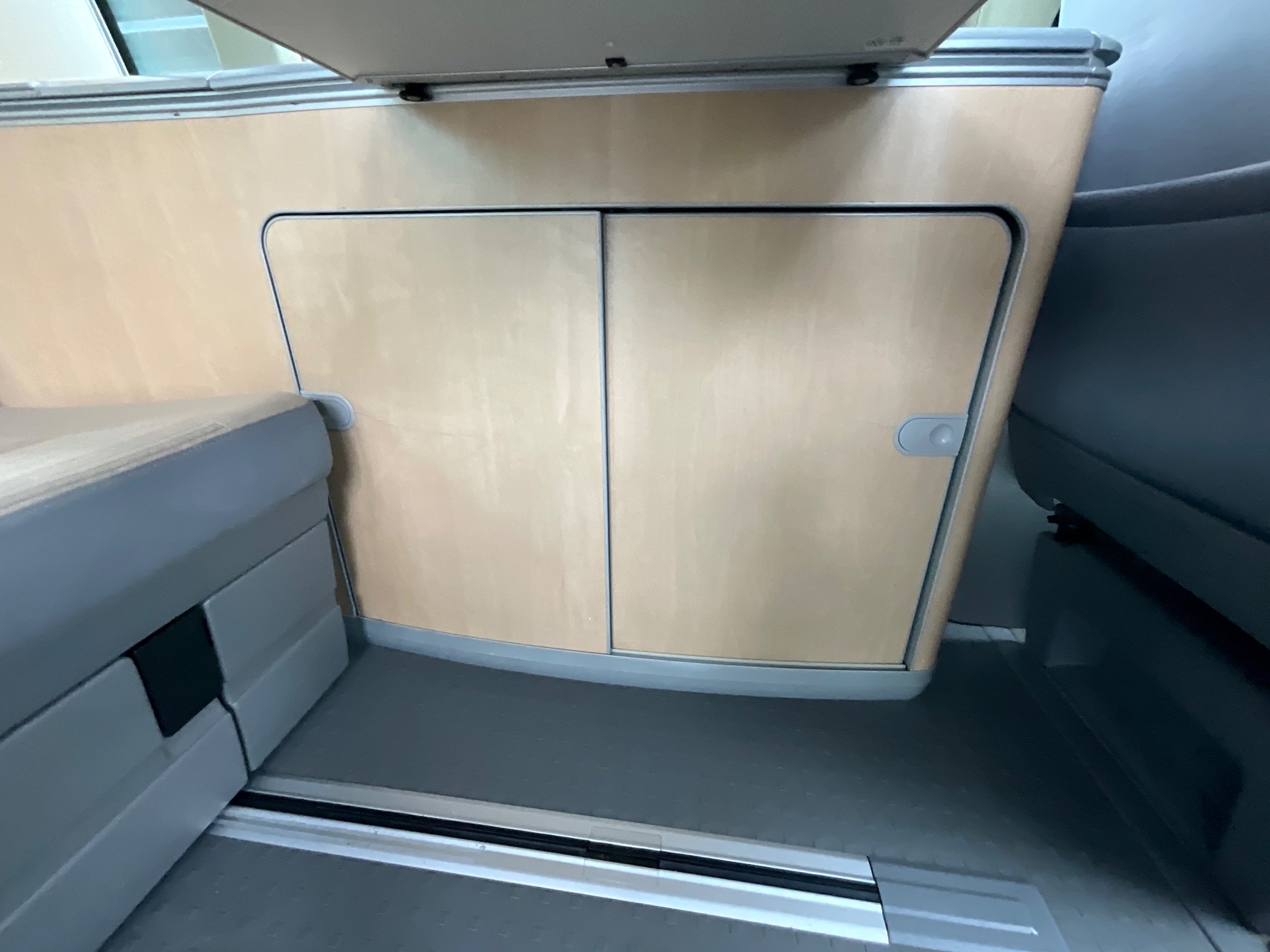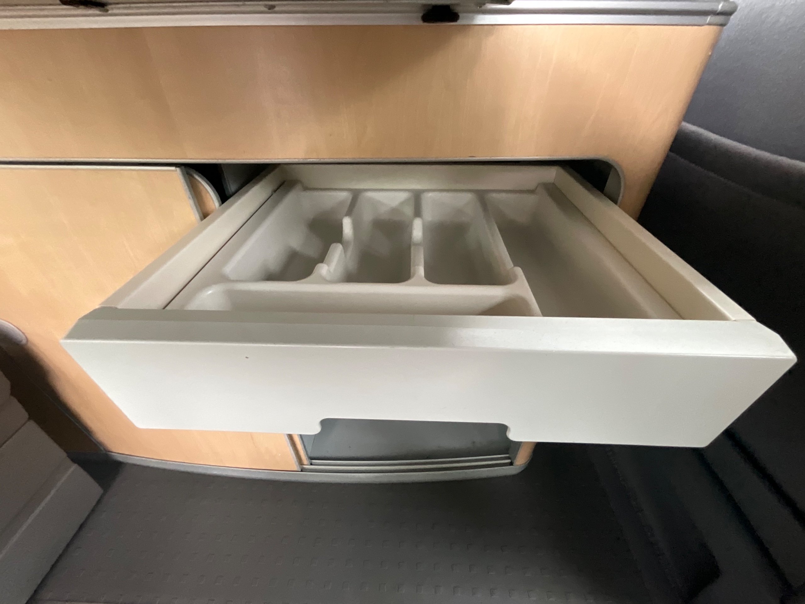 The fridge is 12V, with the fridge having a freezer box. There is also a fixed sliding table. There is also a domestic double gas hob (working off a gas bottle) and a sink which the water pump is electrical which is connected to a fresh water tank with a waste tank as well. The VW has plenty of storage.